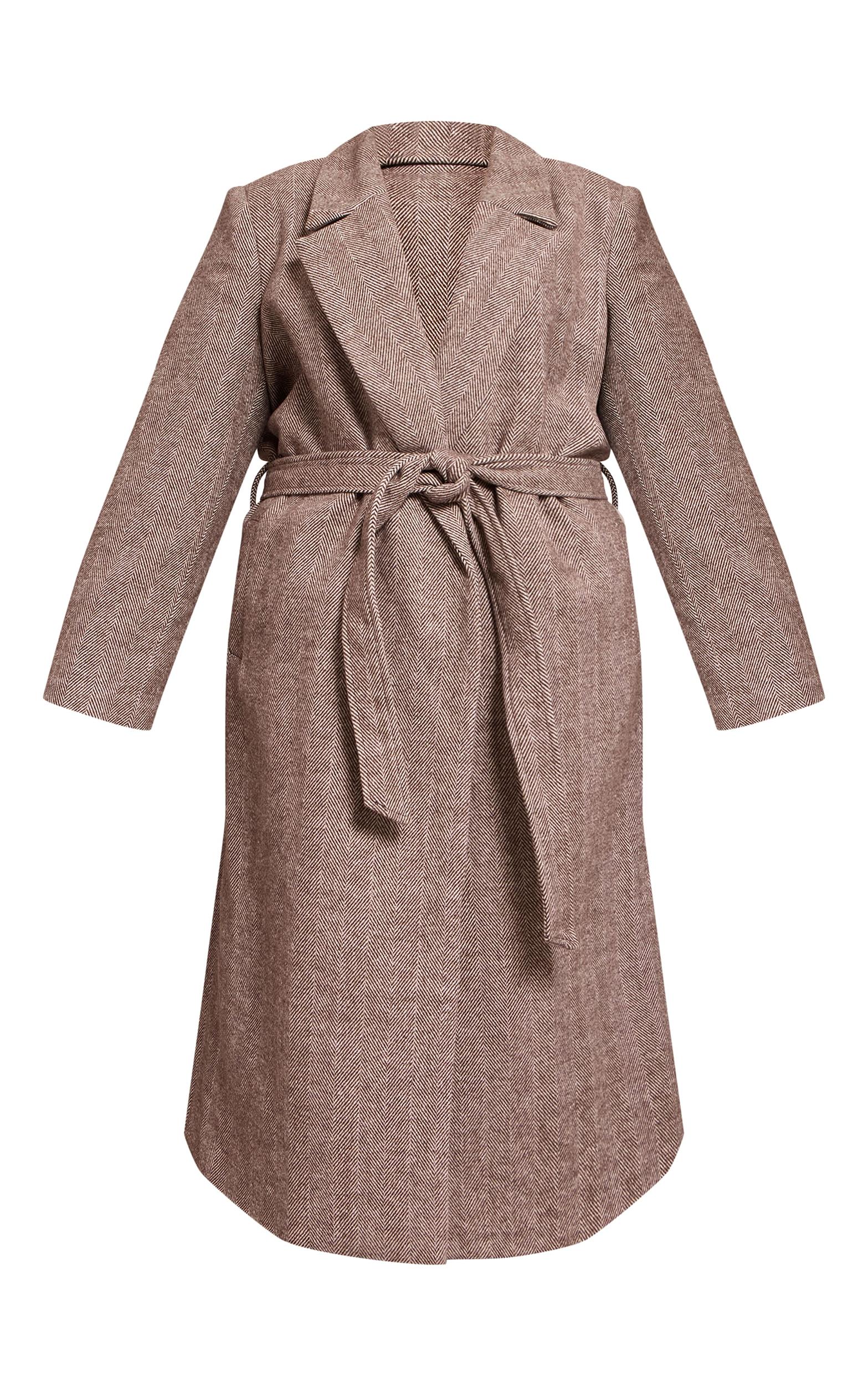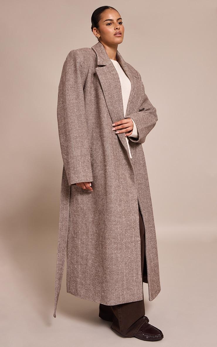 Wrap up in style with the plus brown herringbone tie waist maxi coat. Made from woven herringbone fabric in a warm brown tone, this coat features a tie waist and tailored shape for a refined finish. Layer over a knit dress and boots for effortless sophistication.Length approx 139.5cm/55inch (Based on sample size XL)Model wears size XLModel Height - 5ft 9inchp]:!mb-4inch>Category: OuterwearProduct type: Wool Look CoatColor: BrownMaterial: Faux WoolOccasion: Day