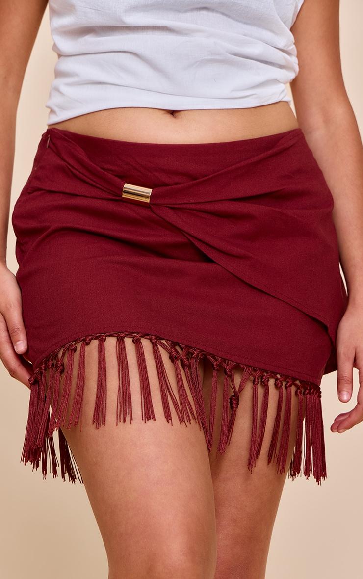 Take your outfit to the next level with this plus chocolate linen gold trim tassle hem mini skirt. Designed in a chocolate linen material with luxe gold trim and a tassel hem. Pair with a crop top and sandals for effortless glam.Length approx 38cm/15inch (Based on sample size US 12)Model wears size UK 16/ EU 44/ AUS 16/ US 12Model Height - 5ft 9inchp]:!mb-4inch>Brand: PrettyLittleThingCategory: BottomsProduct type: Mini SkirtColor: BurgundyMaterial: Faux LinenOccasion: Day