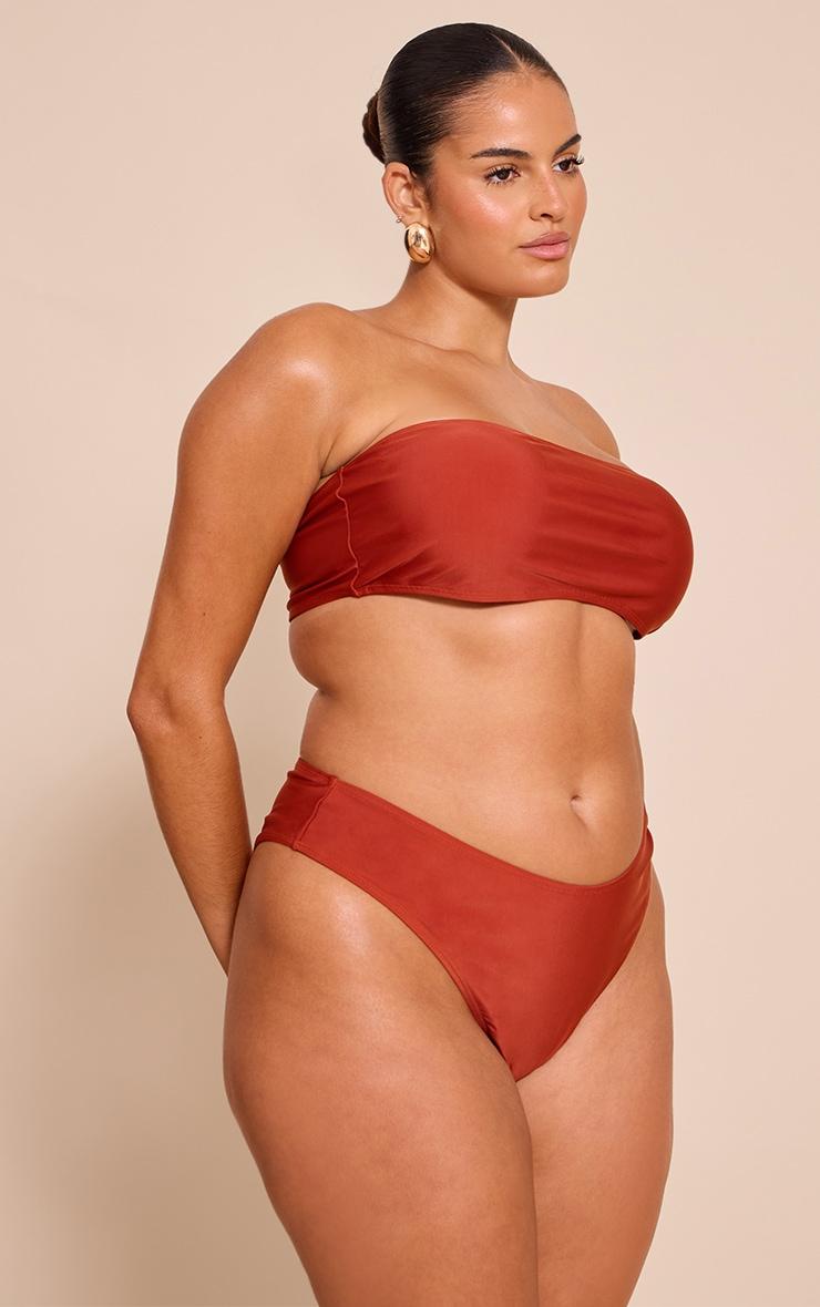 The plus chocolate mix & match high waisted high leg bikini bottoms offer flattering support and a sleek silhouette. With a high-rise fit and high-cut leg, they elongate the legs while providing curve-conscious coverage. Style with the coordinating bandeau top or mix with prints for summer versatility.Length approx 33cm/13inch (Based on sample size US 12)Model wears size UK 16/ EU 44/ AUS 16/ US 12Model Height - 5ft 9inchp]:!mb-4inch>Category: SwimwearProduct type: Bikini BottomColor: ChocolateMaterial: SwimDesign: PlainOccasion: Day
