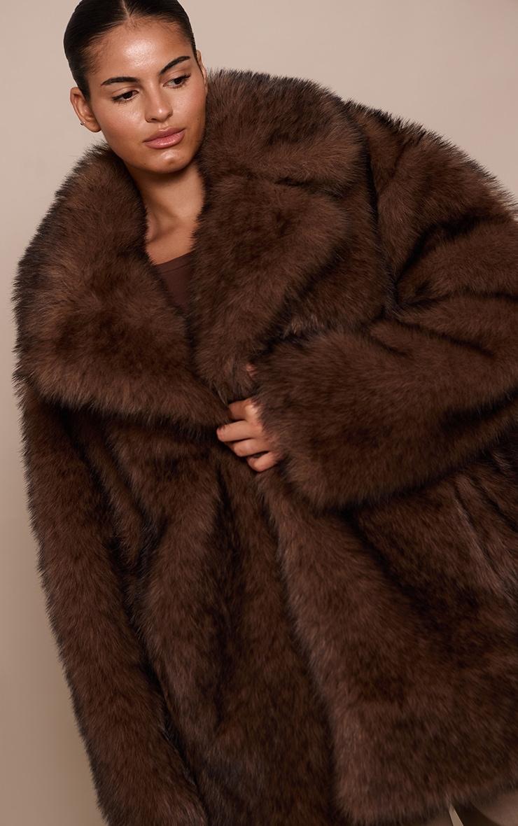 Command attention with a single, impactful layer. The plus chocolate oversized midi faux fur coat redefines cold-weather dressing, presenting a generous, expansive silhouette that drapes to a chic midi length. Its dramatic, oversized lapel collar creates an instantly iconic profile, designed for a relaxed, open wear or held with a minimalist fastening. Pair this statement piece over crisp tailored pants and a simple fitted sweater for an elevated daytime aesthetic, completing the look with sleek ankle boots and understated gold earrings for an effortlessly bold and truly unforgettable statement.Length approx 85cm/33.5inch (Based on sample size XL)Model wears size XLModel Height - 5ft 9inchp]:!mb-4inch>Category: OuterwearProduct type: Faux FurColor: ChocolateMaterial: Faux FurOccasion: Day