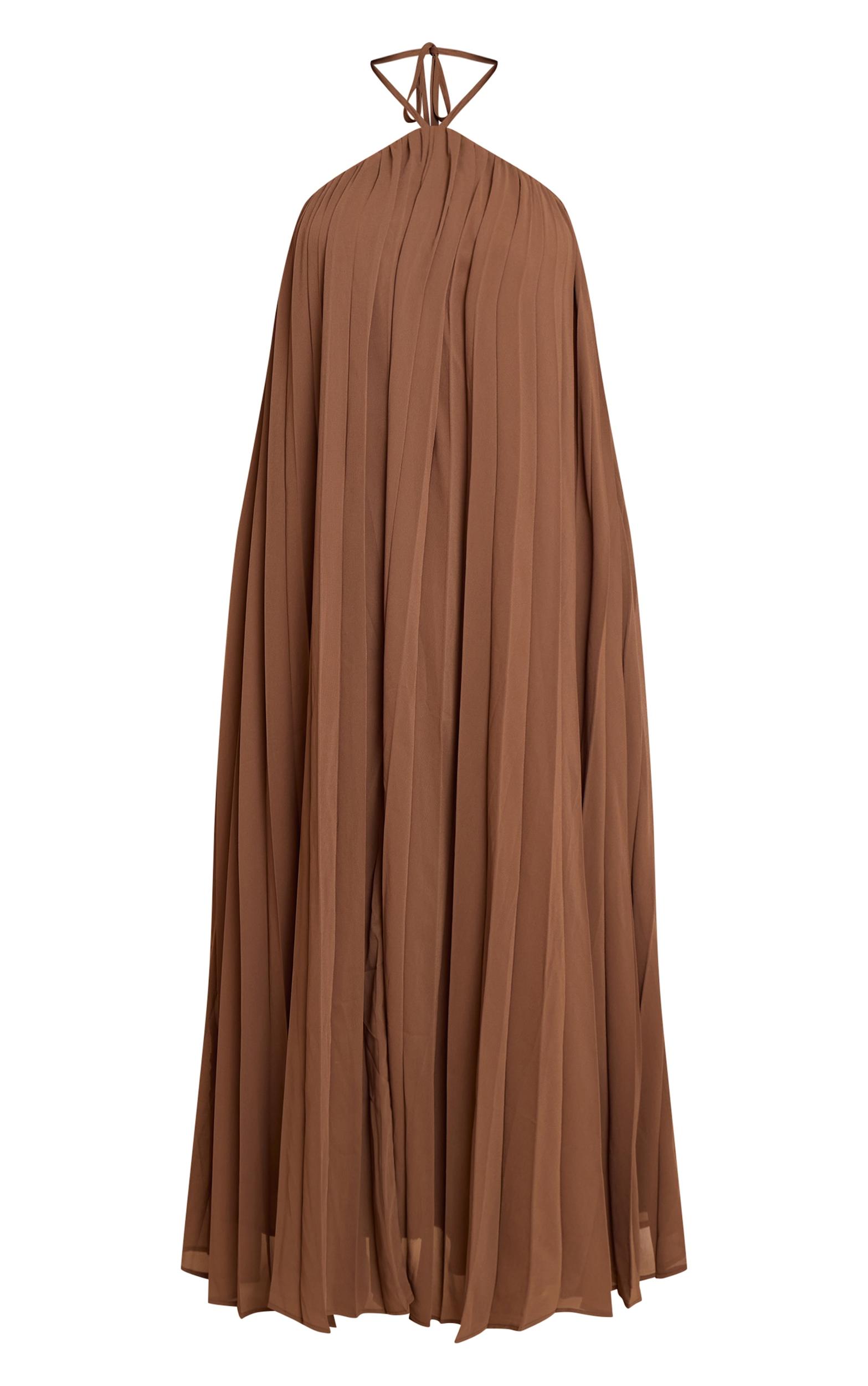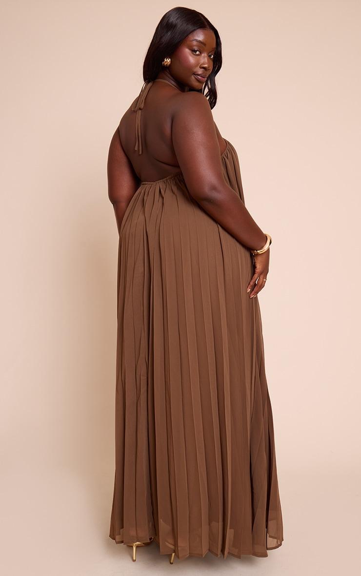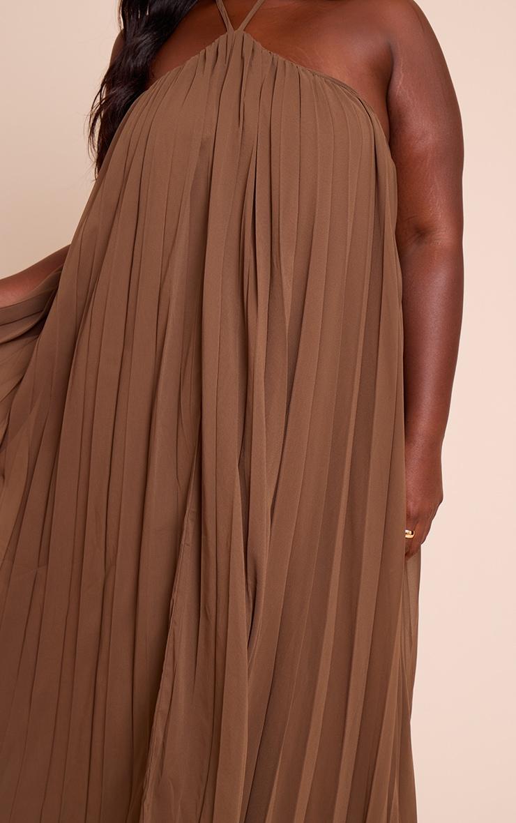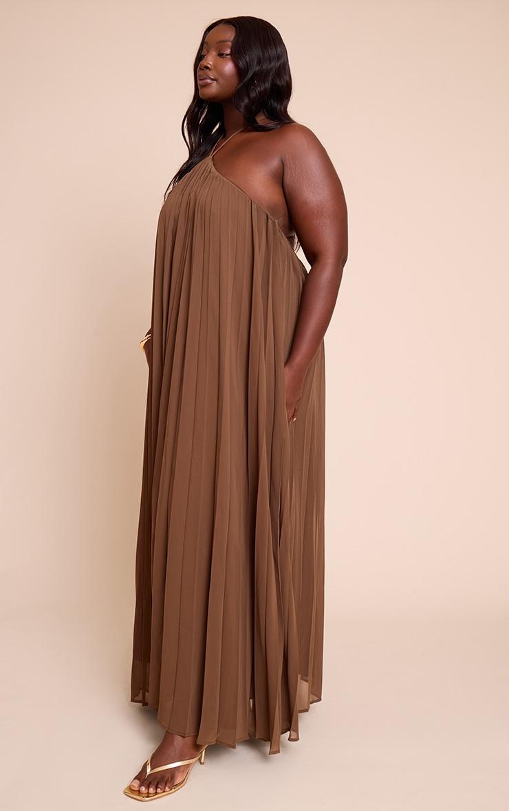 Make a graceful entrance in the plus chocolate printed pleated chiffon halterneck maxi dress. With its flowing chiffon fabric, delicate pleats and rich chocolate hue, this dress is made for sunset soirees. The halterneck cut adds an elegant finish, while the abstract print brings subtle movement and depth. Complete the look with strappy heels and gold earrings for understated glamour. Length approx 155cm/61inch (Based on sample size US 12)Model wears size UK 16/ EU 44/ AUS 16/ US 12Model Height - 5ft 9inchp]:!mb-4inch>Brand: PrettyLittleThingCategory: DressesProduct type: Shift DressColor: ChocolateMaterial: ChiffonDesign: PrintNeckline: HalterneckSleeves: SleevelessOccasion: Occasion
