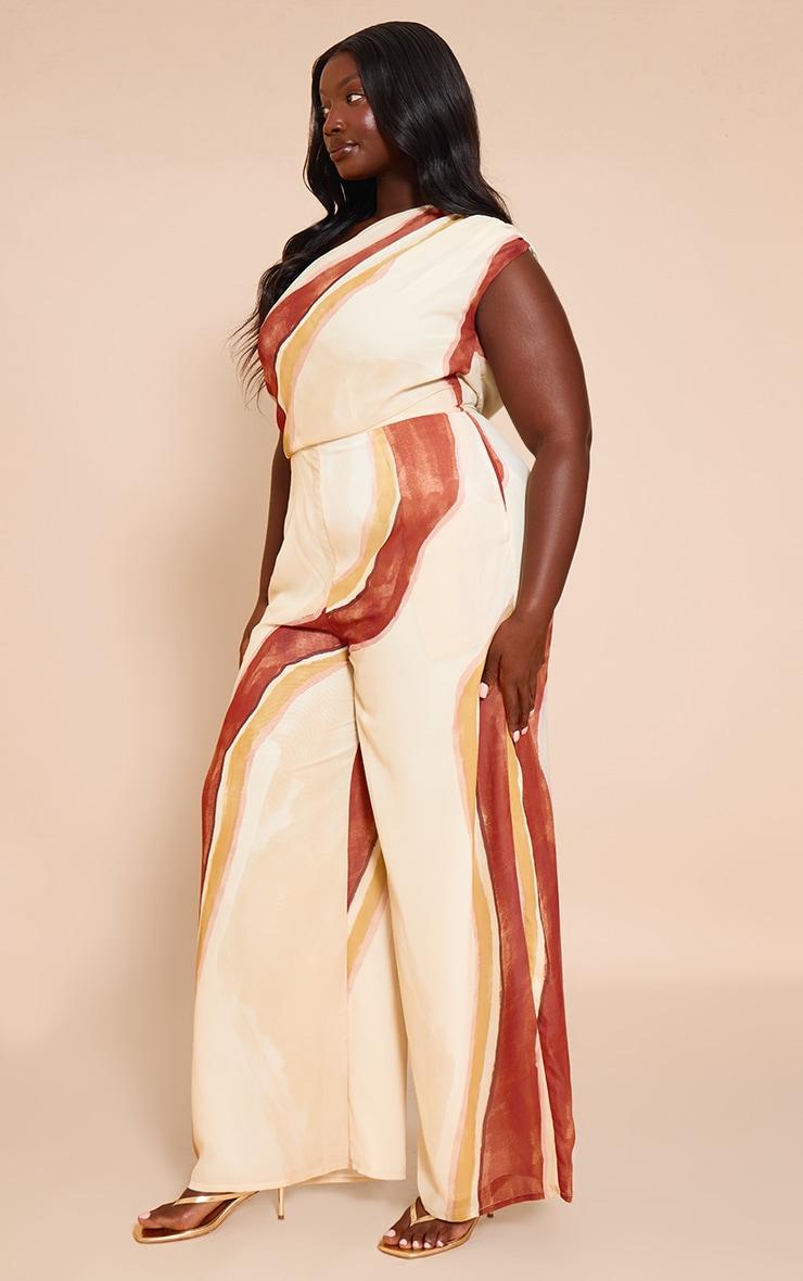 Make elegance effortless with the plus cream abstract chiffon one shoulder ruched jumpsuit. Made from a cream chiffon material, this jumpsuit features a one shoulder neckline and ruched details for soft shaping. Style with gold jewelry and slip-on heels for graceful dressing.Length approx 155cm/61inch (Based on sample size US 12)Model wears size UK 16/ EU 44/ AUS 16/ US 12Model Height - 5ft 9inchp]:!mb-4inch>Brand: PrettyLittleThingCategory: DressesProduct type: Wide Leg JumpsuitColor: CreamMaterial: ChiffonNeckline: One ShoulderSleeves: SleevelessOccasion: Evening