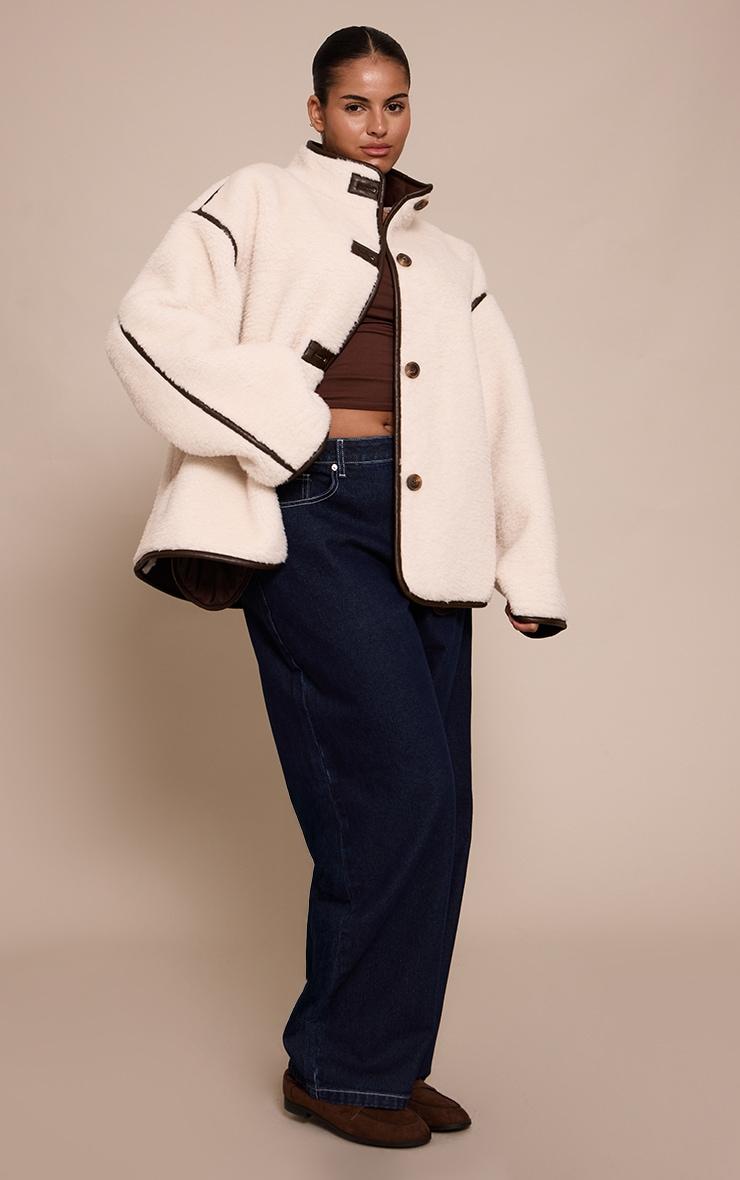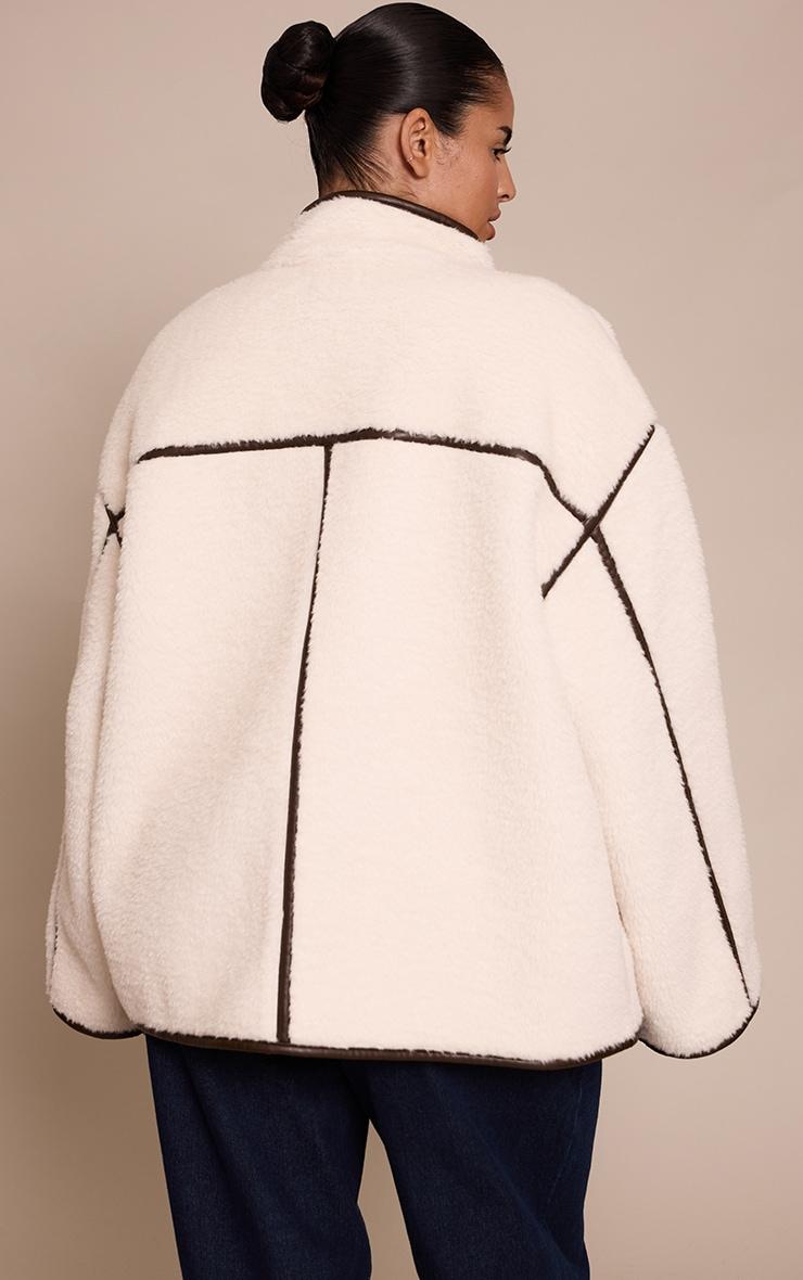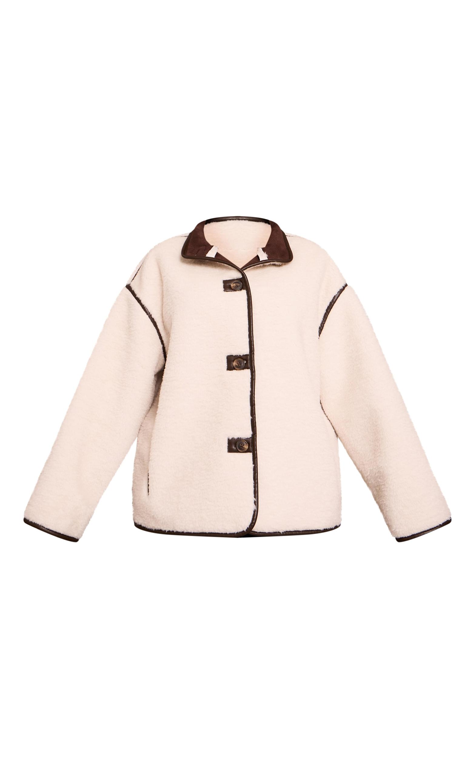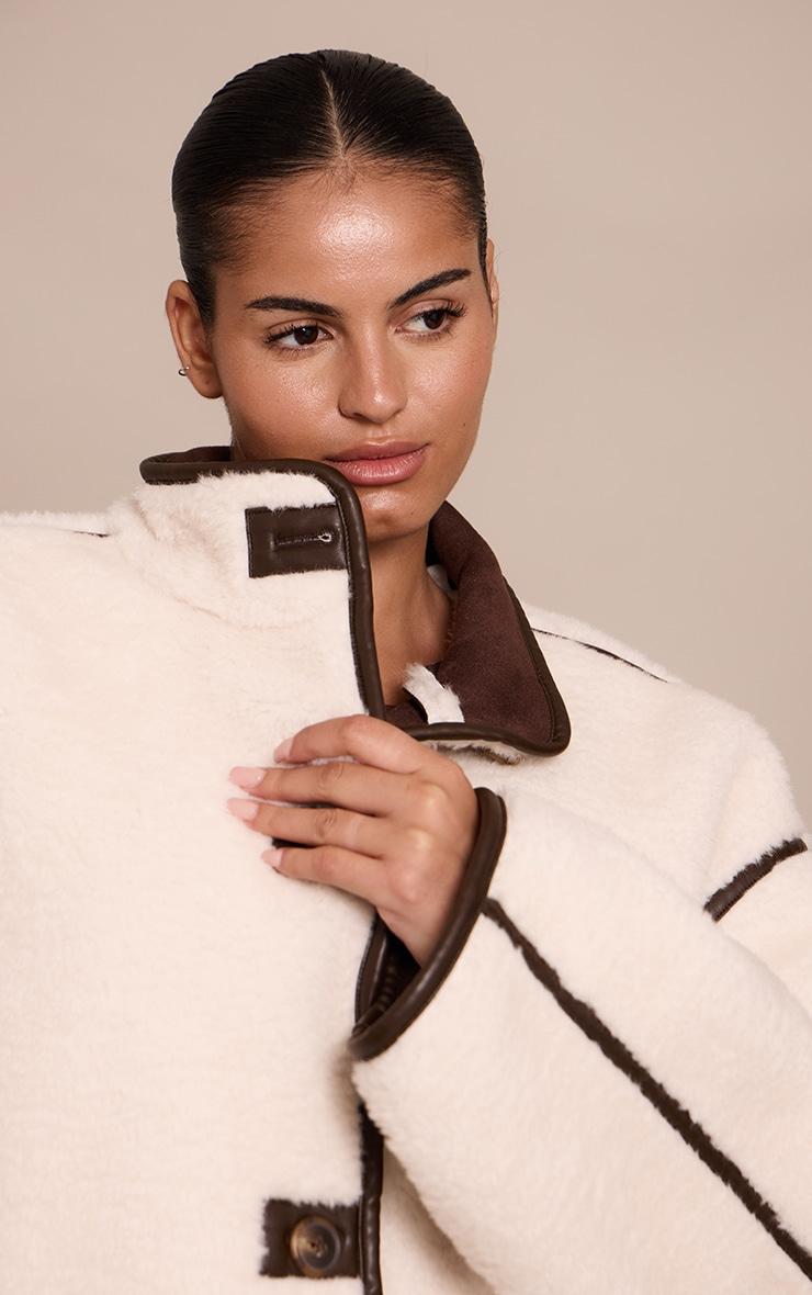 Let your outerwear make the statement. The plus cream borg faux leather contrast coat offers a confident, relaxed shape, perfectly framed by its distinctive dark faux leather trim that defines every edge, from the stand collar to the broad shoulder lines. Its streamlined front features bold, contrasting buttons for a sophisticated detail. Style this impactful piece over simple wide-leg pants and a fitted sweater, grounded by sleek ankle boots and a hint of understated gold jewelry for a refined daytime aesthetic.Length approx 58.5cm/23inch (Based on sample size XL)Model wears size XLModel Height - 5ft 9inchp]:!mb-4inch>Category: OuterwearProduct type: AviatorColor: CreamMaterial: BorgOccasion: Day