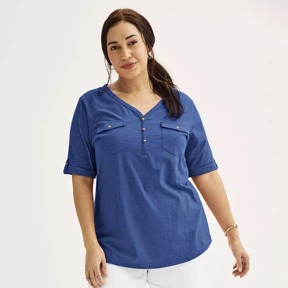 Update your casual wardrobe with this women's plus size henley top from Croft & Barrow.Click on this WOMEN'S GUIDE to find the perfect fit and more! Update your casual wardrobe with this women's plus size henley top from Croft & Barrow.Click on this WOMEN'S GUIDE to find the perfect fit and more! Henley neckline Roll-tab elbow sleeves 2 chest pocketsFIT & SIZING Longer lengthFABRIC & CARE Cotton, polyester; Linen, rayon Machine wash Imported Size: 0X. Color: Christian Bay. Gender: female. Age Group: adult. Material: Cotton Blend.