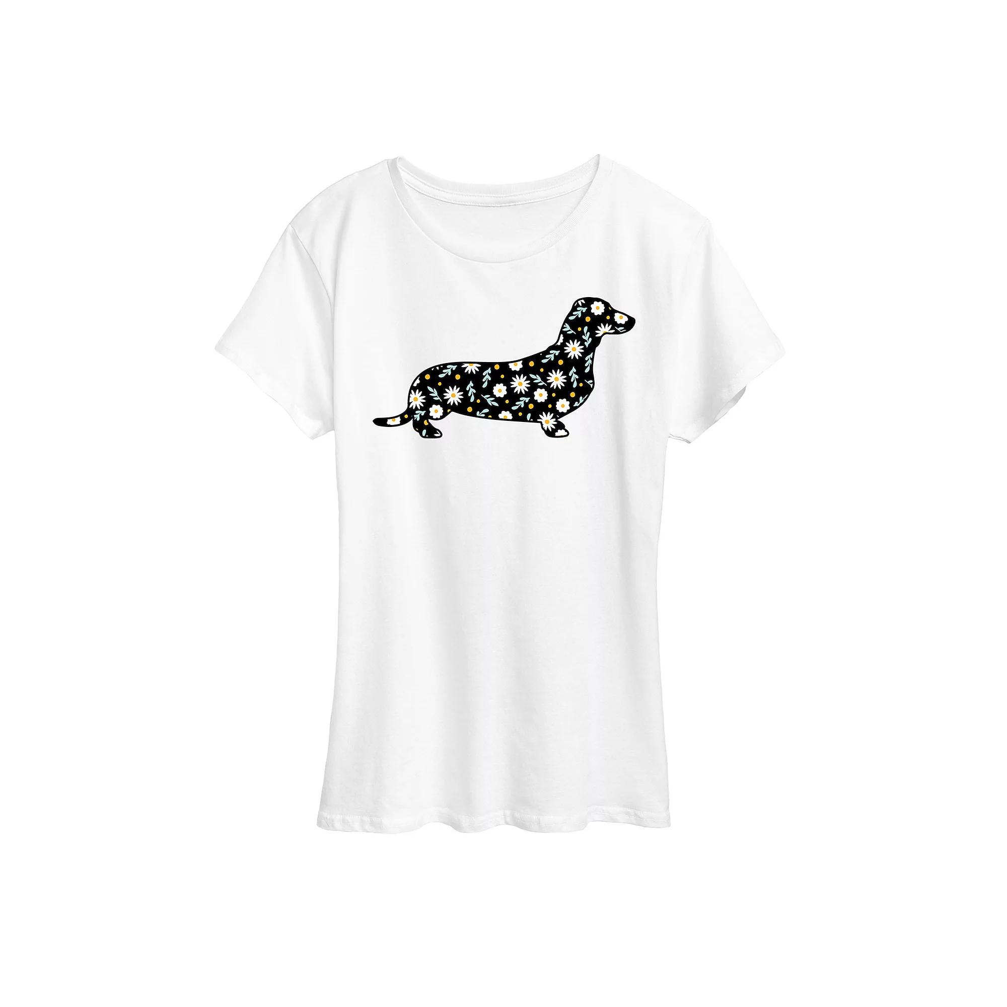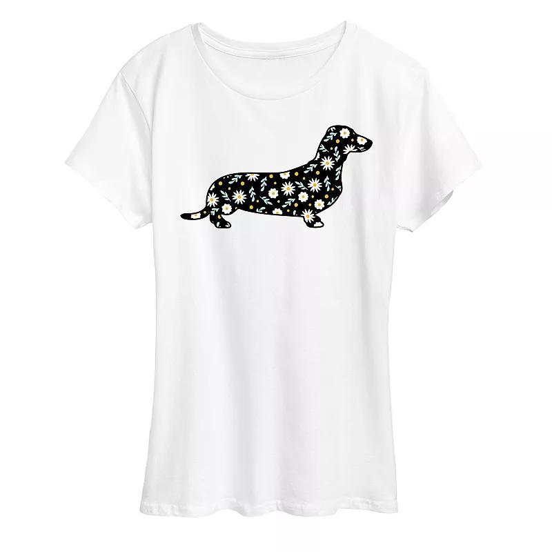 White Daisy-Fill Dachshund Graphic Tee - Women, Juniors, Plus & Petite Plus. Relaxed crewneck tee featuring breathable cotton fabric and a floral-print pup.Size S: 26 long from high point of shoulder to hemSize & fit: Relaxed-fit garment with a slightly longer hem. Fits true to size.100% cottonMachine wash; tumble dryImported, screen printed in the USA