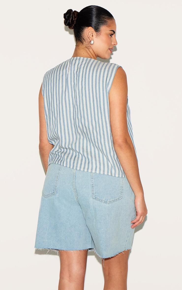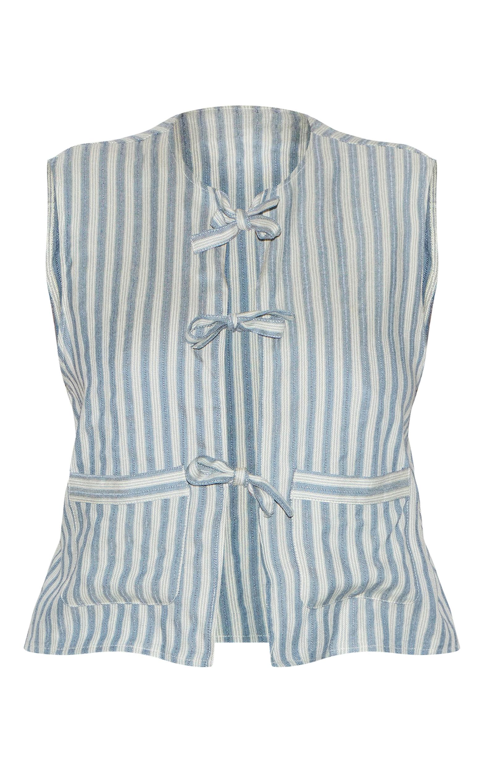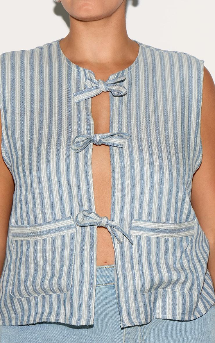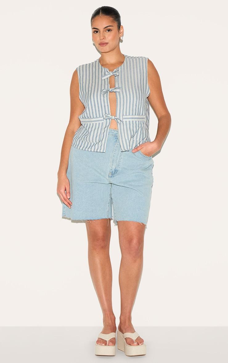 Keep it cute in this plus light blue stripe tie front vest. Tailored to perfection, this top has subtle striping with tie front fastenings. For a chic seasonal look, style this piece with denim shorts, chunky sole sandals and gold stud fastening earrings. Length approx 58.5cm/23inch (Based on sample size US 12)Model wears size UK 16/ EU 44/ AUS 16/ US 12Model Height - 5ft 9inchp]:!mb-4inch>Brand: PrettyLittleThingCategory: TopsProduct type: WaistcoatColor: Light BlueMaterial: Cotton PoplinDesign: PlainOccasion: Day