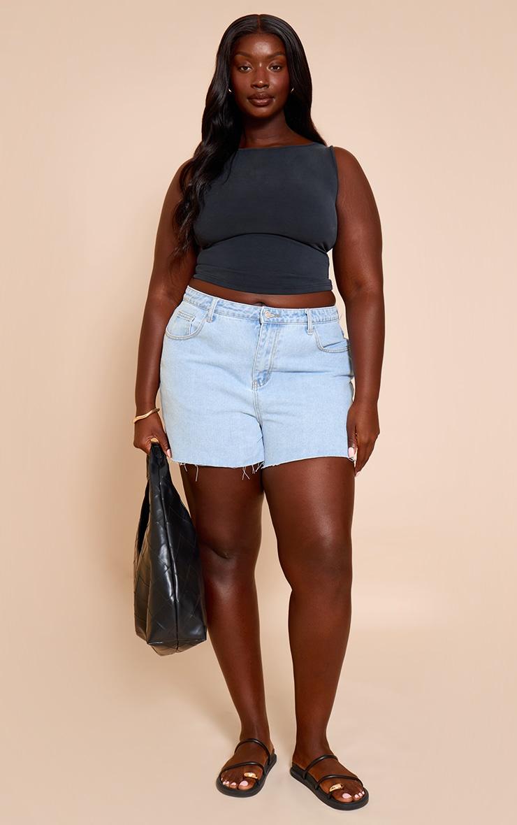 Command your casual look with a denim staple built for sunshine. The plus light blue wash raw hem denim hotpant in a cool light blue wash offers a confident cut, perfect for warm days. Complete with a modern raw hem and classic five-pocket design, its relaxed fit and traditional zip and button fastening ensure effortless wear. Pair this everyday essential with a simple Vest top or an oversized t-shirt for an understated vibe, or elevate the look with a fitted crop top and chunky sneakers for an on-point day aesthetic.Length approx 48.5cm/19inch (Based on sample size US 12)Model wears size UK 16/ EU 44/ AUS 16/ US 12Model Height - 5ft 9inchp]:!mb-4inch>Brand: PrettyLittleThingCategory: DenimProduct type: Denim ShortsColor: Light Blue WashMaterial: Rigid DenimDesign: PlainNeckline: BandeauOccasion: Day