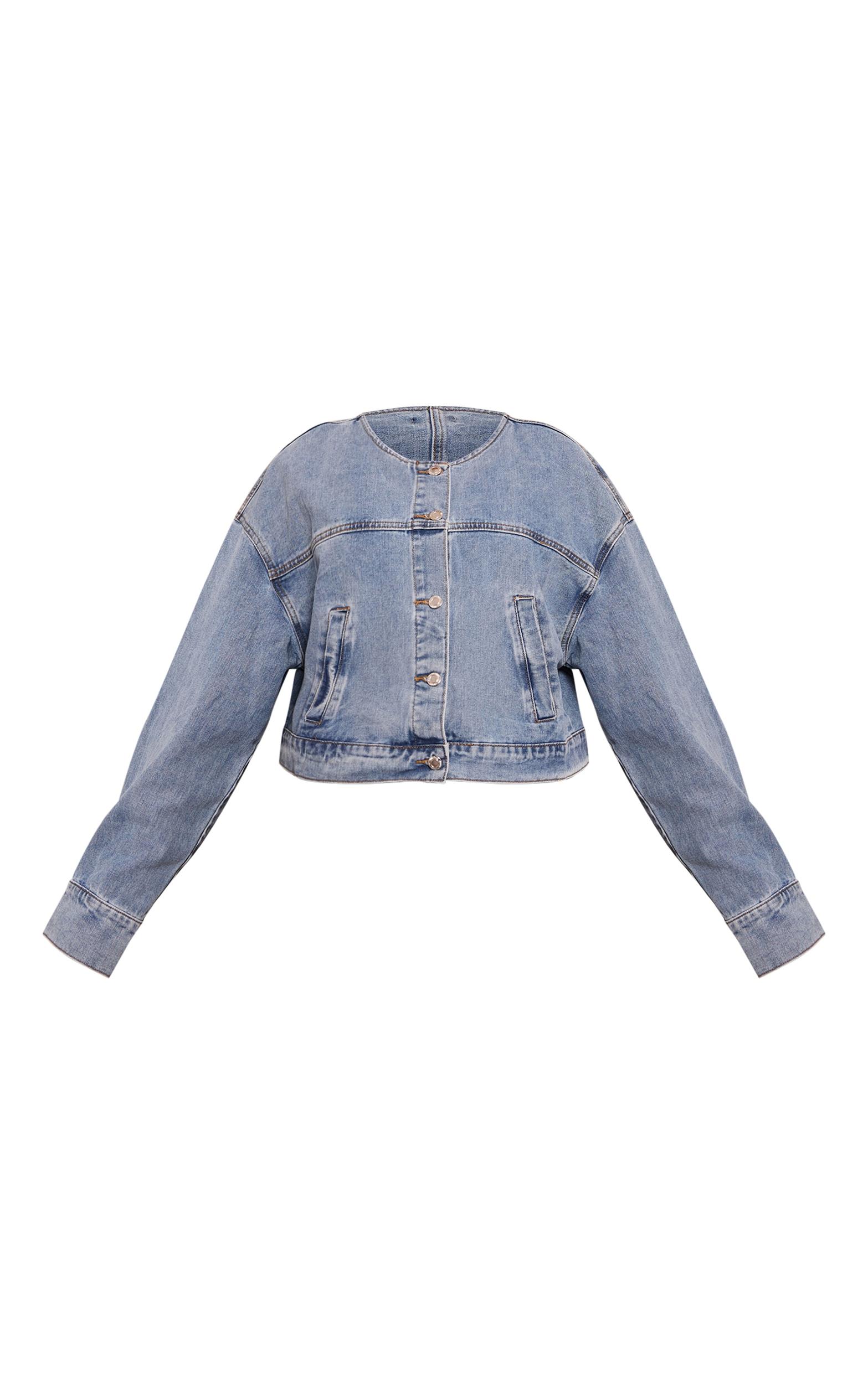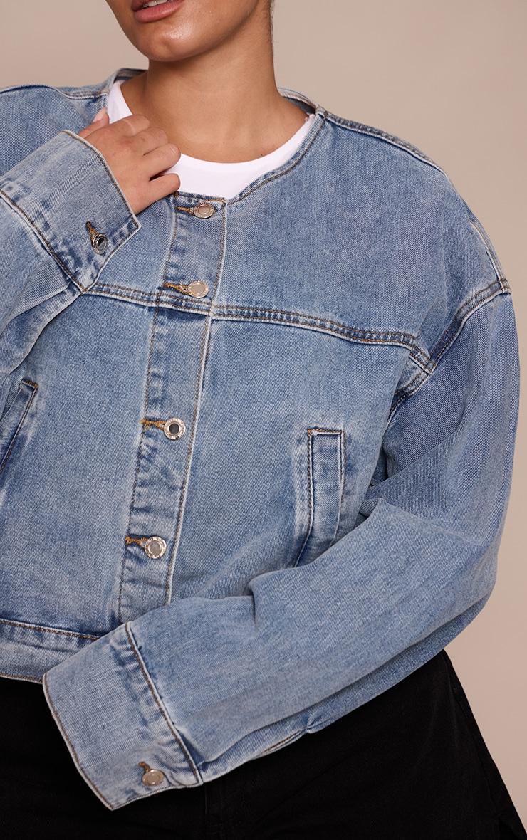 The plus mid blue wash collarless cropped denim jacket is a fresh take on a wardrobe essential. The cropped length and collarless finish give it a clean, modern silhouette, while the mid-blue wash keeps it versatile. A piece designed for layering across seasons. Pair with high-waisted pants and a crop top for a balanced silhouette, or throw over a floral maxi dress for effortless layering.Length approx 58.5cm/23inch (Based on sample size US 12)Model wears size UK 16/ EU 44/ AUS 16/ US 12Model Height - 5ft 9inchp]:!mb-4inch>Brand: PrettyLittleThingCategory: DenimProduct type: Cropped Denim JacketColor: Mid Blue WashMaterial: Rigid DenimNeckline: ShirtSleeves: LongOccasion: Day