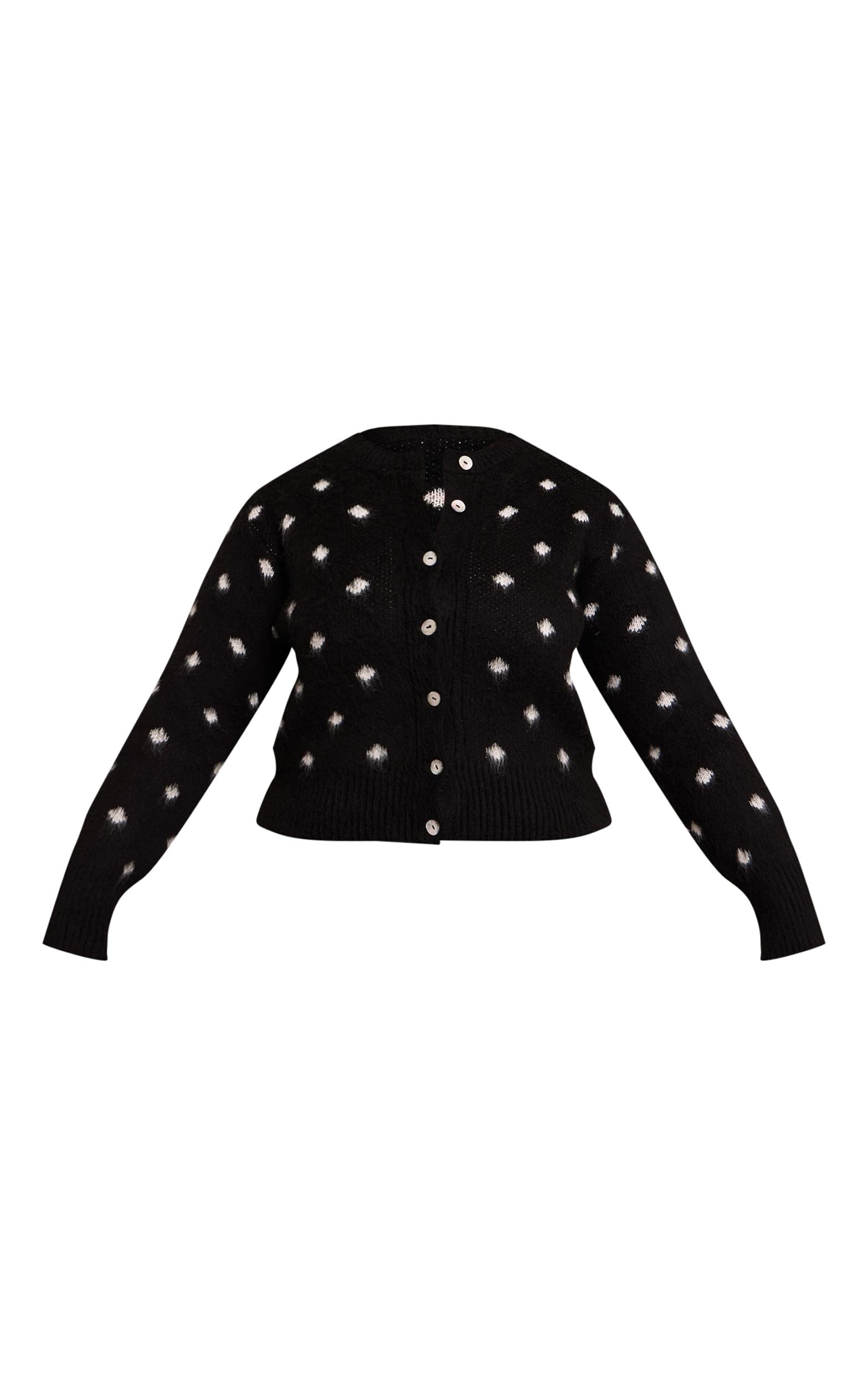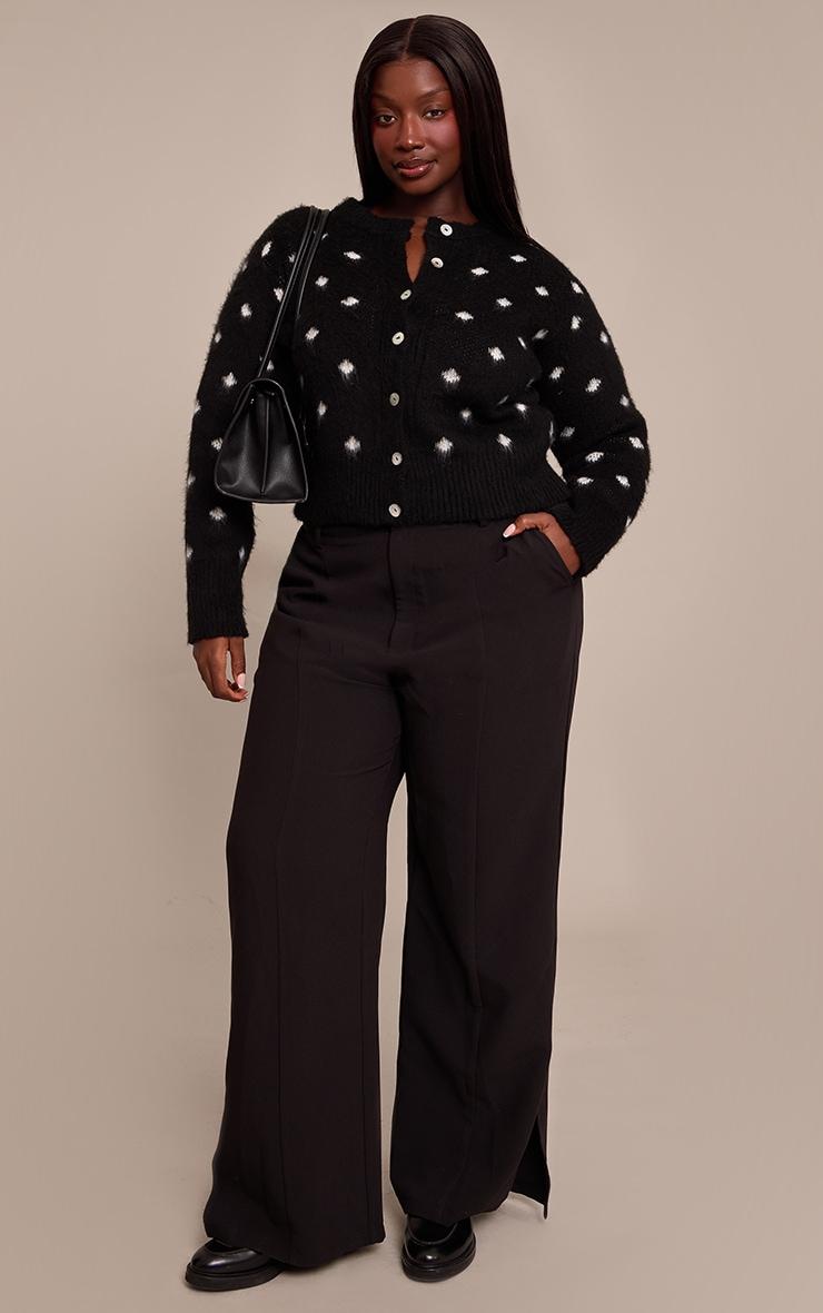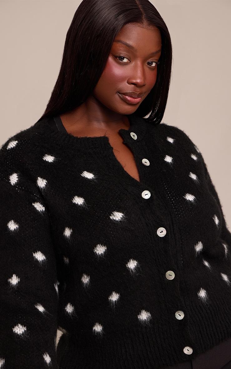 Upgrade your daywear with this artful plus polka dot brushed knit cardigan. Its black knit features a round neck, long sleeves, and a relaxed fit, with button fastenings. Perfect for day plans needing an effortless, knowing touch. Pair with pants, black heels, and drop earrings for a polished finish.Length approx 58.5cm/23inch (Based on sample size XL)Model wears size XLModel Height - 5ft 9inchp]:!mb-4inch>Brand: PrettyLittleThingCategory: KnitwearProduct type: CardigansColor: BlackMaterial: Brushed KnitOccasion: Day