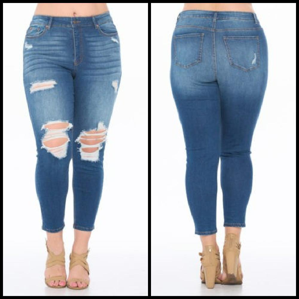 Plus size medium wash ripped high rise skinny jeans in ankle length. Rise: 10.5" Inseam: 27" 98% Cotton, 2% Spandex