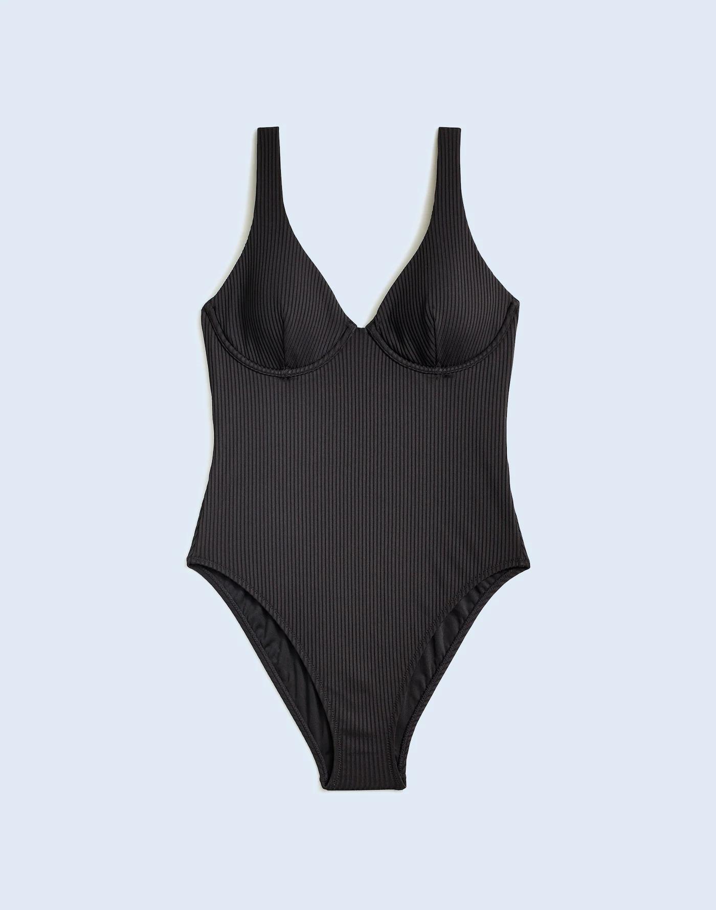 Ultrasupportive thanks to removable foam cups and underwire at the bust, this one-piece swimsuit has a V-shaped neckline, adjustable straps and an open back. Coming in a cool textural rib, it's so cute (and so wearable) paired with your favorite denim cutoffs.