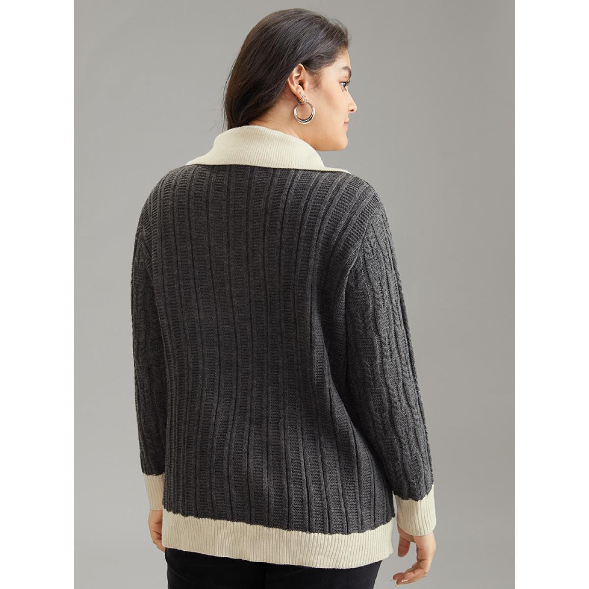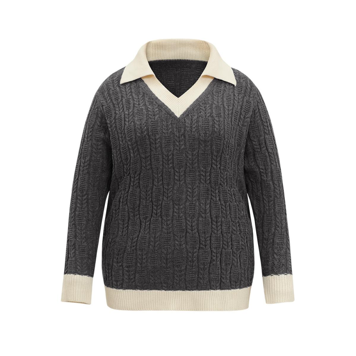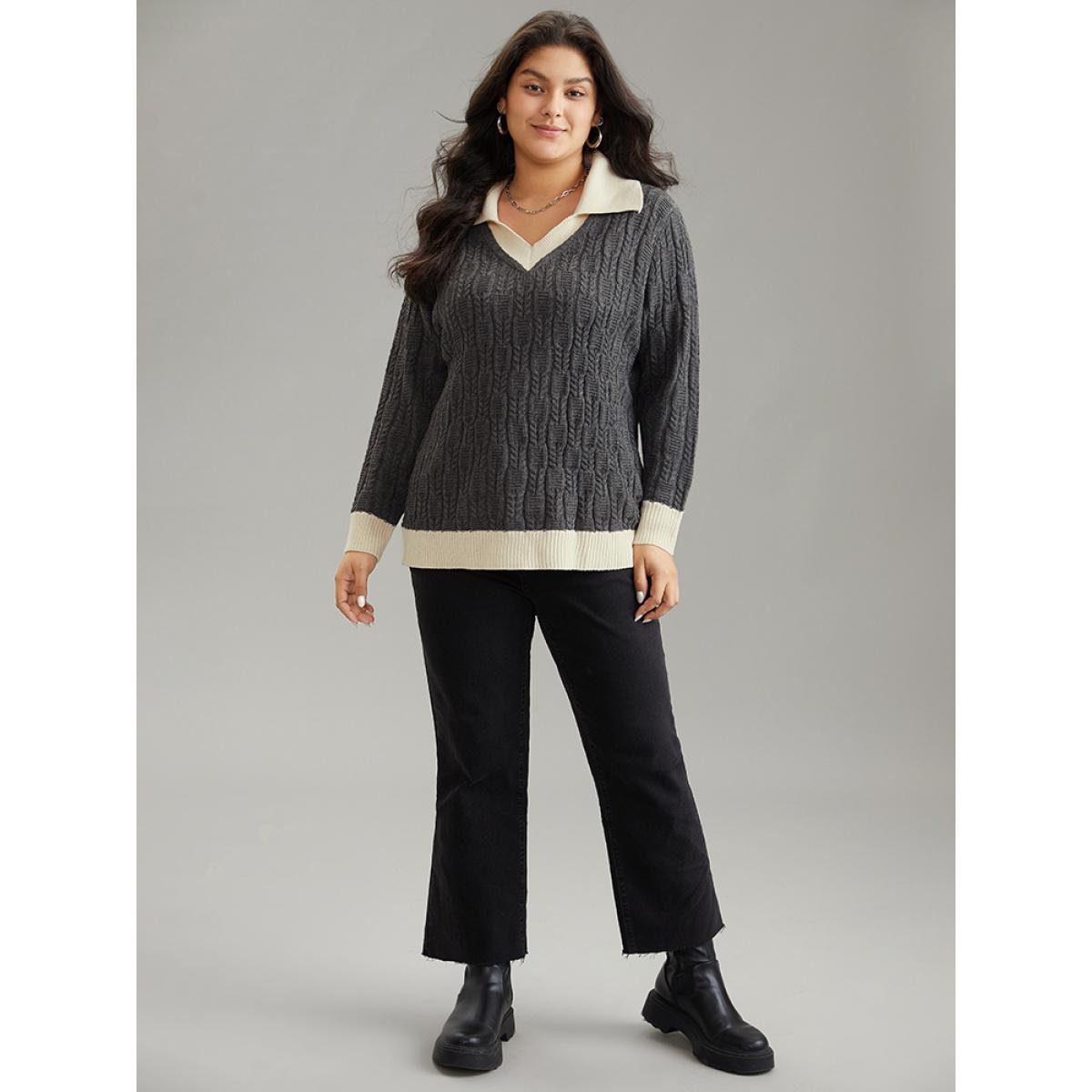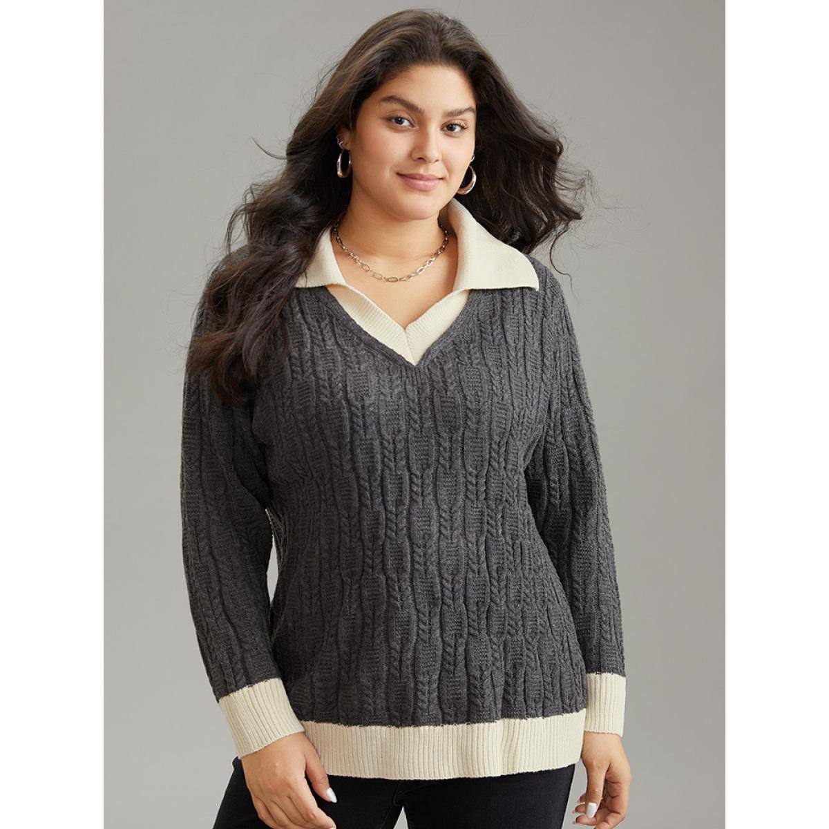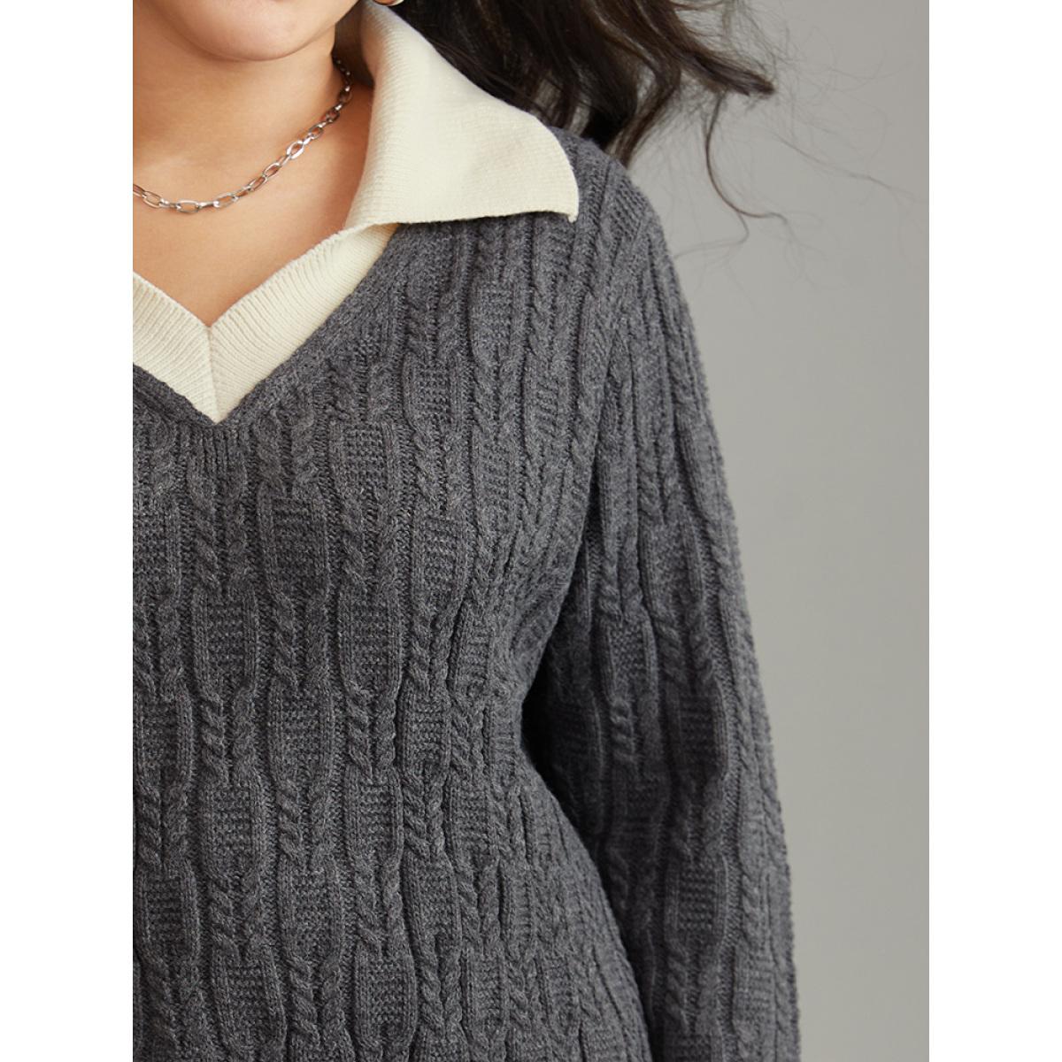 Plus Size 2-In-1 Cable Knit Lapel Collar Pullover DimGray Women Casual Loose Long Sleeve Lapel Collar Dailywear Pullovers BloomChic 12/L