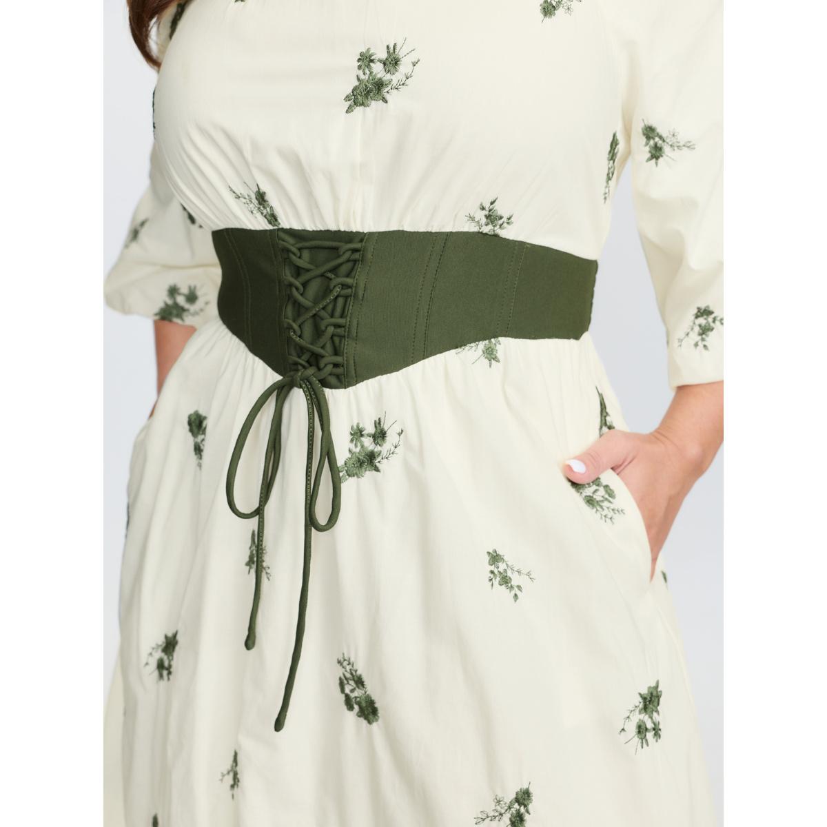Plus Size Floral Embroidery Pockets Tassels Midi Dress Ivory Women Notched collar Short sleeve Curvy BloomChic 10/M