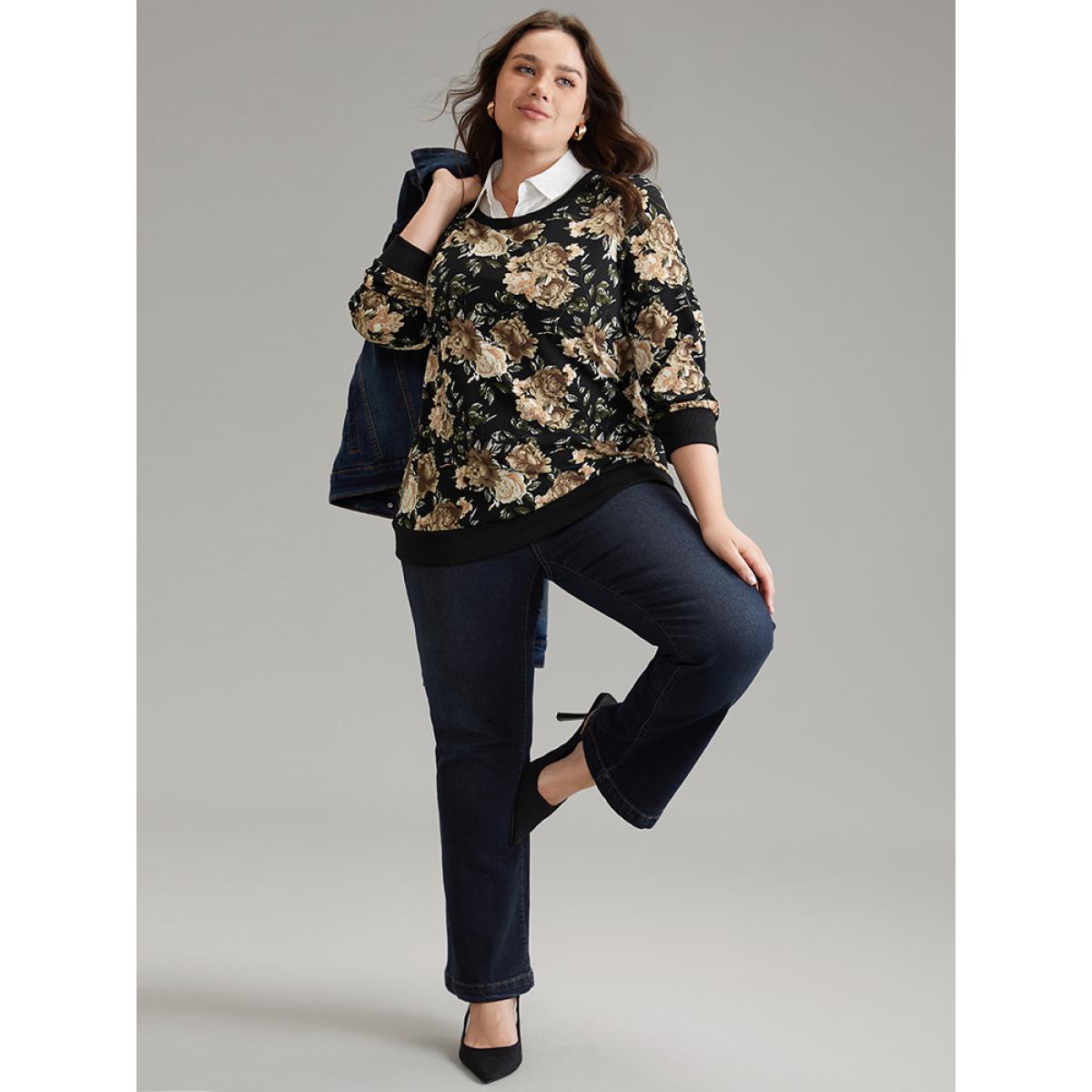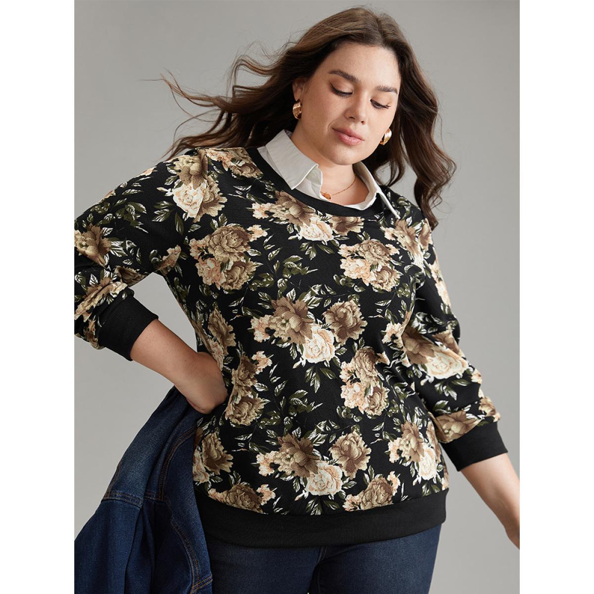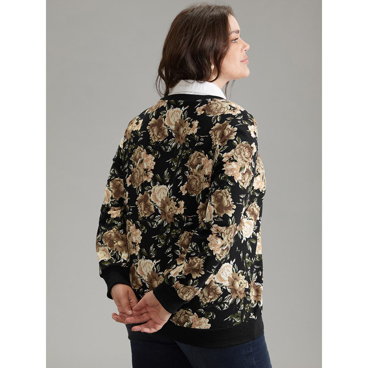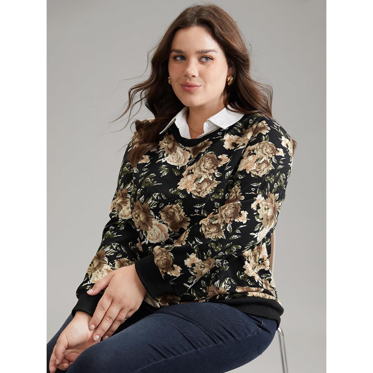 Plus Size 2-In-1 Floral Print Shirt Collar Sweatshirt Women BlackFlower Elegant Printed Shirt collar Dailywear Sweatshirts BloomChic 14-16/1X