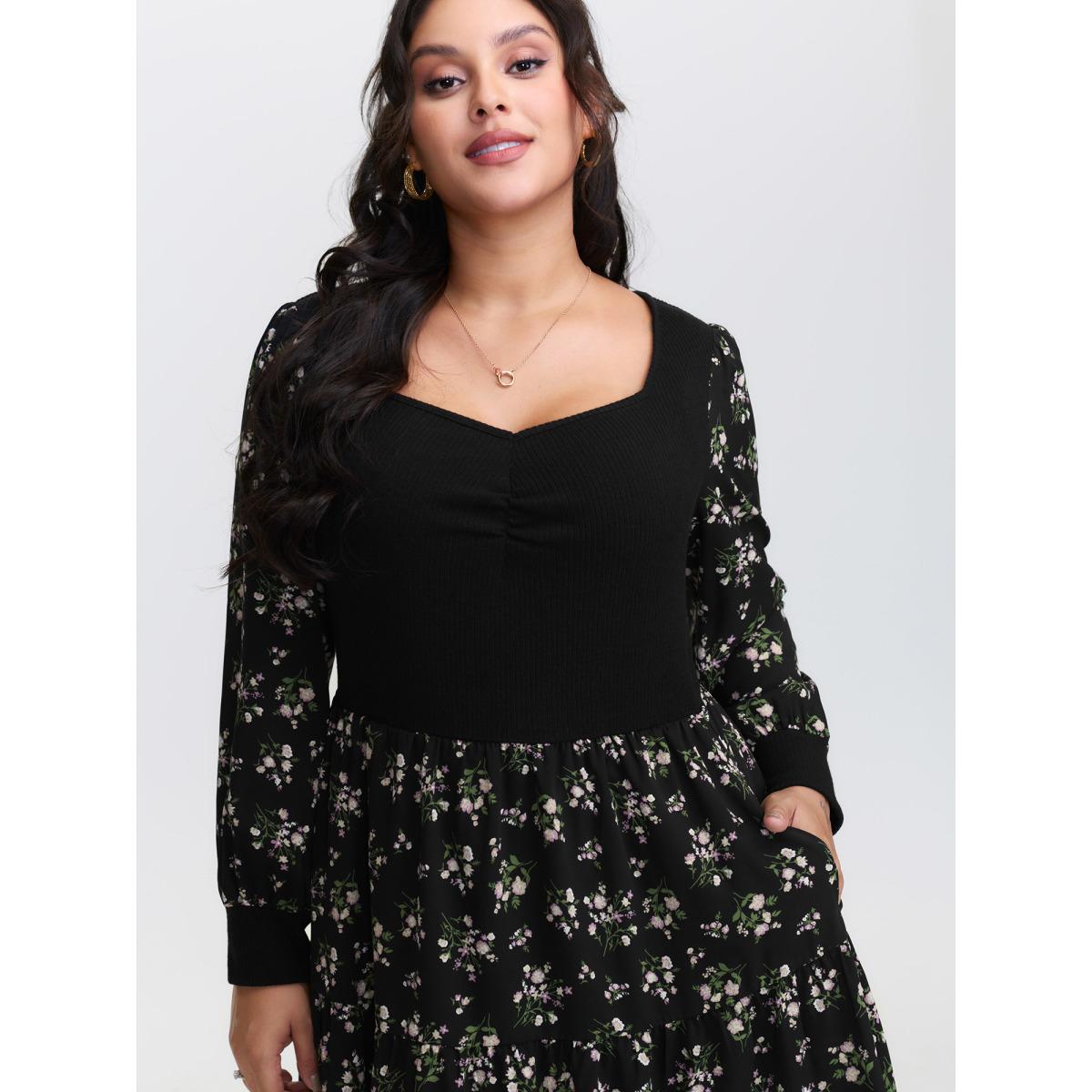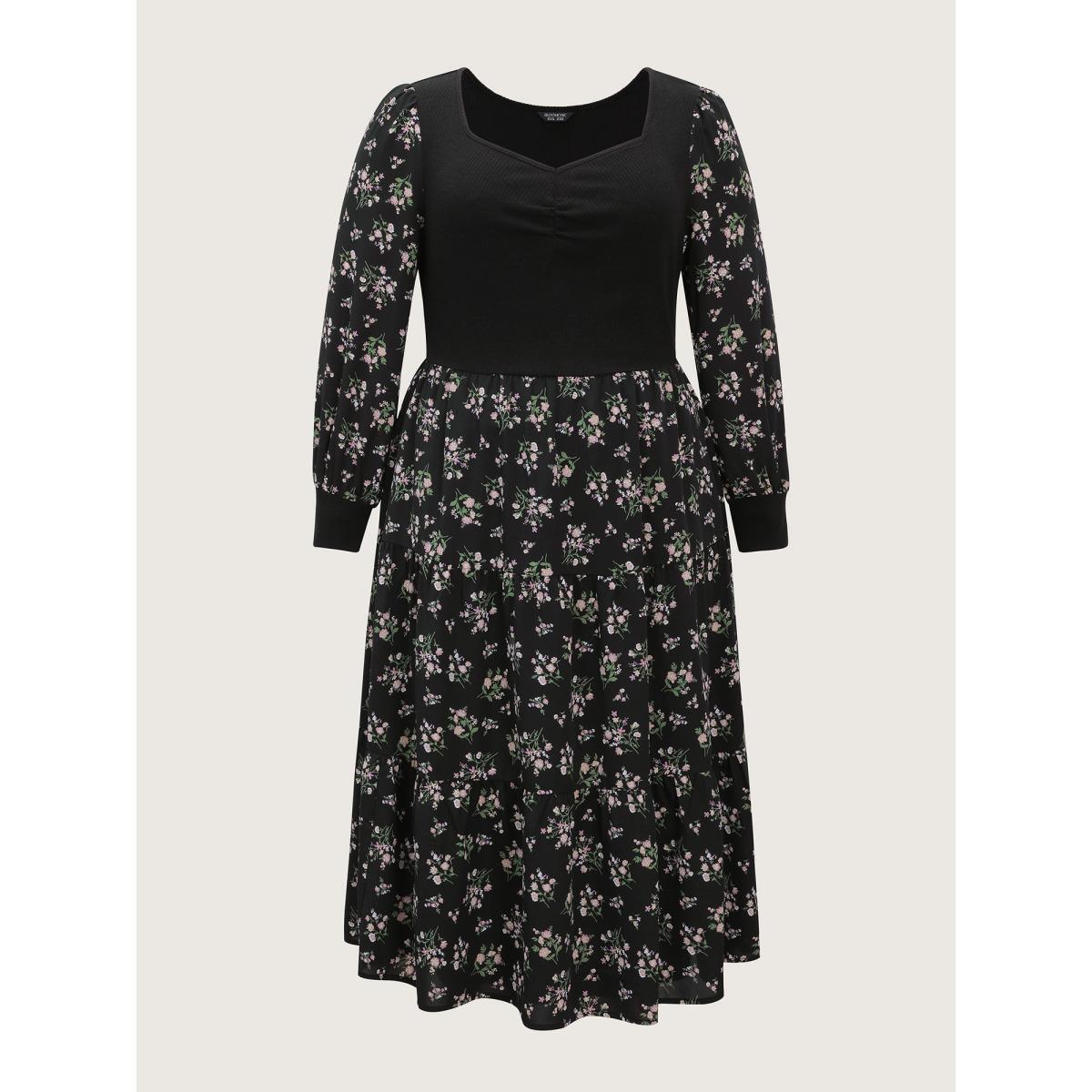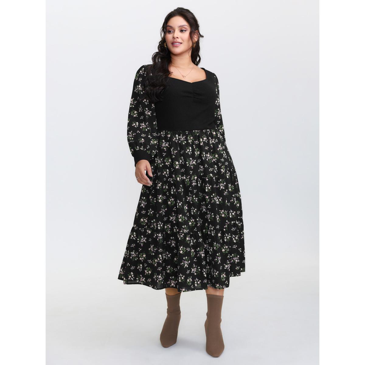 Plus Size Floral Print Ruched Bowknot Patchwork Dress Black Women Elegant Elastic cuffs Square Neck Long Sleeve Curvy Midi Dress BloomChic 12/L