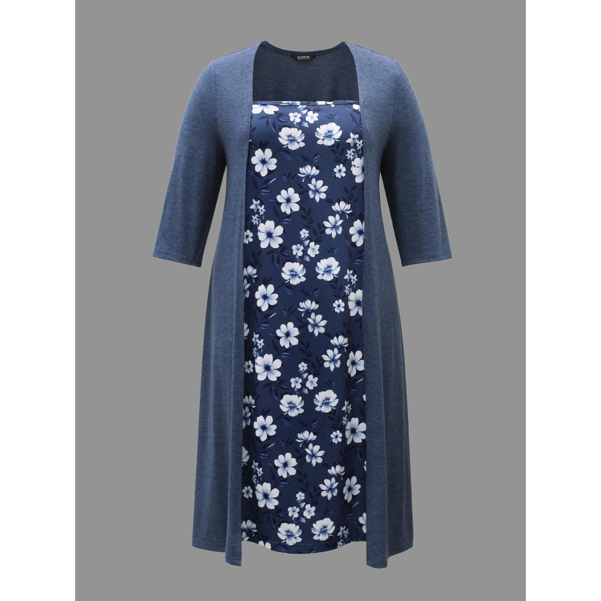 Plus Size 2-In-1 Square Neck Floral Dress DarkBlue Women Casual Patchwork Knit Dresses Bloomchic 28/5X