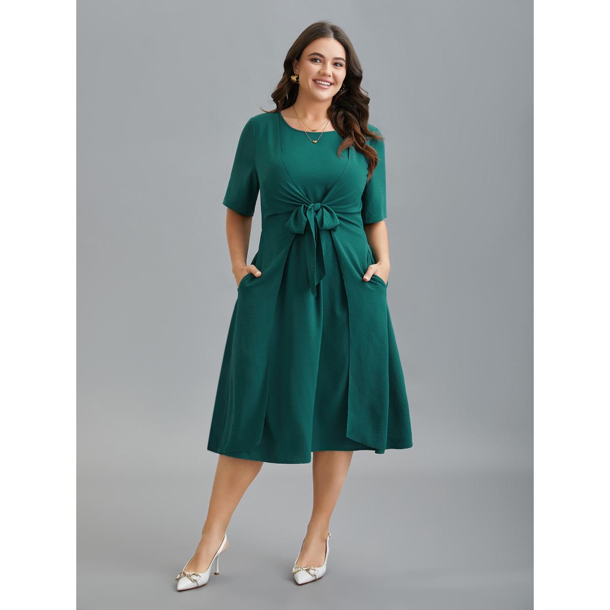 Plus Size 2-in-1 Waist-Tie Pockets Fit & Flare Dress Emerald Women Elegant Overlapping Round Neck Short sleeve Curvy BloomChic 26/4X