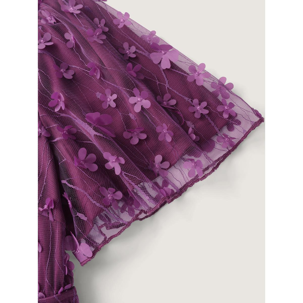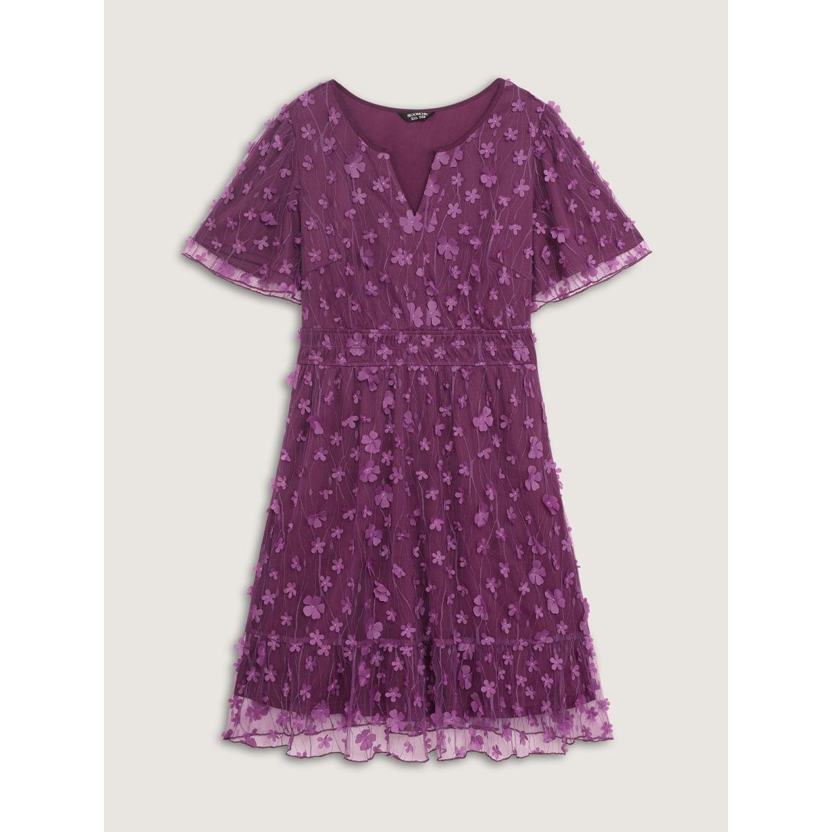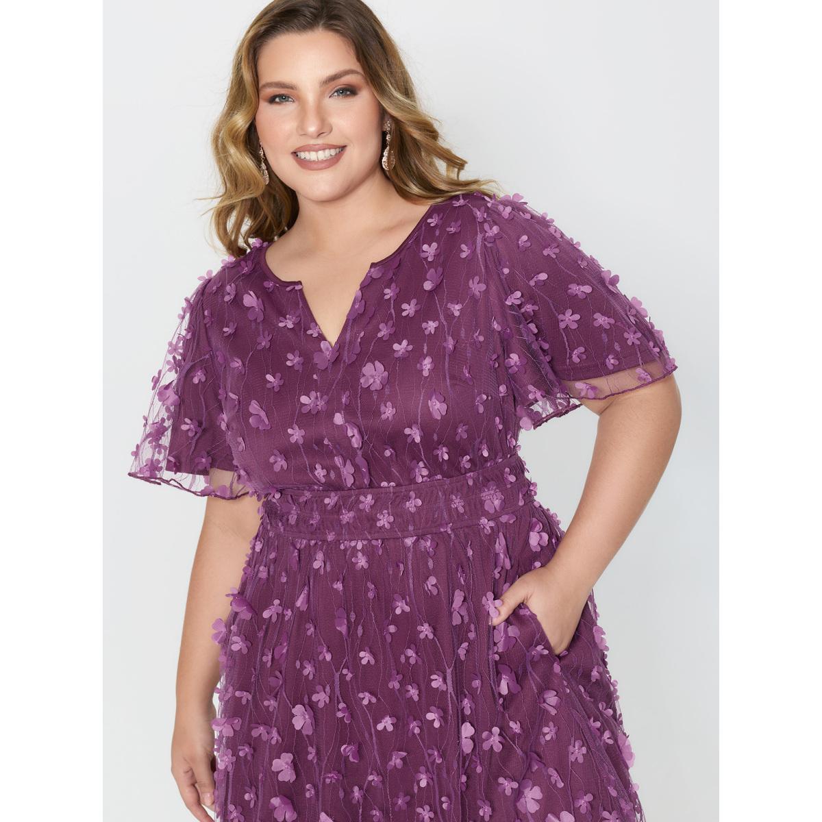 Plus Size 3D Floral Mesh Notched Neckline Midi Dress Deeppurplered Women Party&Cocktail Embroidered Flat collar with V-notch Short sleeve Curvy BloomChic 18-20/2X