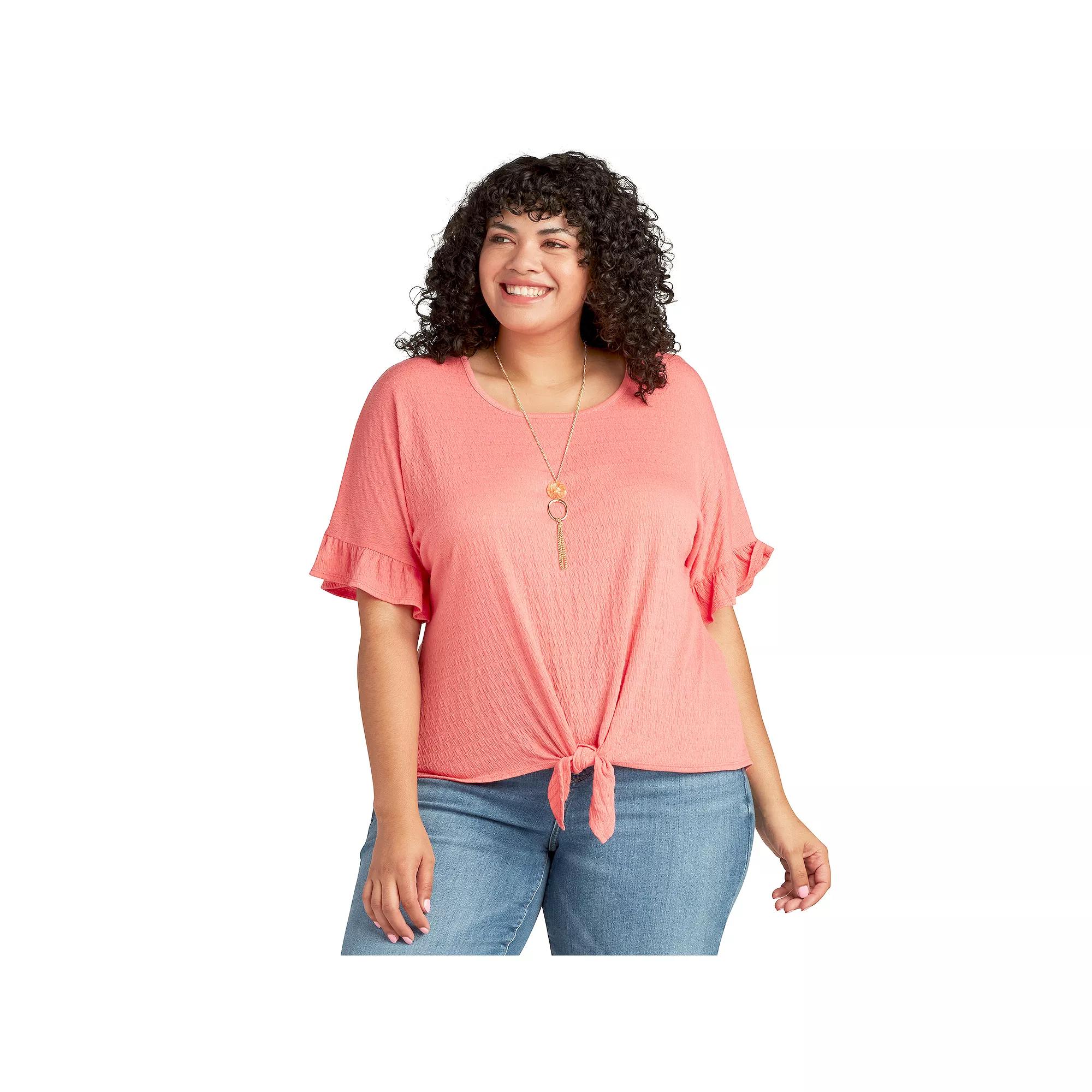 You'll love the stylish look of this Plus Size AB Studio Tie Front Ruffle Sleeve Top With Necklace.Click on this WOMEN'S GUIDE to find the perfect fit and more! You'll love the stylish look of this Plus Size AB Studio Tie Front Ruffle Sleeve Top With Necklace.Click on this WOMEN'S GUIDE to find the perfect fit and more! FEATURES Scoopneck Short sleeves Ruffle sleeves Necklace included Pucker knit construction High-low hem No closure - pullover stylingFIT & SIZING Loose fit 27-in. length from shoulder to hemFABRIC & CARE Polyester, rayon, spandex Machine wash delicate and tumble dry low Imported Size: 4X. Color: Coral. Gender: female. Age Group: adult.