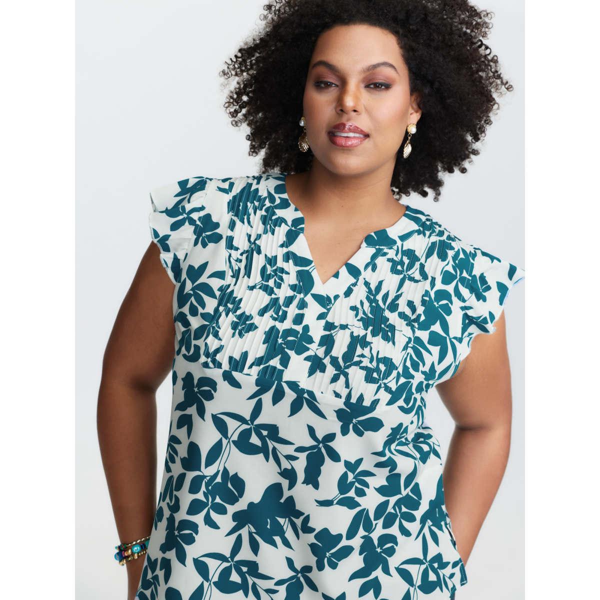 Plus Size Aegean Silhouette Floral Print Notched Collar Pleated Blouse Women Resort Cap Sleeve Notched collar Vacation Blouses BloomChic 10/M