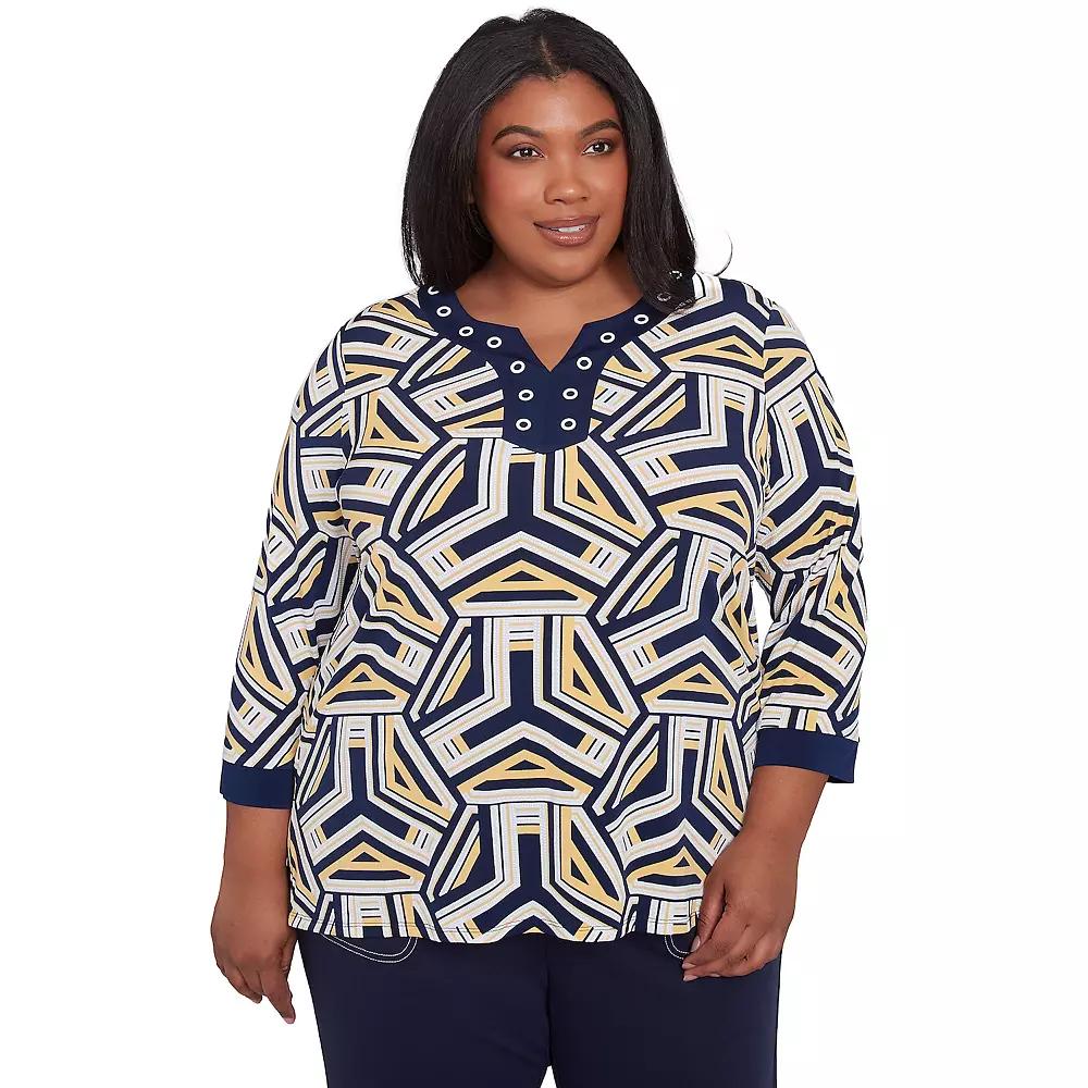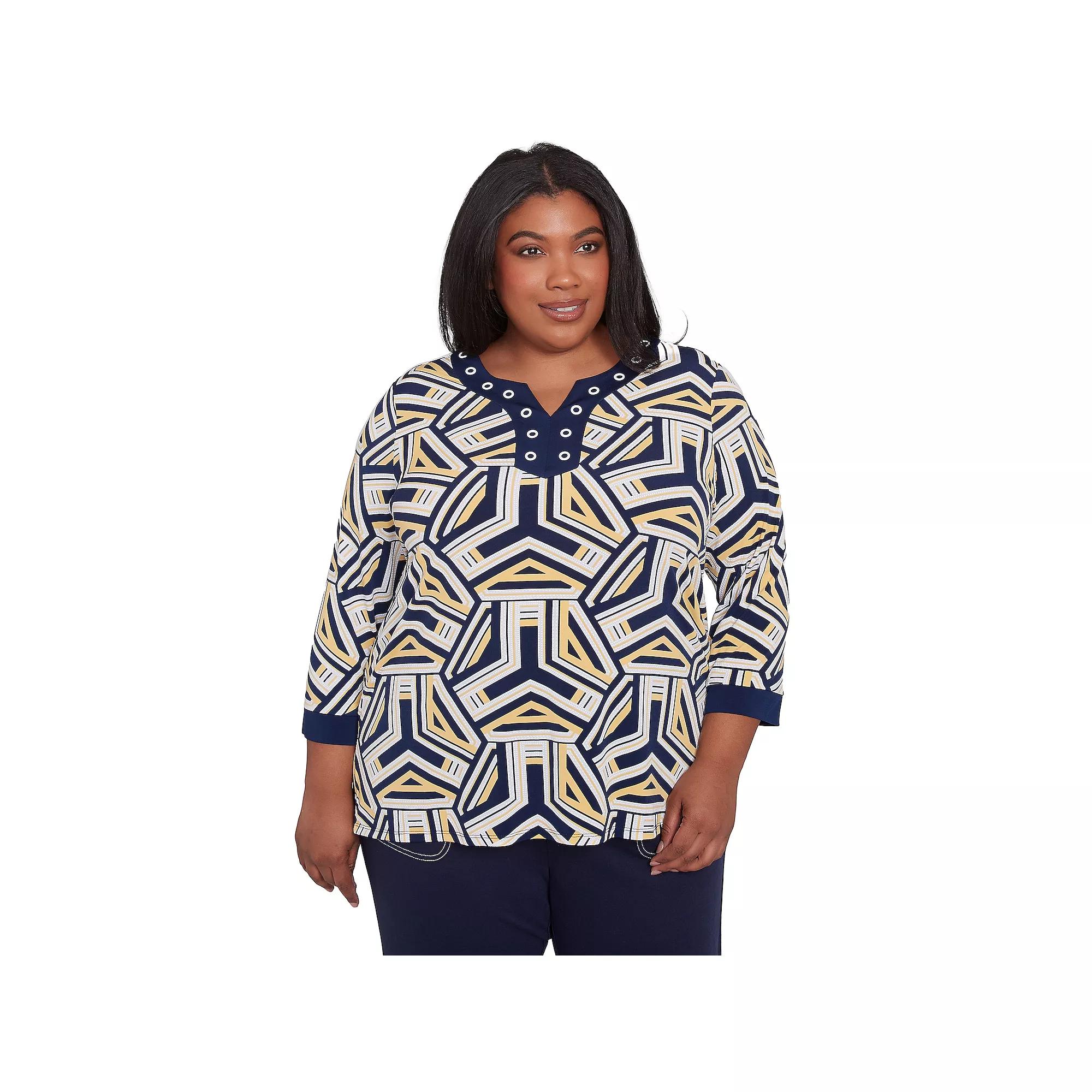 This eye-catching womens plus size Alfred Dunner top features a unique geometric pattern that is sure to make a statement. The split neckline with grommet trim adds a touch of edginess, while the three-quarter sleeves provide a flattering and versatile silhouette.Click on this WOMENS GUIDE to find the perfect fit and more!This eye-catching womens plus size Alfred Dunner top features a unique geometric pattern that is sure to make a statement. The split neckline with grommet trim adds a touch of edginess, while the three-quarter sleeves provide a flattering and versatile silhouette.Click on this WOMENS GUIDE to find the perfect fit and more!FEATURES V-neck 3/4-length sleeves Pullover stylingFIT & SIZING 26 1/2-in. length from shoulder to hemFABRIC & CARE Polyester, spandex Machine wash and tumble dry Imported Size: 1X. Color: Navy Team. Gender: female. Age Group: adult.