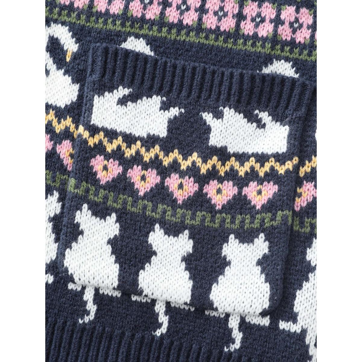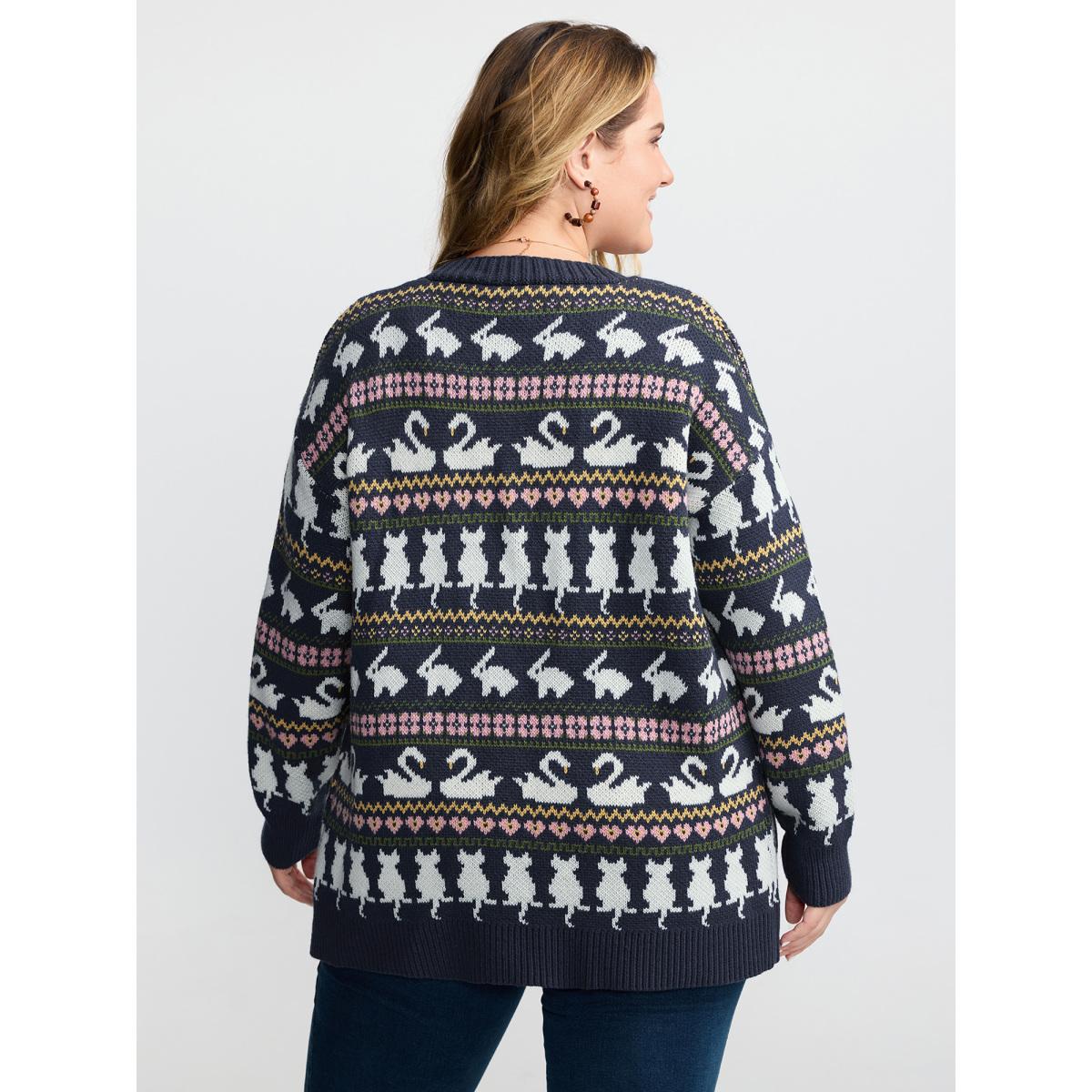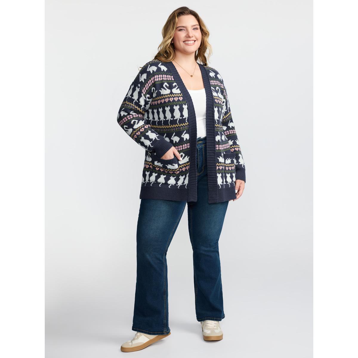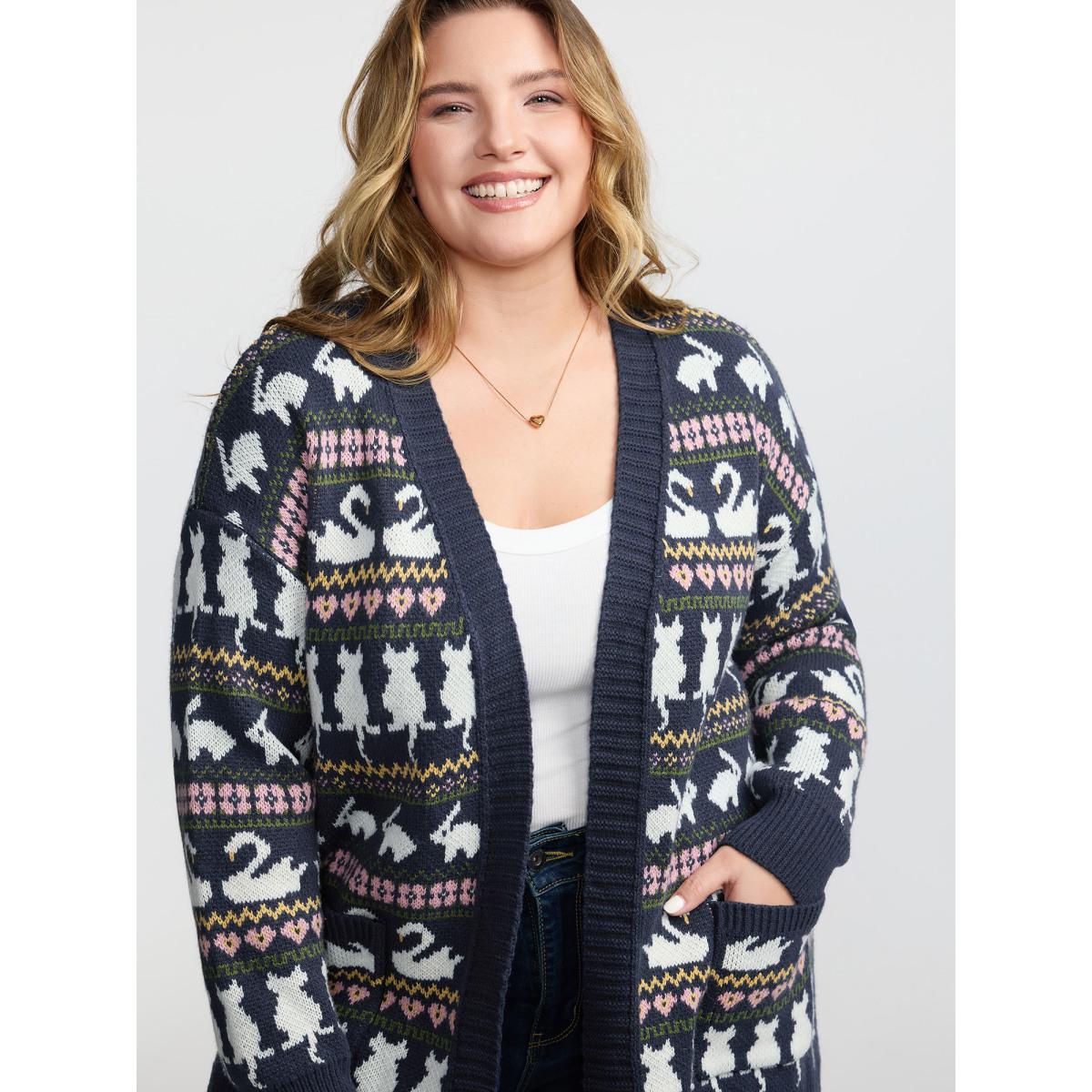Plus Size Animal Jacquard Pattern Pockets Knit Cardigan Indigo Women Playful Loose Long Sleeve Casual Cardigans BloomChic 18-20/2X