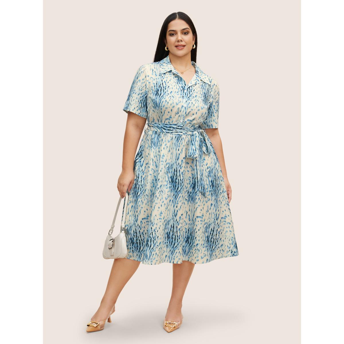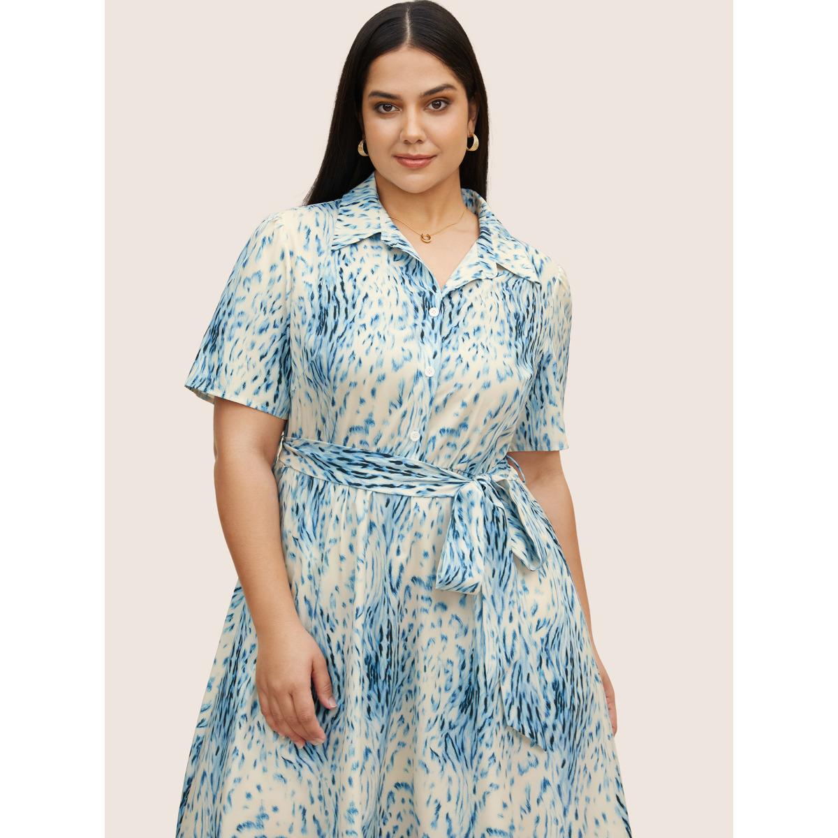 Plus Size Animal Print Shirt Collar Button Up Dress Blue Women At the Office Belted Shirt collar Short sleeve Curvy BloomChic 12/L