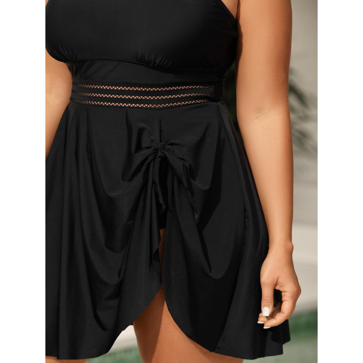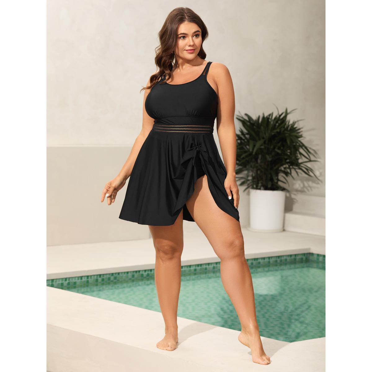 Plus Size Anti-Float Ties Webbed Split Hem Swim Dress Women's Swimwear Black Resort Bodycon U-neck High stretch Curve Swim Dresses BloomChic 30/6X