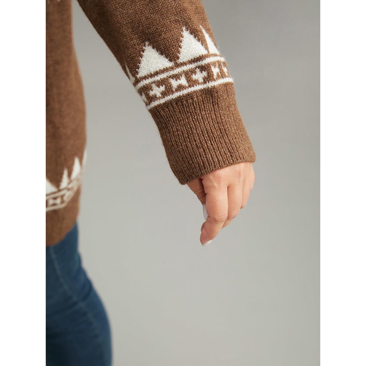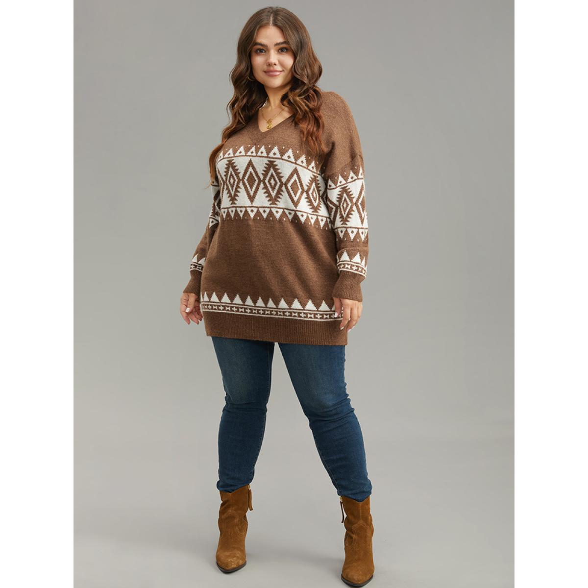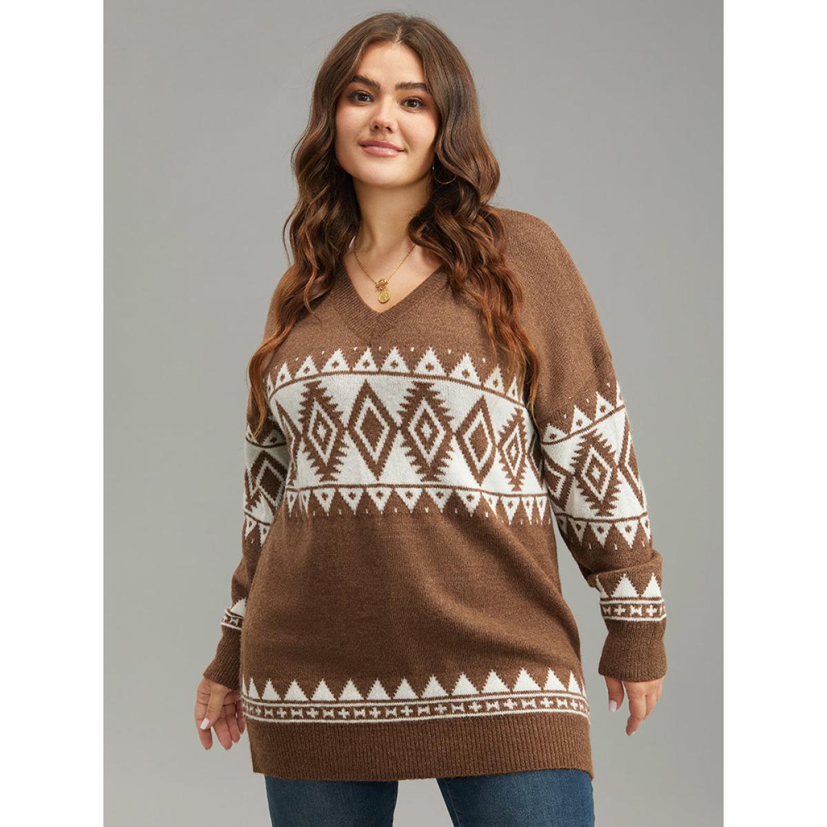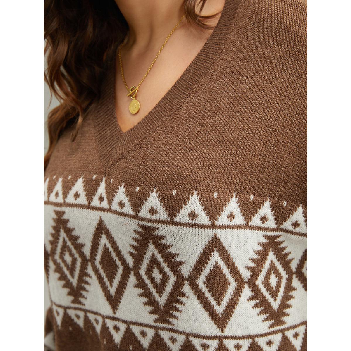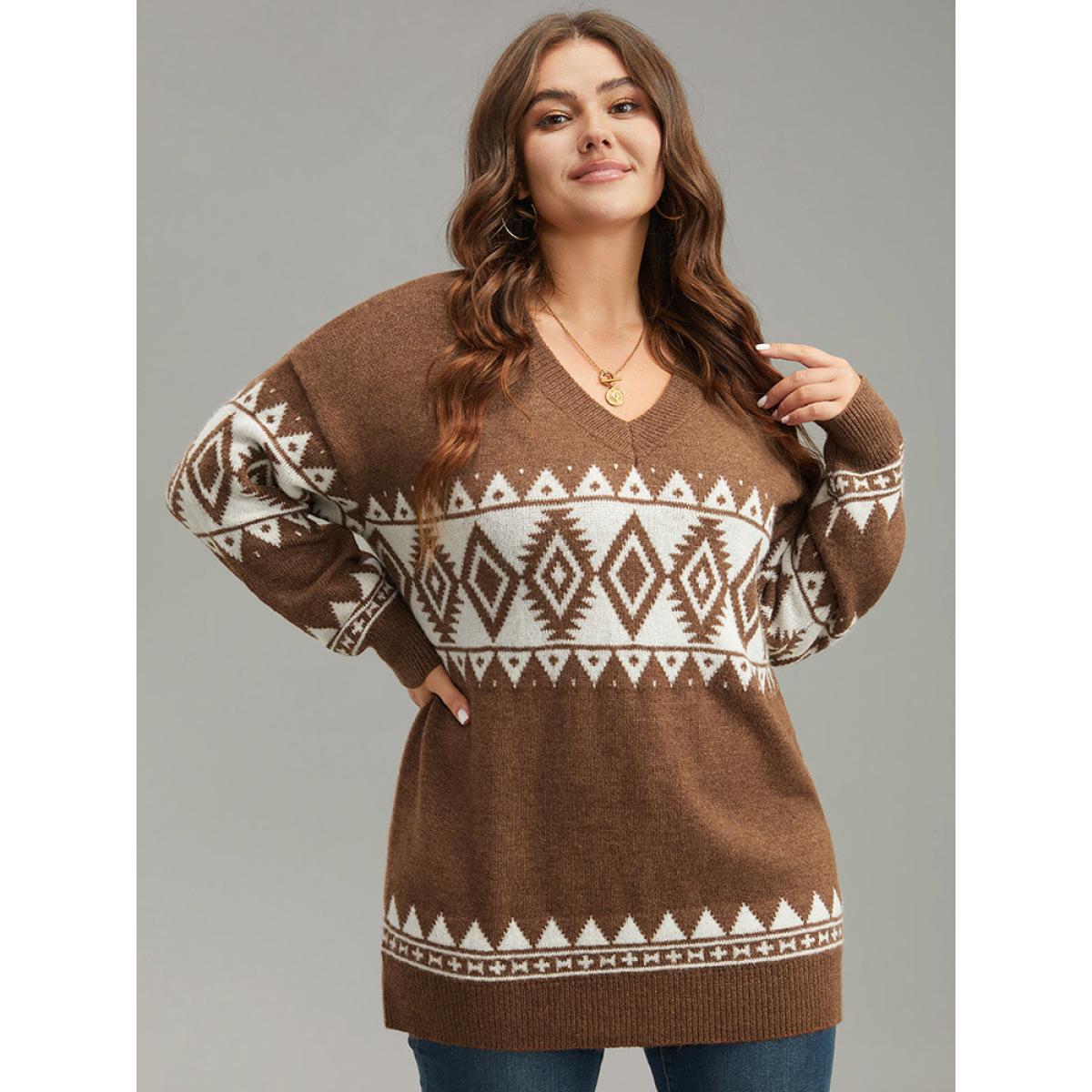 Plus Size Anti-Pilling Bandana Print V Neck Pullover Bronze Women Casual Loose Long Sleeve V-neck Everyday Pullovers BloomChic 28/5X
