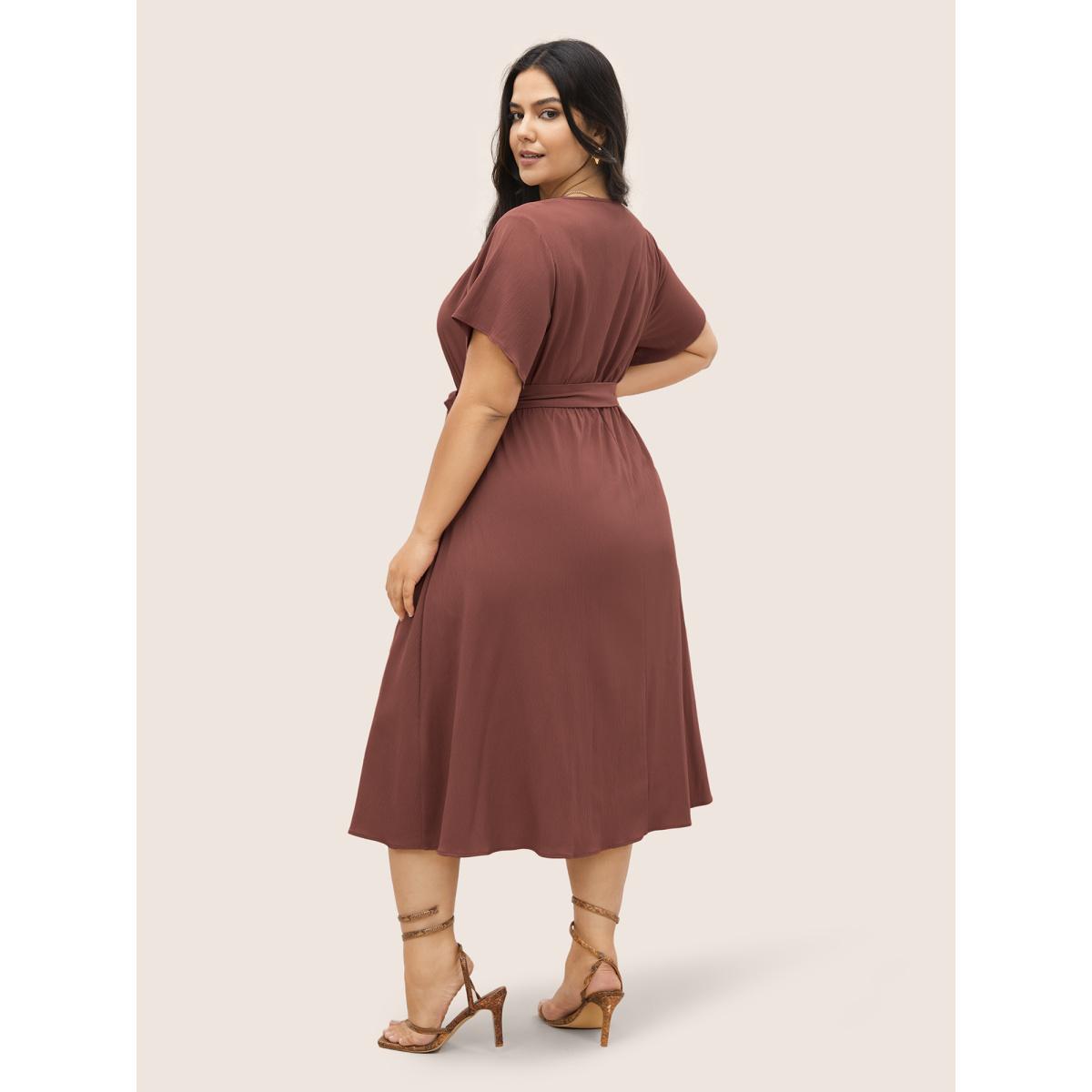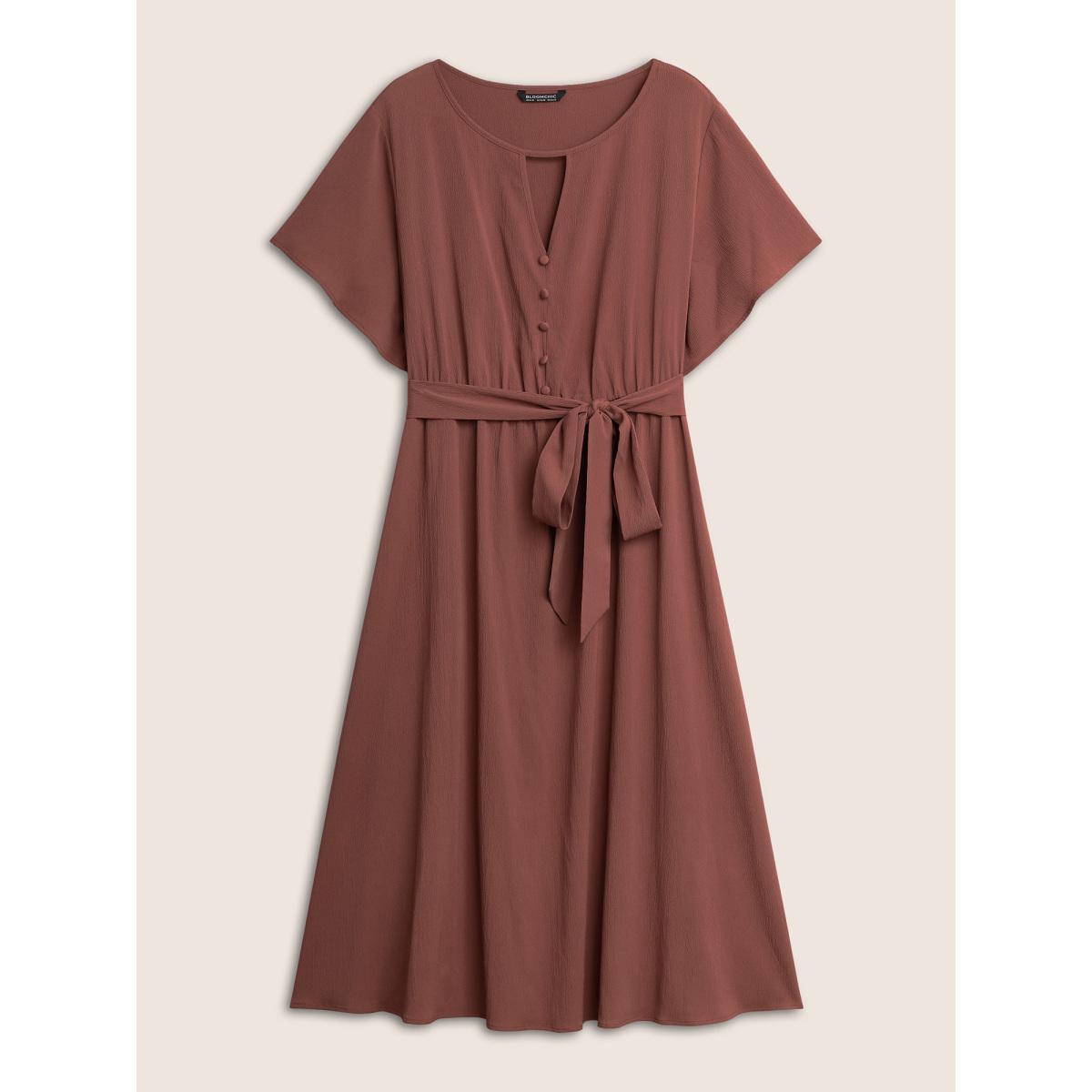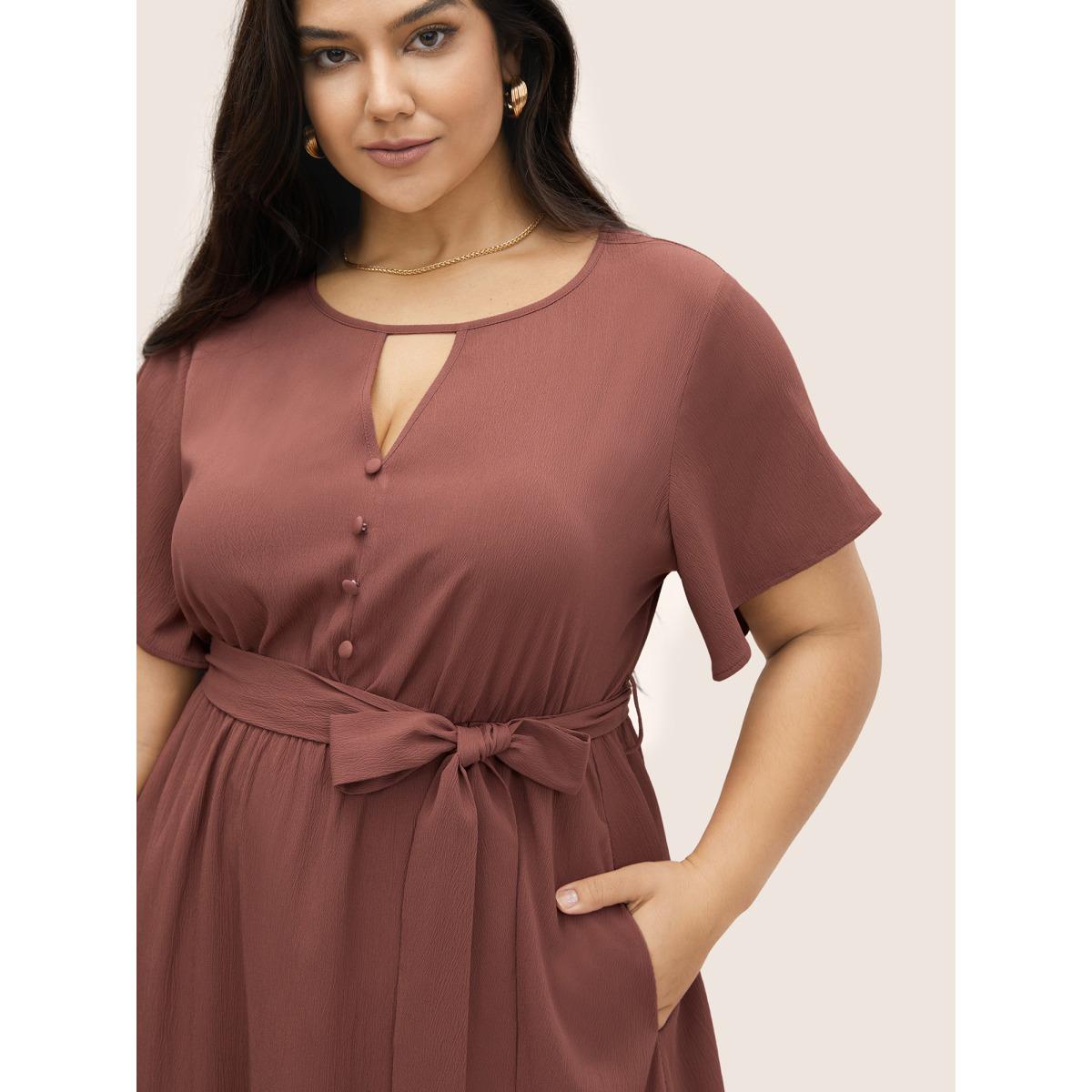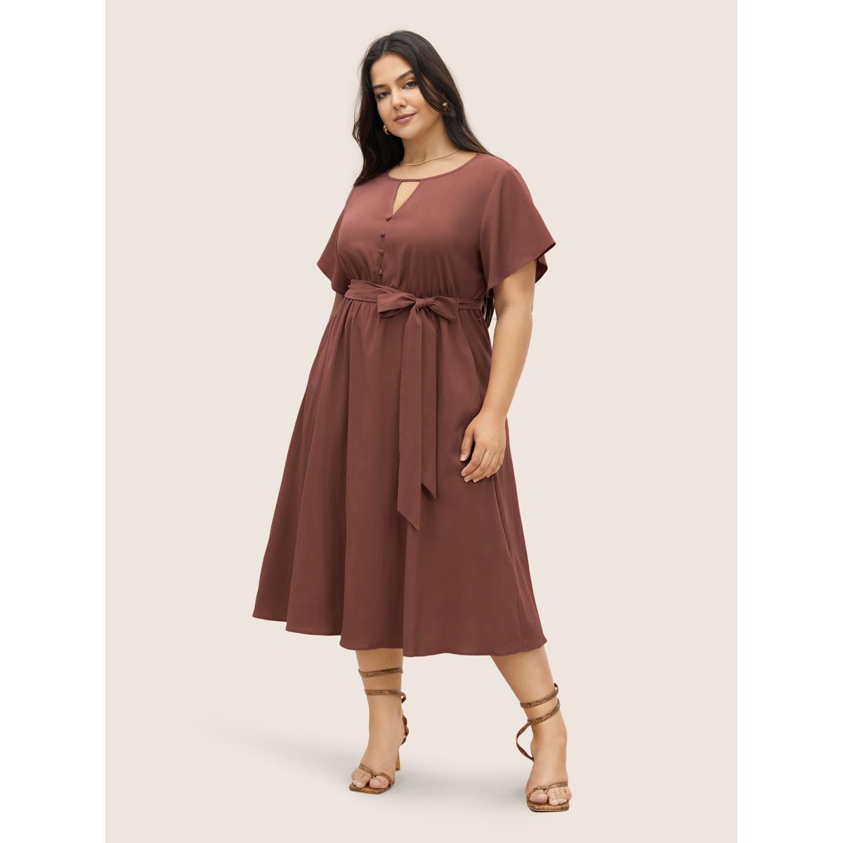 Plus Size Anti-Wrinkle Keyhole Button Detail Belted Dress Maroon Women At the Office Belted Round Neck Short sleeve Curvy Midi Dress BloomChic 30/6X