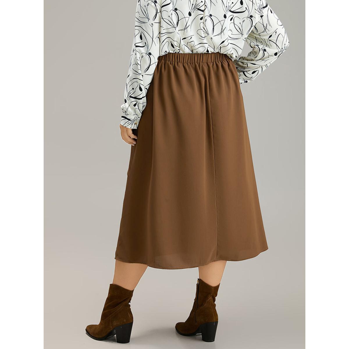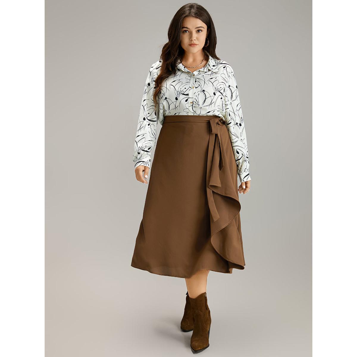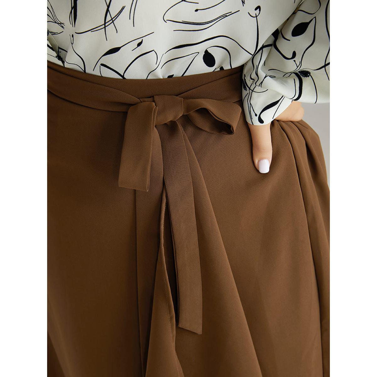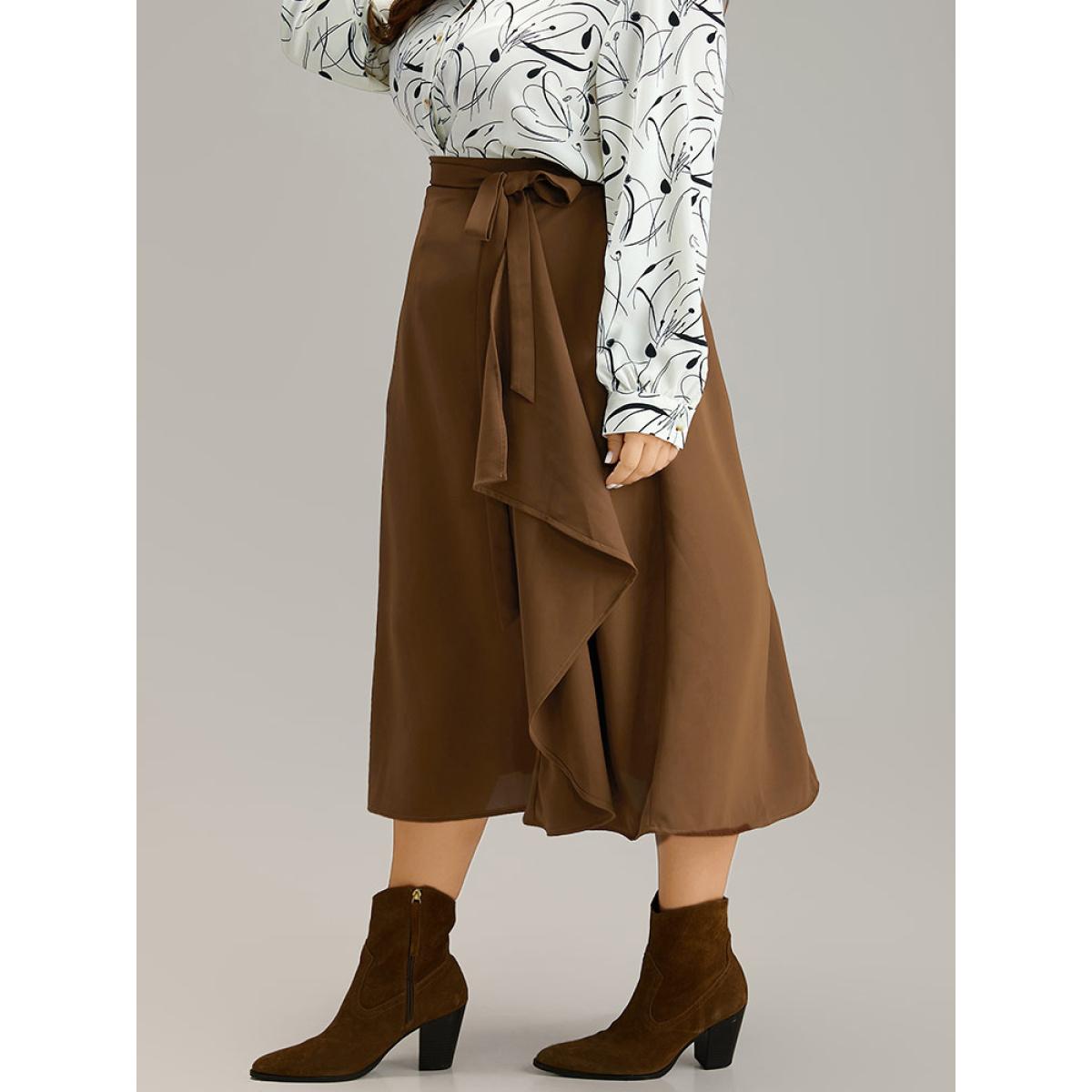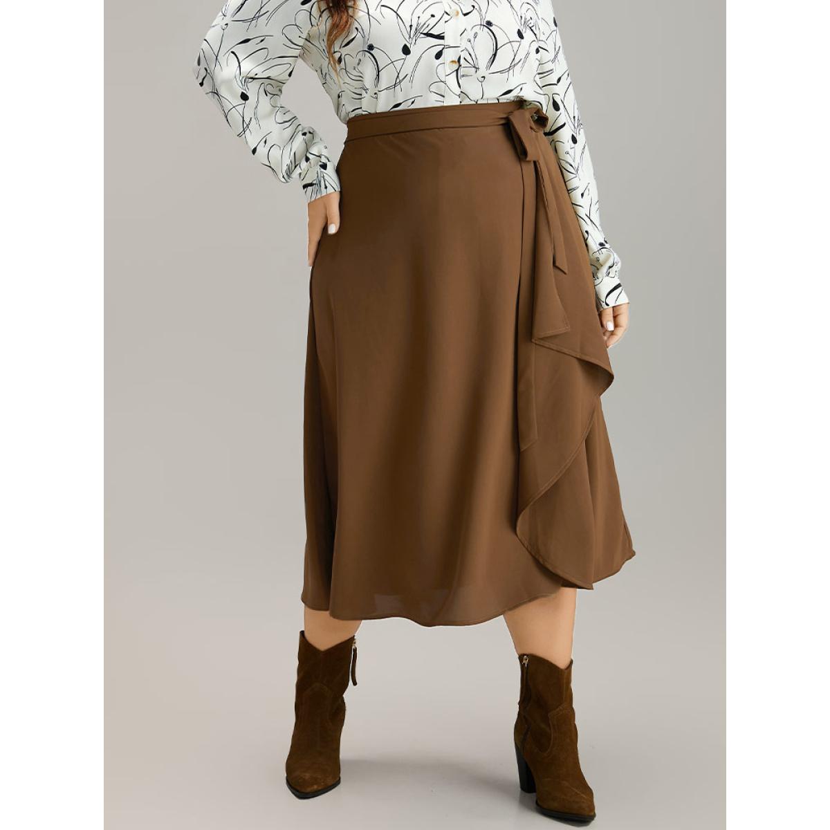 Plus Size Anti-Wrinkle Solid Asymmetrical Hem Ties Skirt Women Tan Office Cross straps Loose No stretch Belt Work Skirts BloomChic 10/M