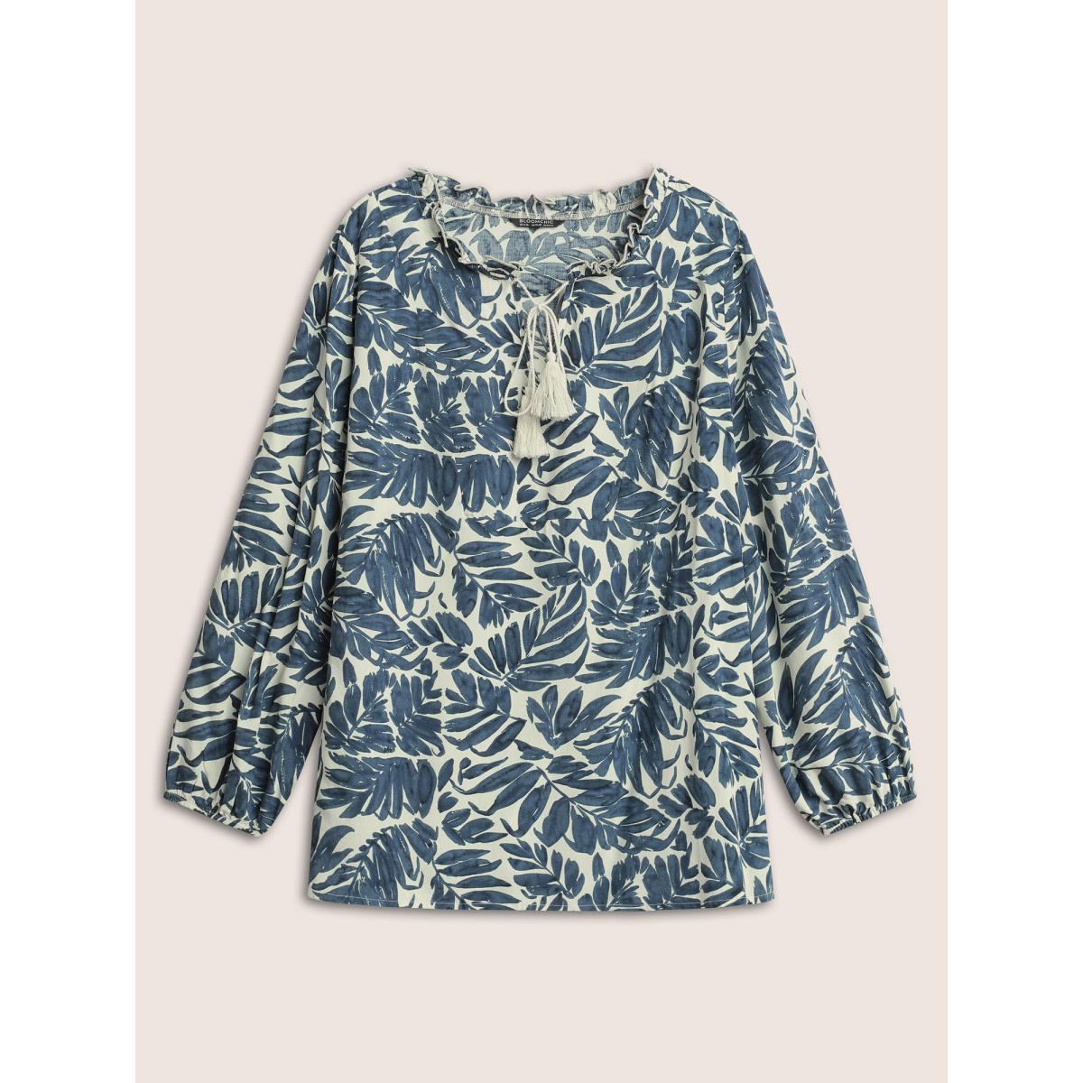 Plus Size Apricot Plants Tassel Trim Tie Neck Rayon Blouse Women Resort Long Sleeve Notched collar Vacation Blouses BloomChic 28/5X