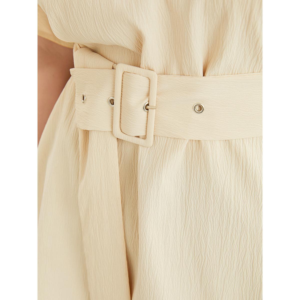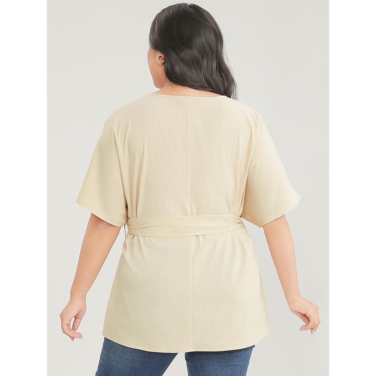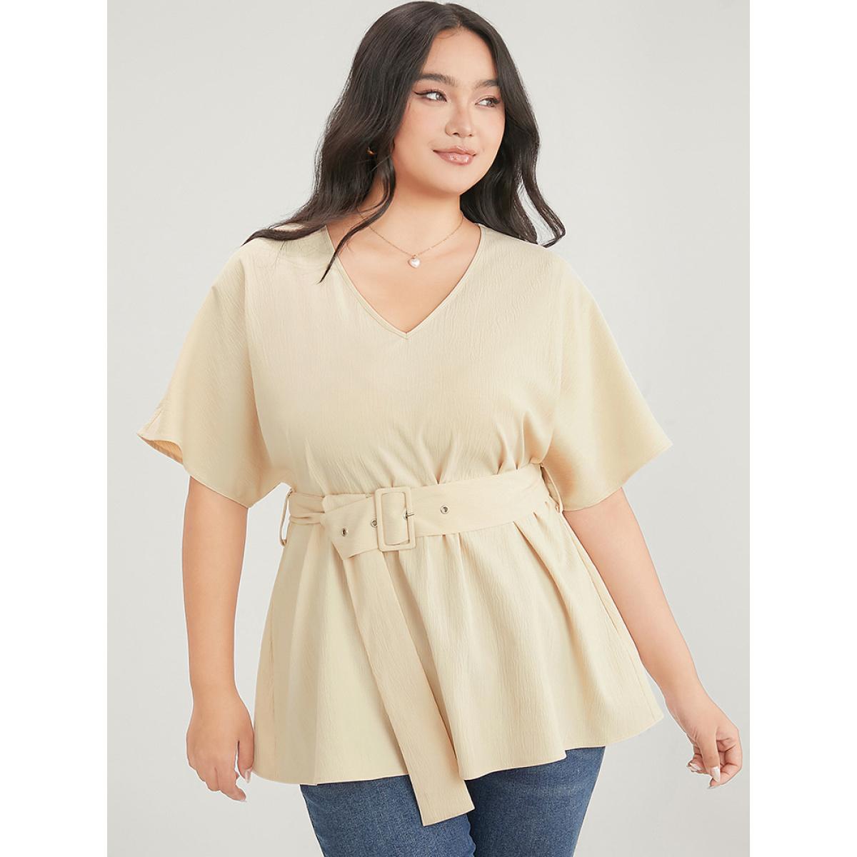 Plus Size Apricot Solid Dolman Sleeve Buckle Belted V Neck Blouse Women Office Short sleeve V-neck Dailywear Blouses BloomChic 22-24/3X