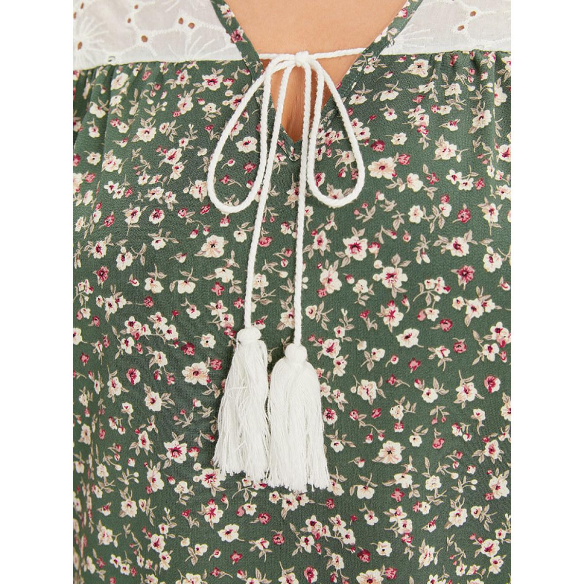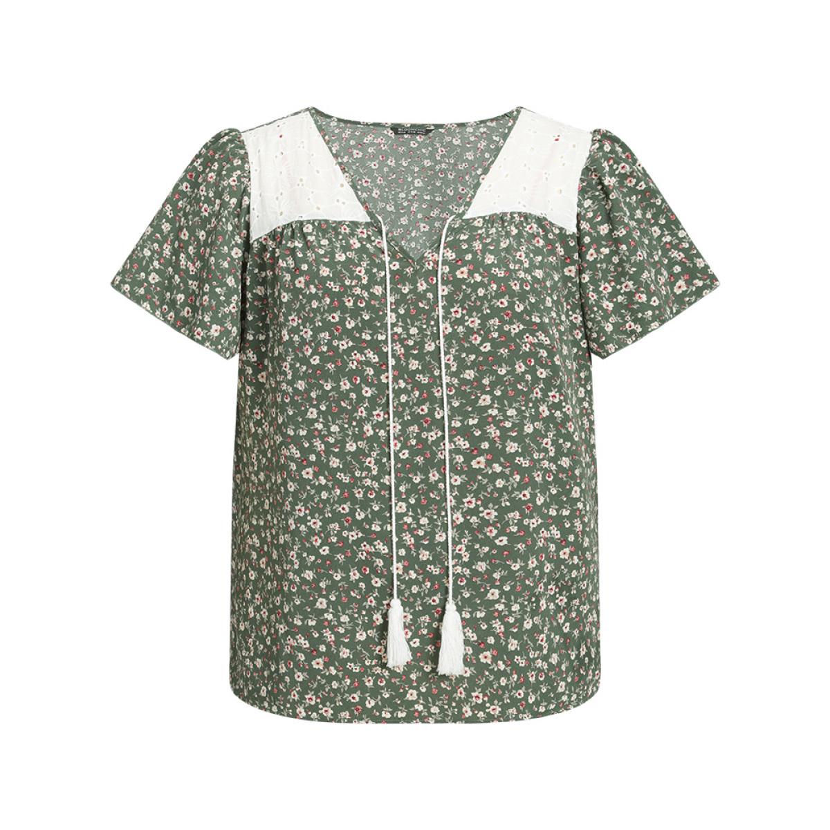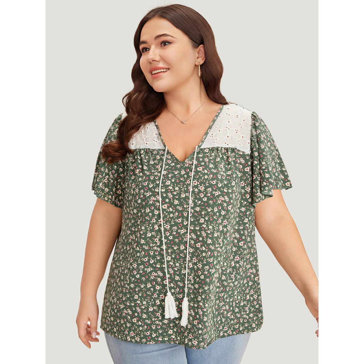 Plus Size ArmyGreen Ditsy Floral Patchwork Tassels Ties Flutter Sleeve Blouse Women Elegant Short sleeve V-neck Dailywear Blouses BloomChic 22-24/3X