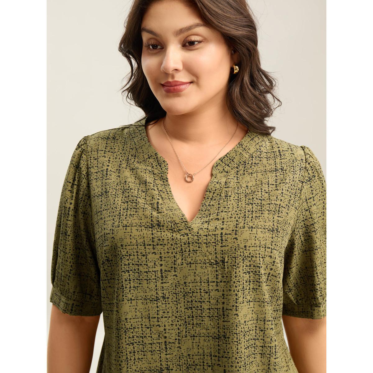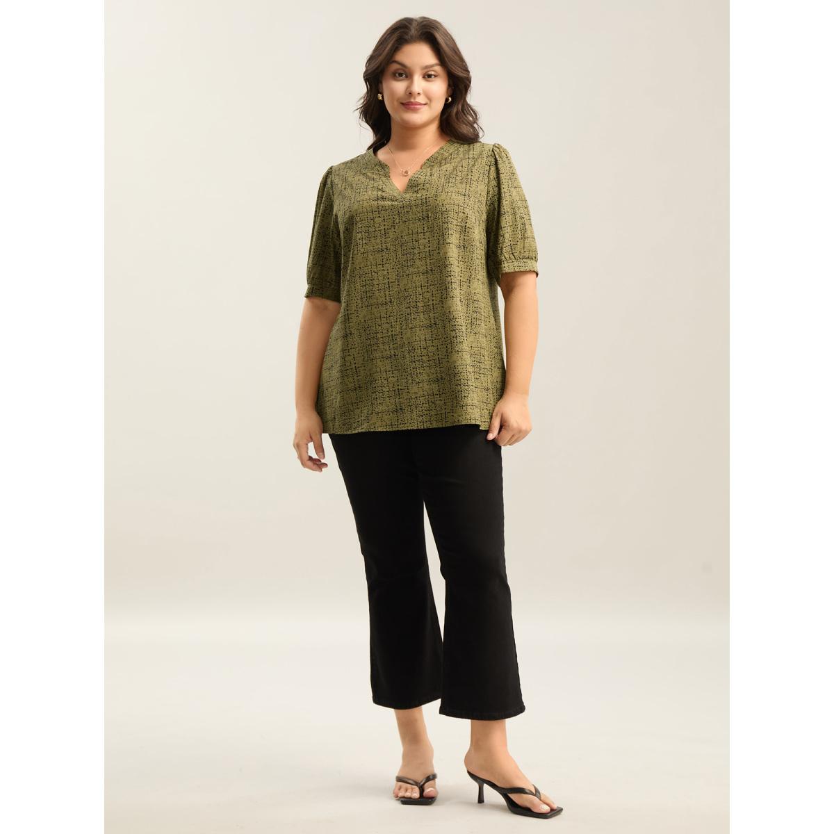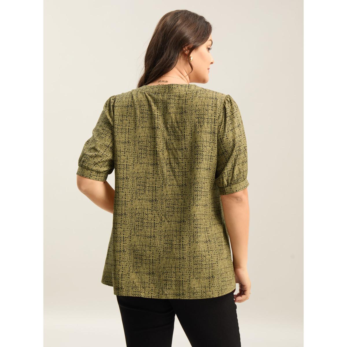 Plus Size ArmyGreen Geometric Print Puff Sleeve Blouse Women Elegant Short sleeve Flat collar with V-notch Everyday Blouses BloomChic 18-20/2X