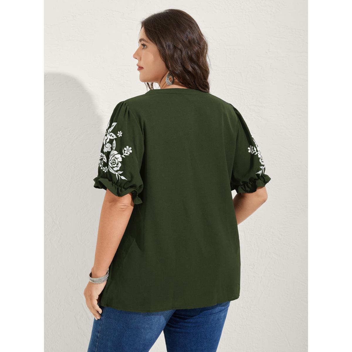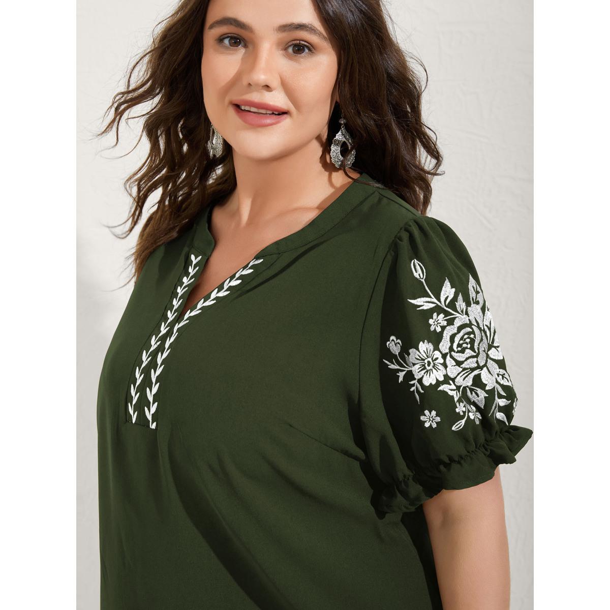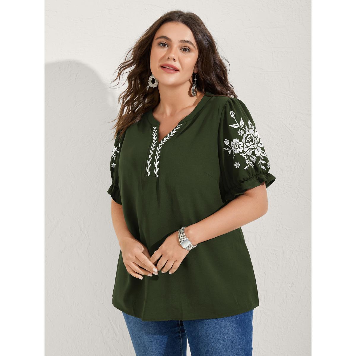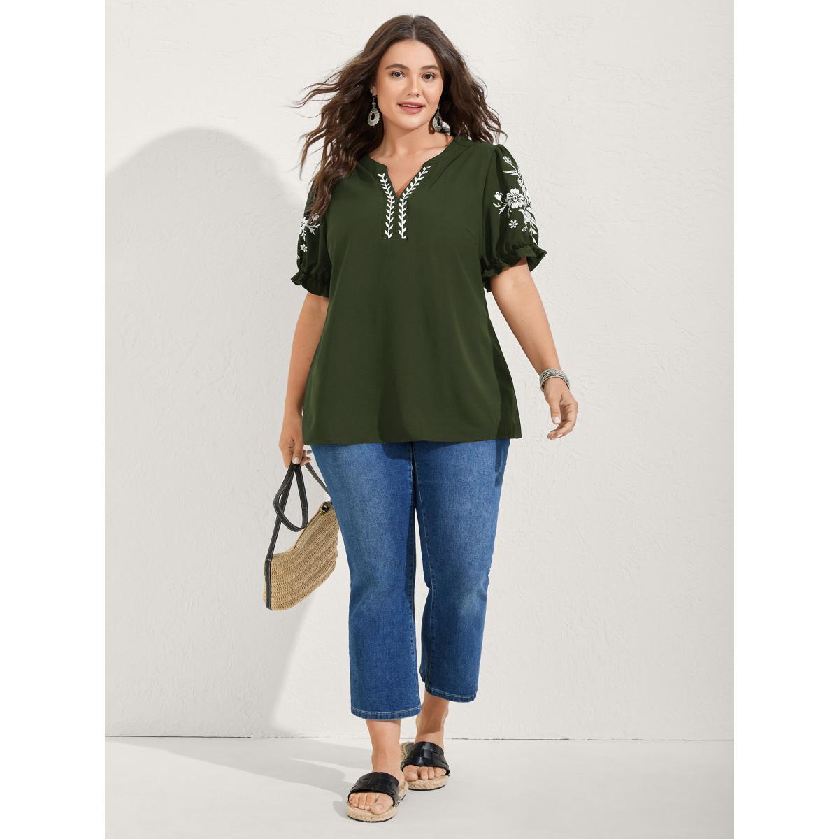Plus Size ArmyGreen Notched Collar Embroidered Ruffled Blouse Women Boho Half Sleeve Flat collar with V-notch Vacation Blouses BloomChic 14-16/1X
