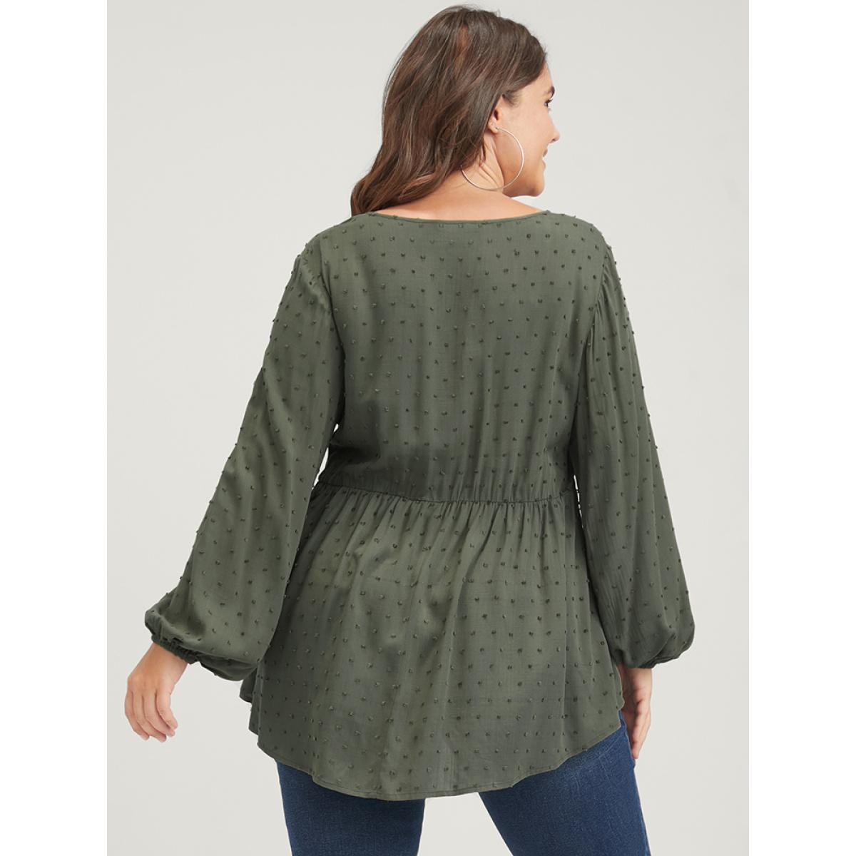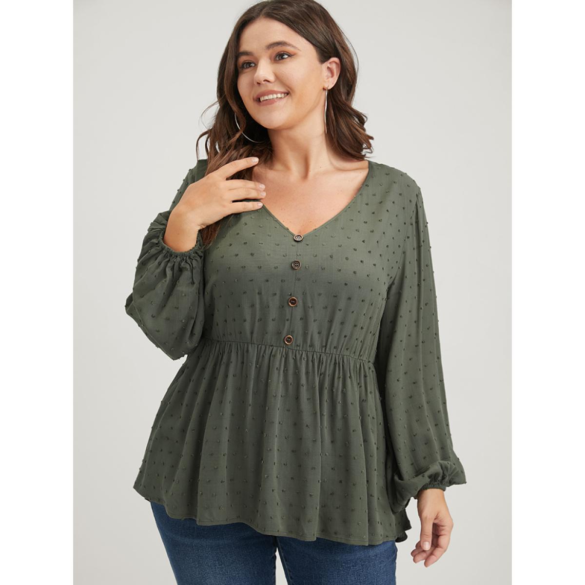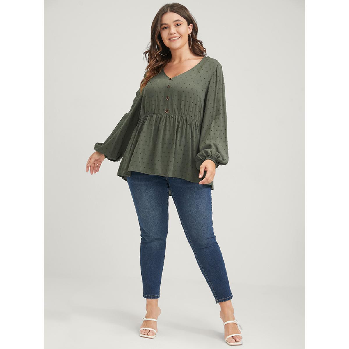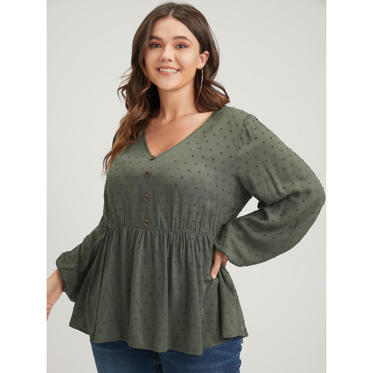 Plus Size ArmyGreen Polka Dot Flutter Button Detail Lantern Sleeve Blouse Women Leisure V-neck Casual Blouses BloomChic 30/6X