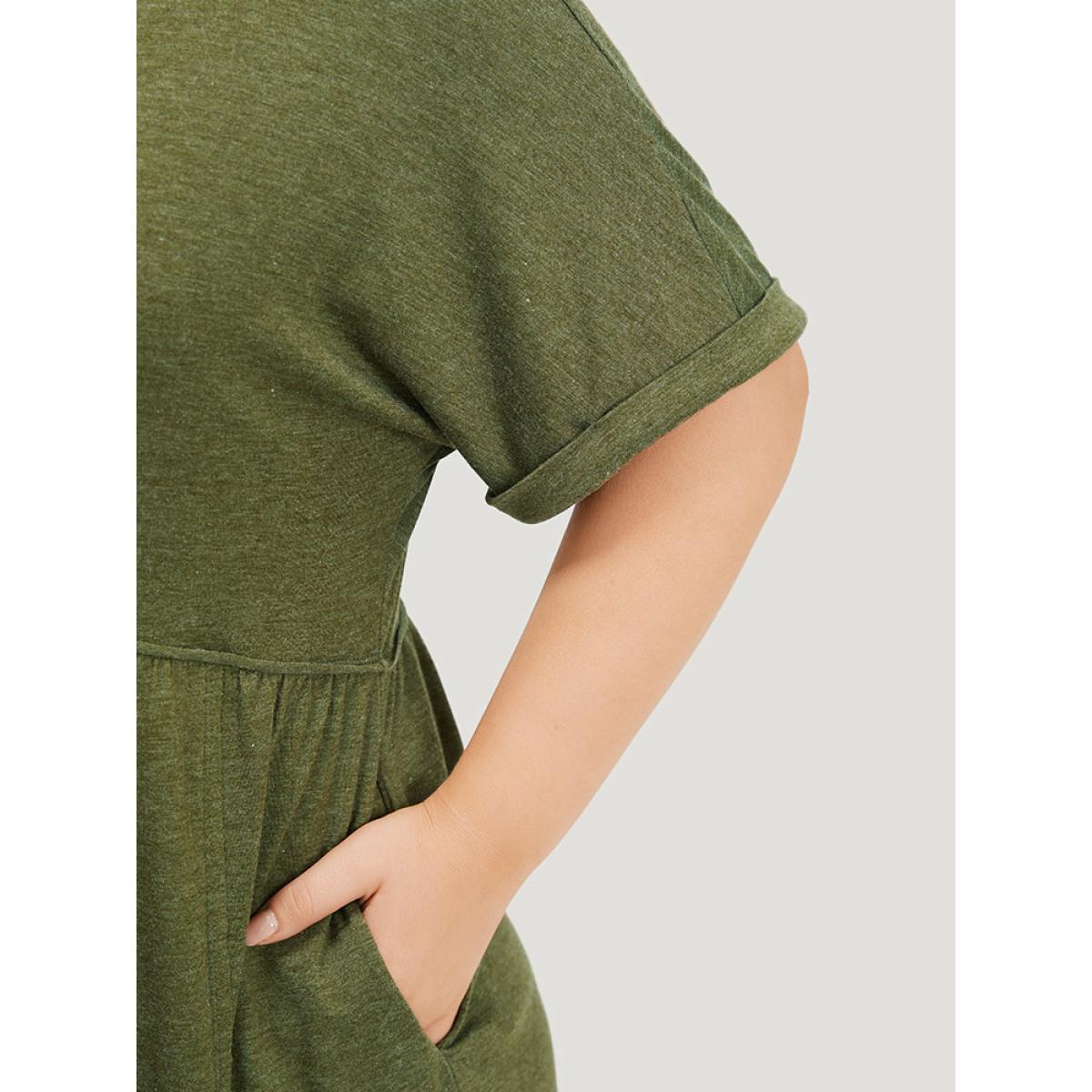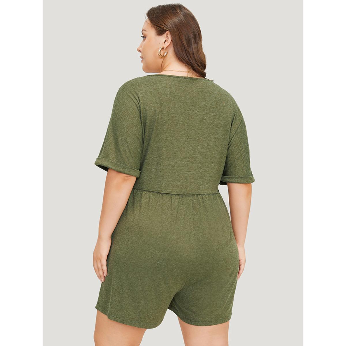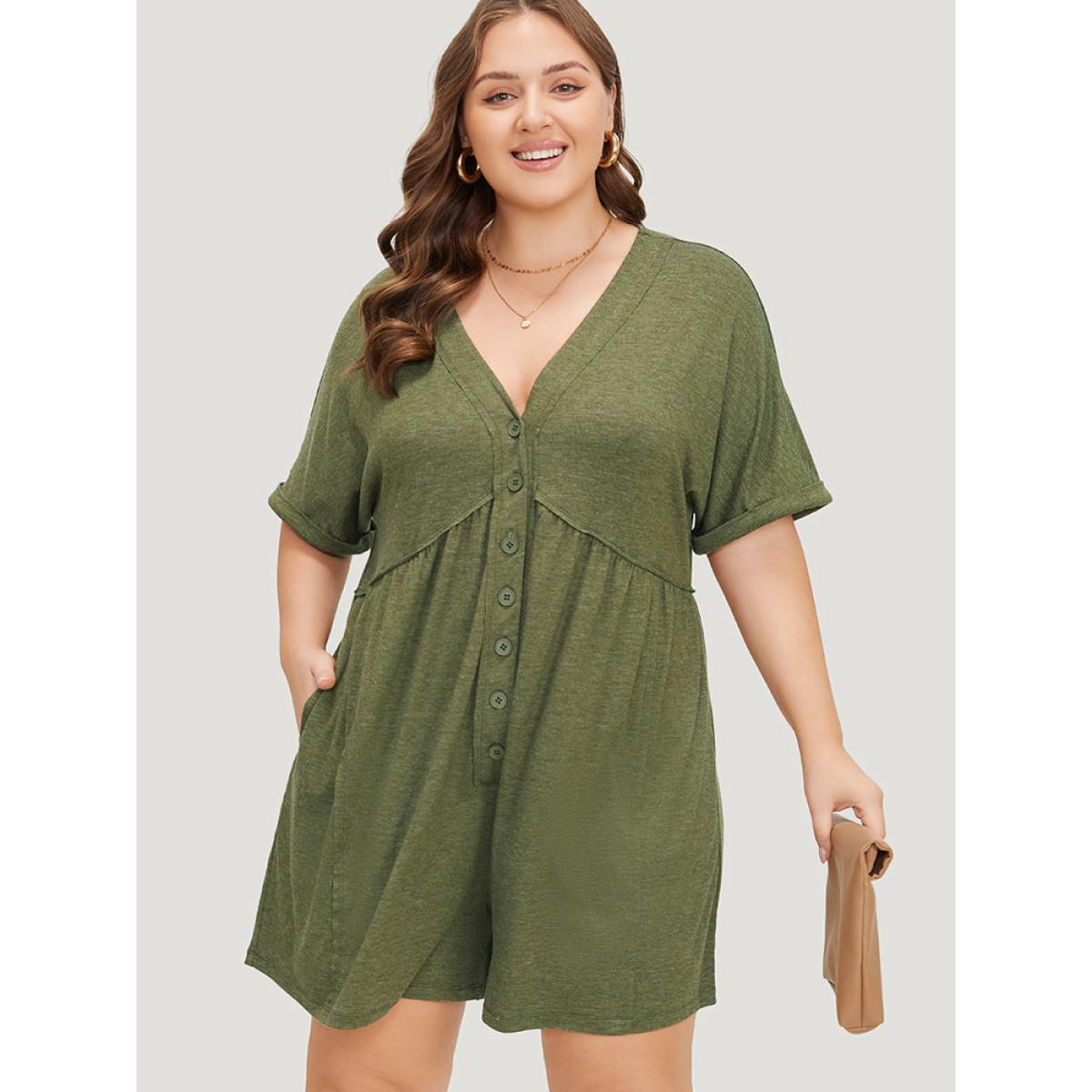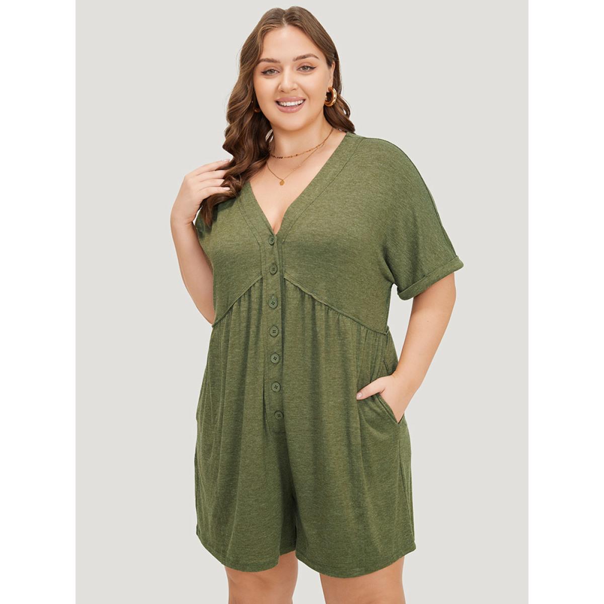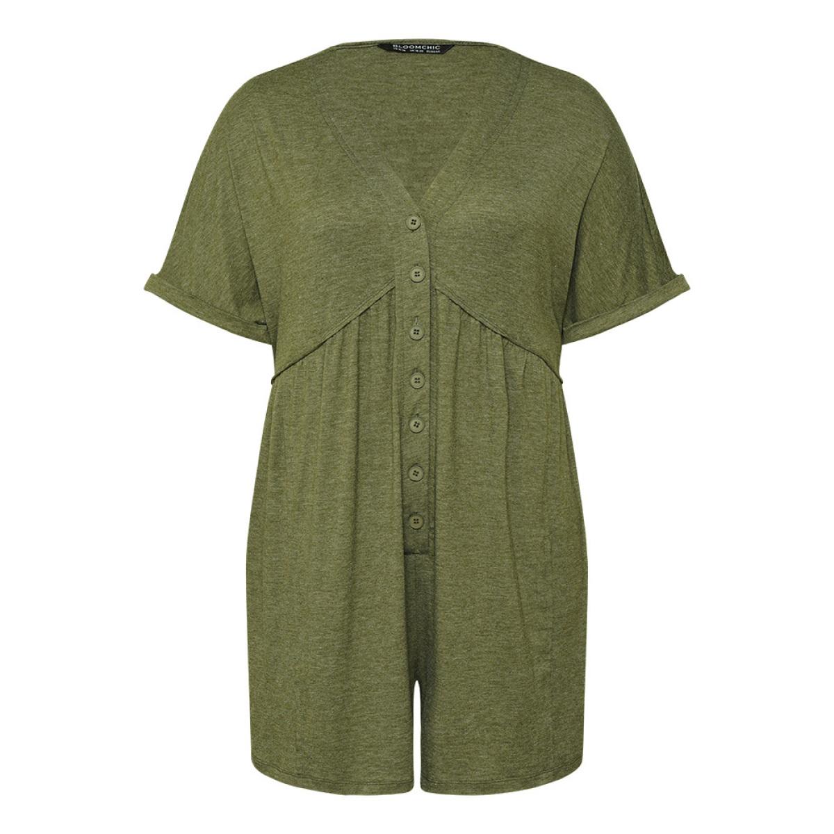 Plus Size ArmyGreen Solid Button Through Pocket Cuffed Batwing Sleeve Romper Women Casual Short sleeve V-neck Dailywear Loose Jumpsuits BloomChic 14-16/1X