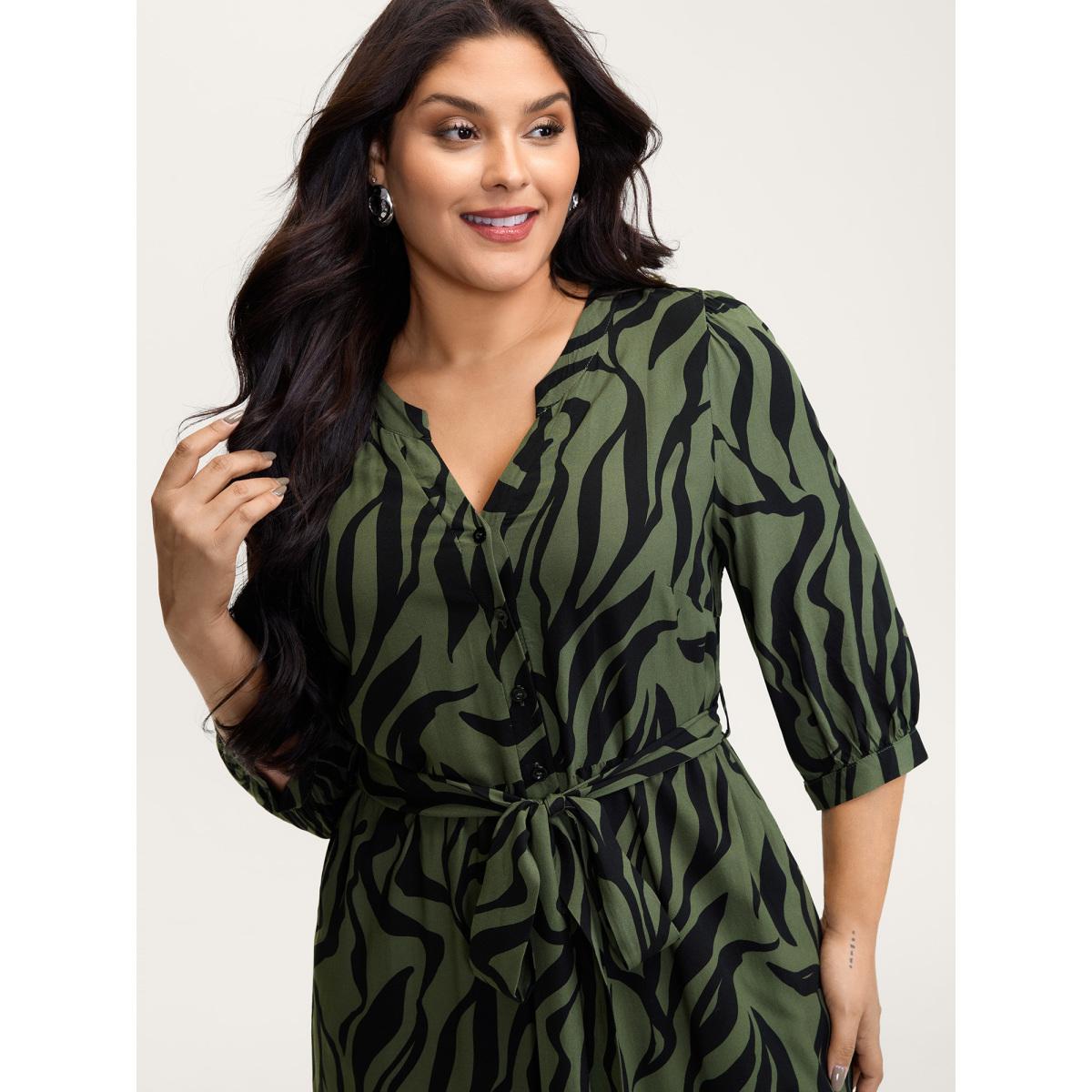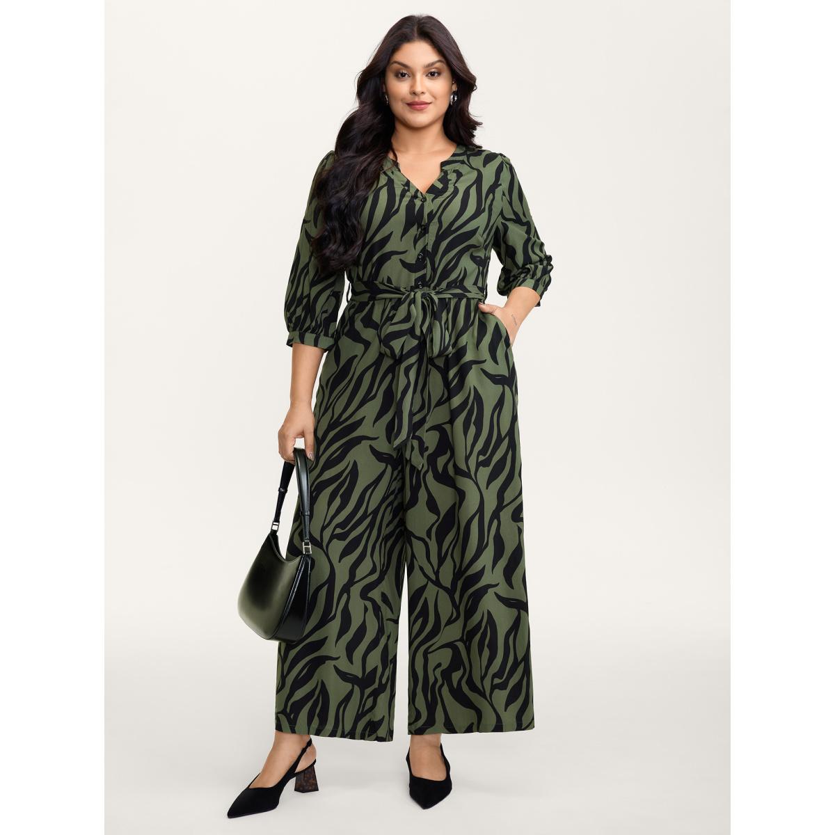 Plus Size ArmyGreen Zebra Print Stretchy Belted Waist Jumpsuit Women Office Elbow-length sleeve Flat collar with V-notch Office Loose Jumpsuits BloomChic 18-20/2X