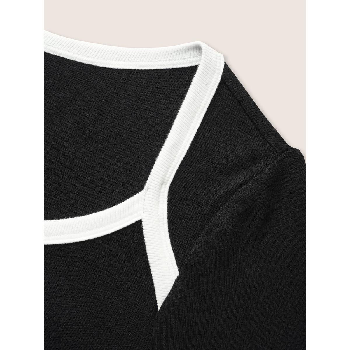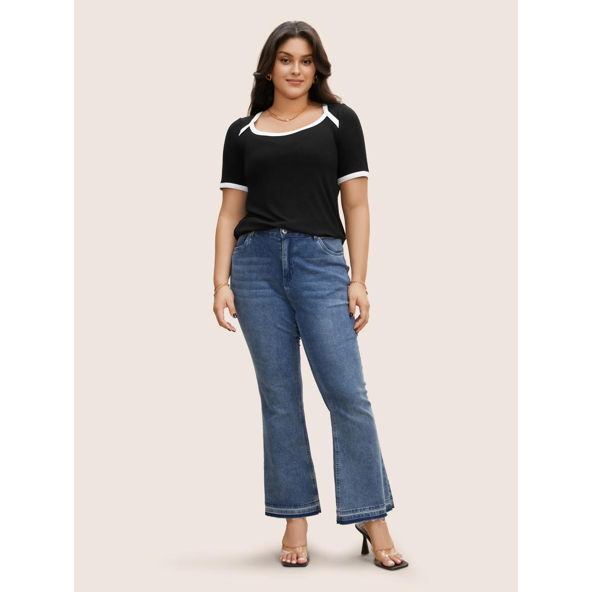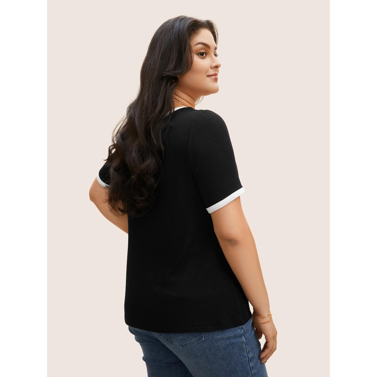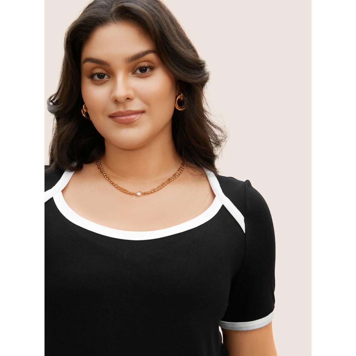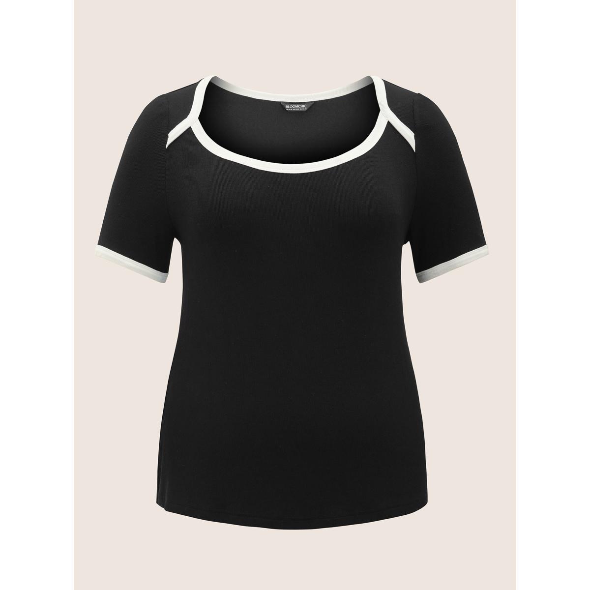 Plus Size Asymmetrical Neck Contrast Trim Pit Strip T-shirt Black Women Elegant Contrast Asymmetrical Neck Bodycon Everyday T-shirts BloomChic 30/6X