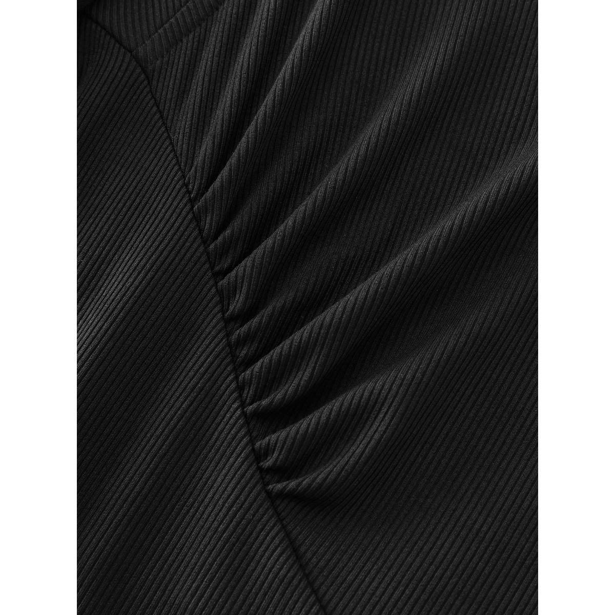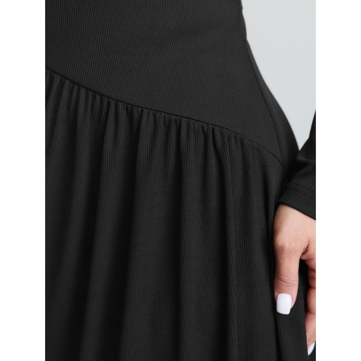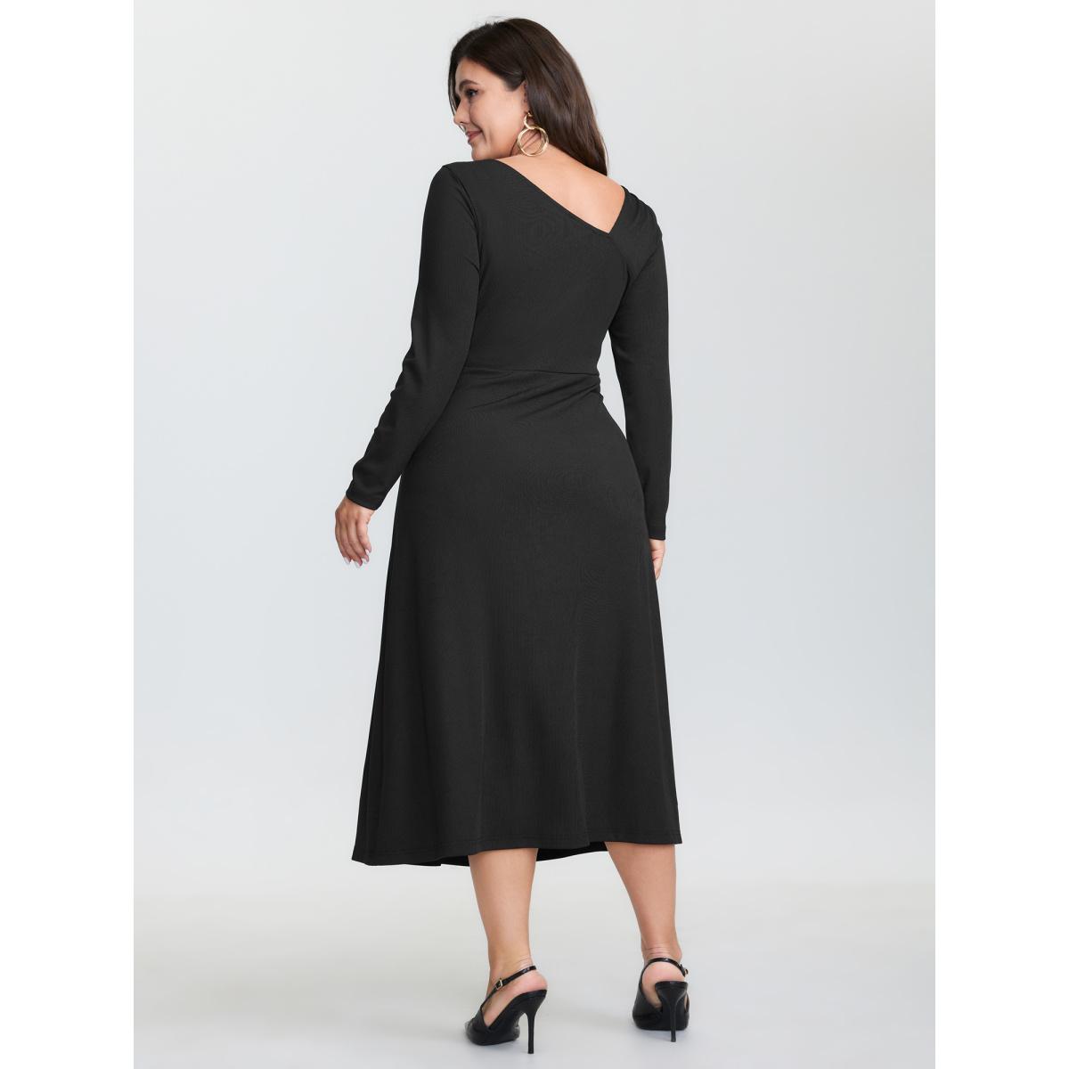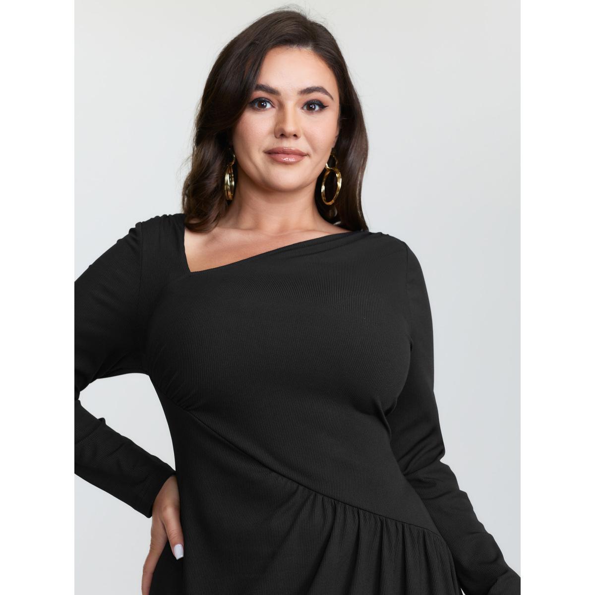Plus Size Asymmetrical Neckline Draped Knit Midi Dress Black Women Timeless Gathered Asymmetrical Neck Long Sleeve Curvy BloomChic 10/M