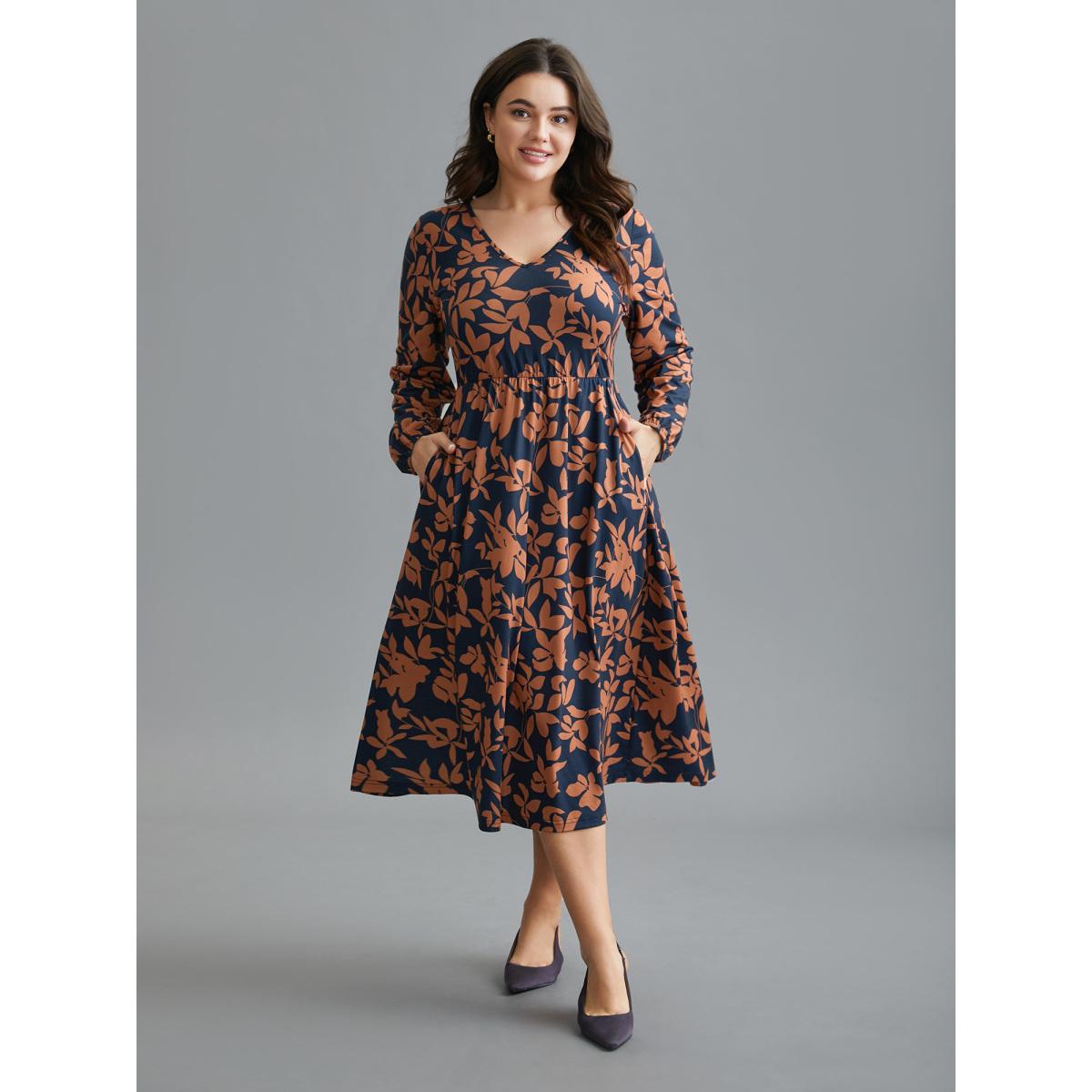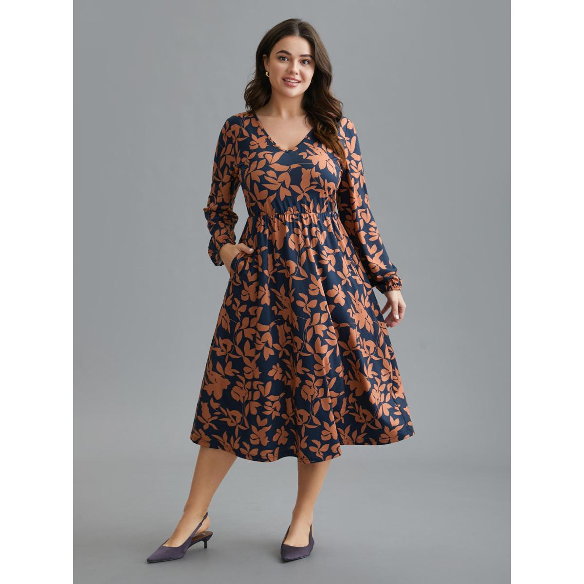Plus Size Autumn Leaves Print Fit-and-Flare Midi Dress DarkBlue Women Elegant Non Knit Dresses Bloomchic 26/4X