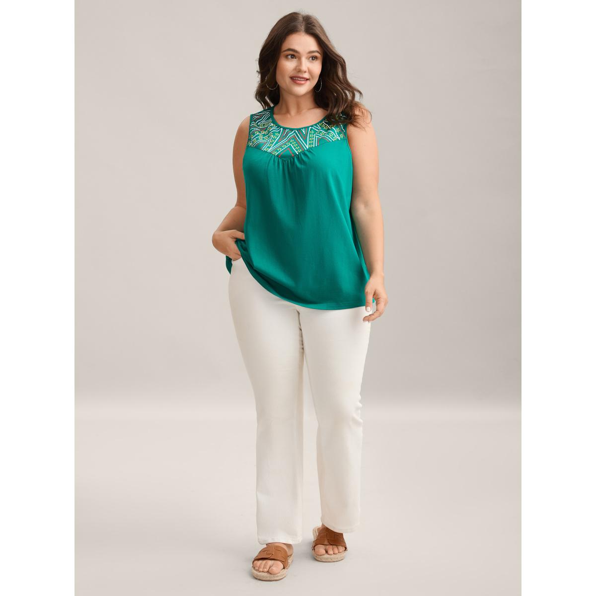 Plus Size Bamboo Cotton Stretchy 3D Print Tank Top Women Teal Gathered Round Neck Vacation Tank Tops Camis BloomChic 18-20/2X