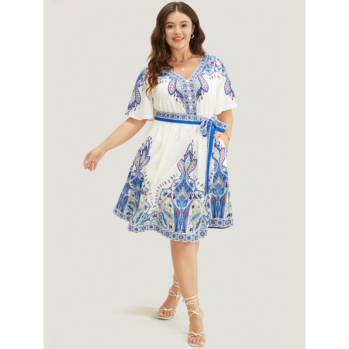 Plus Size Bandana Button Detail Pocket Belt Knee Dress Blue Women Vacation Lined V-neck Short sleeve Curvy Knee Dress BloomChic 28/5X Product Image