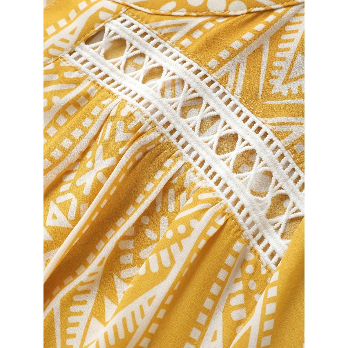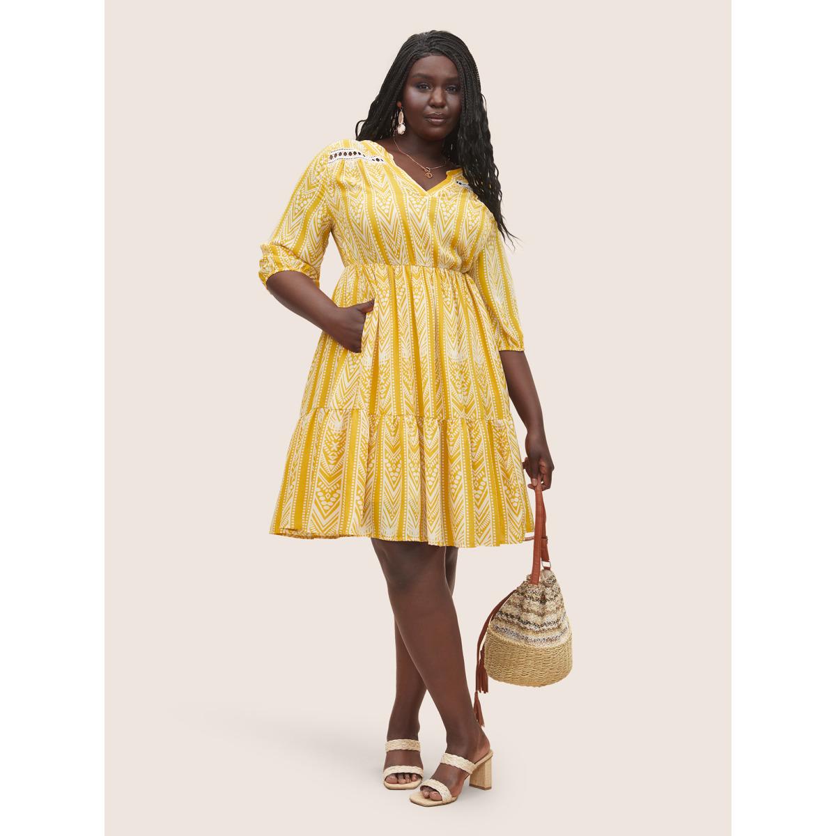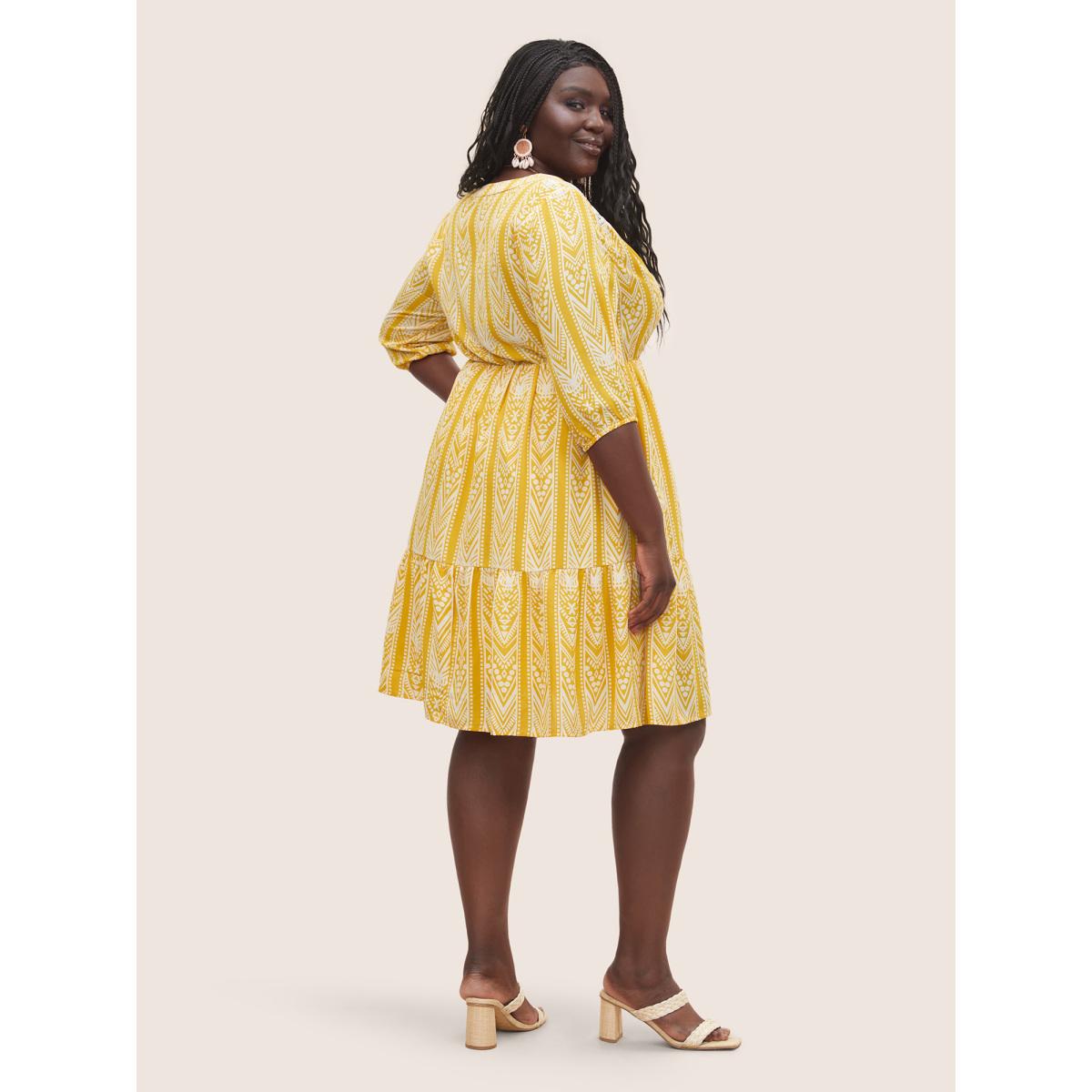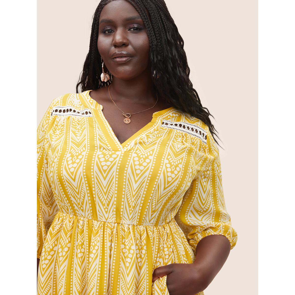 Plus Size Bandana Geometric Notched Cut Out Dress Yellow Women Resort Non Notched collar Elbow-length sleeve Curvy Midi Dress BloomChic 18-20/2X