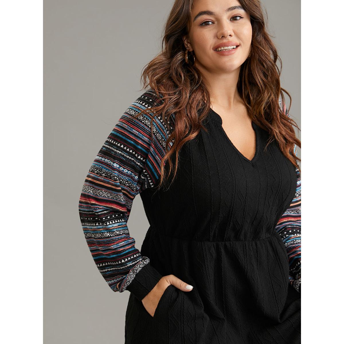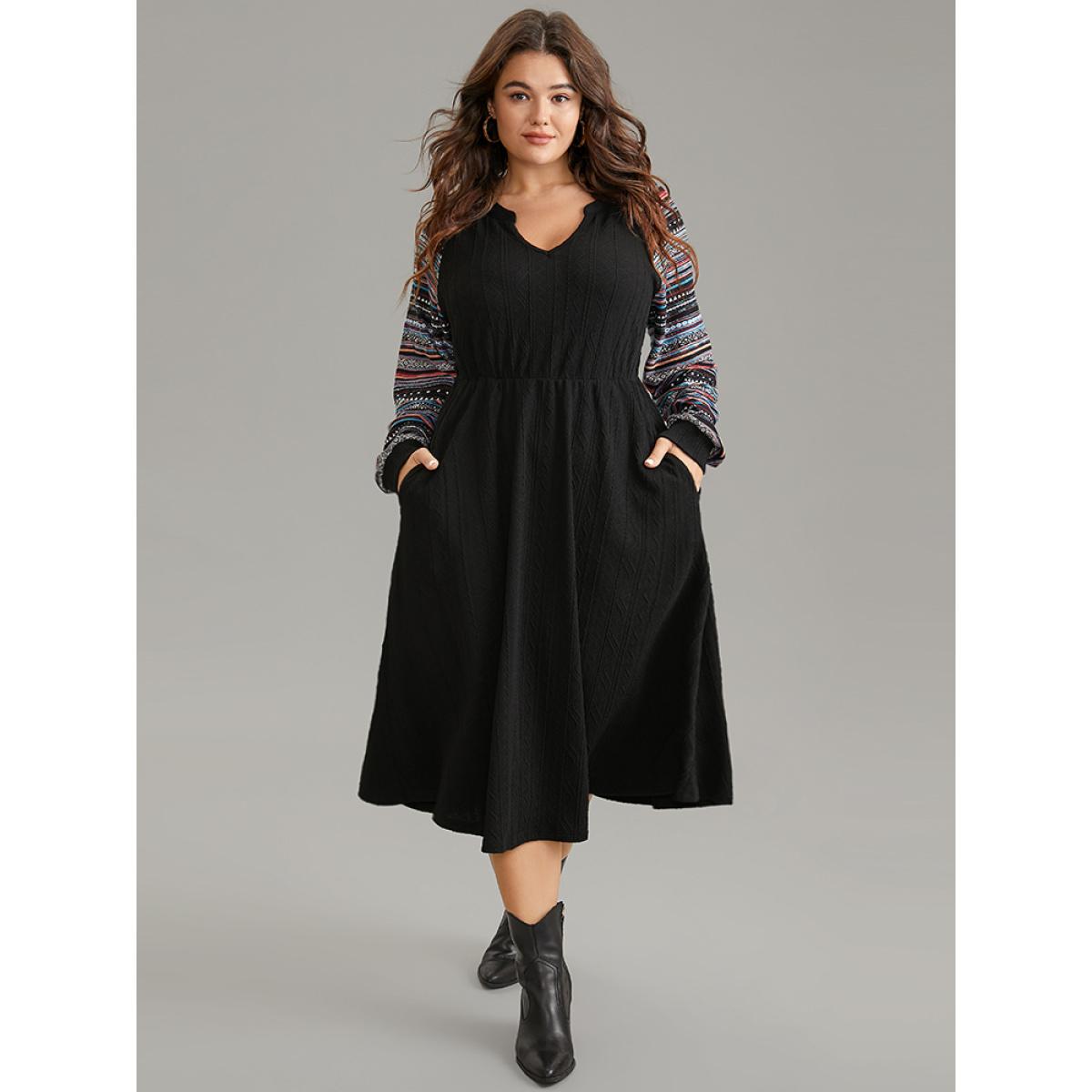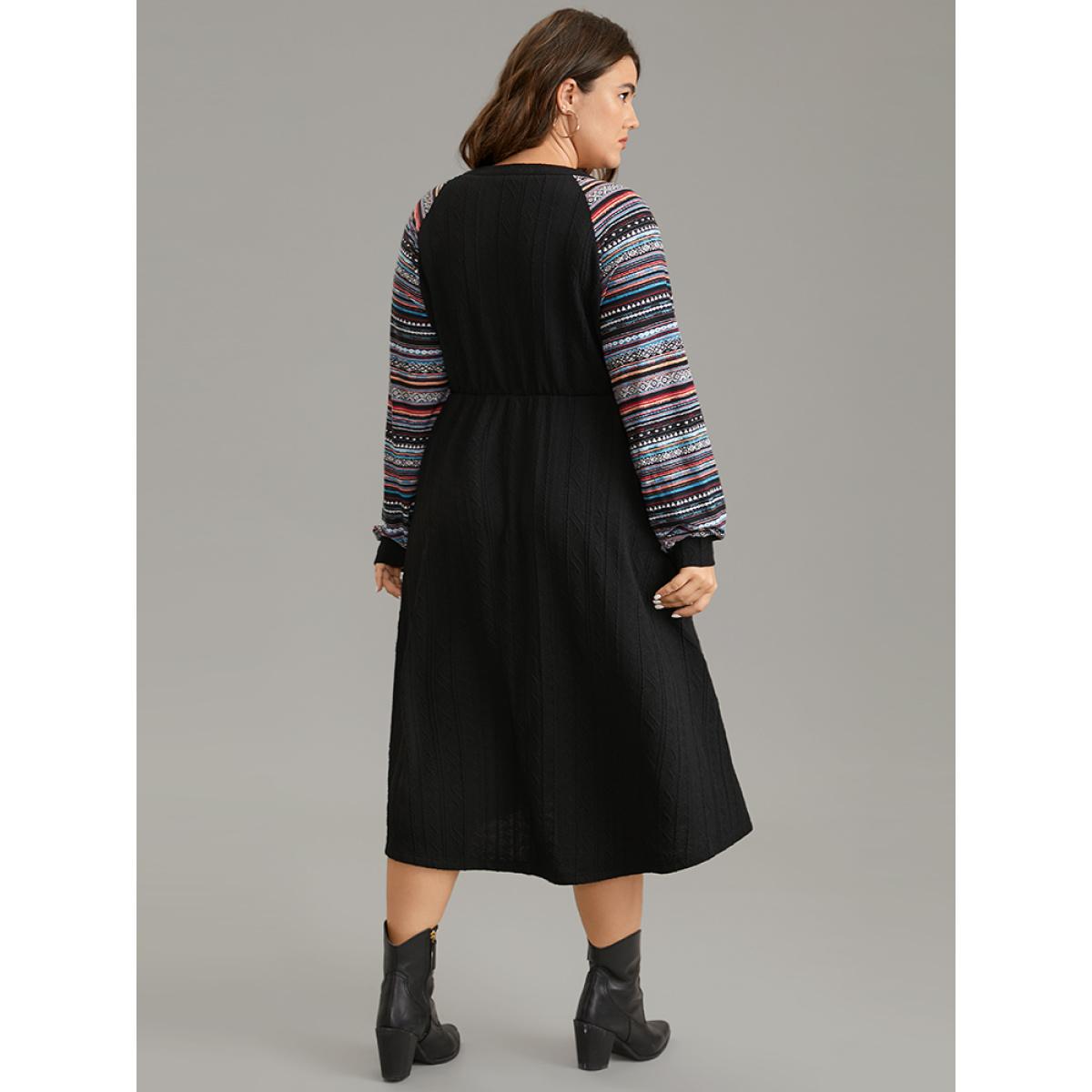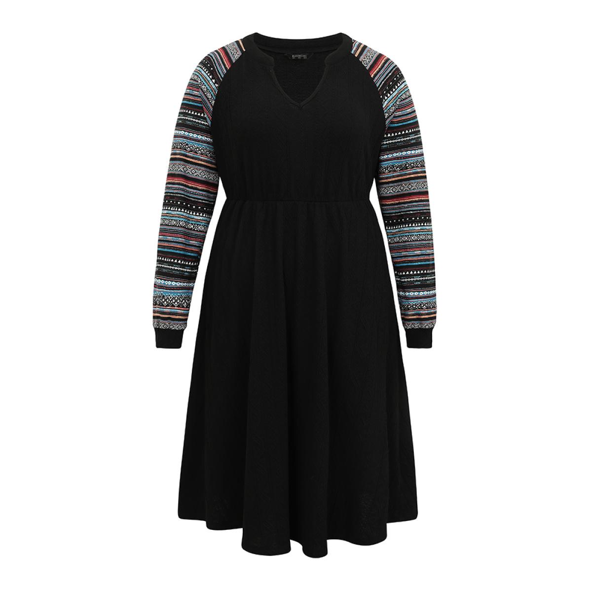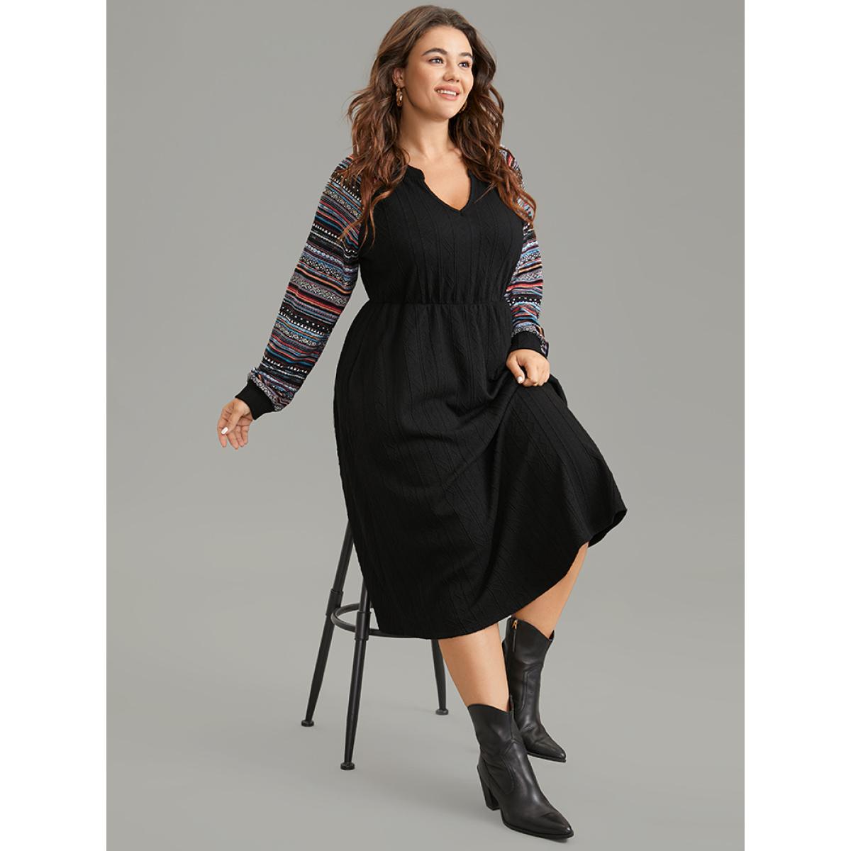 Plus Size Bandana Patchwork Elastic Waist Notched Dress DarkBlue Women Casual Printed Notched collar Long Sleeve Curvy Midi Dress BloomChic 12/L