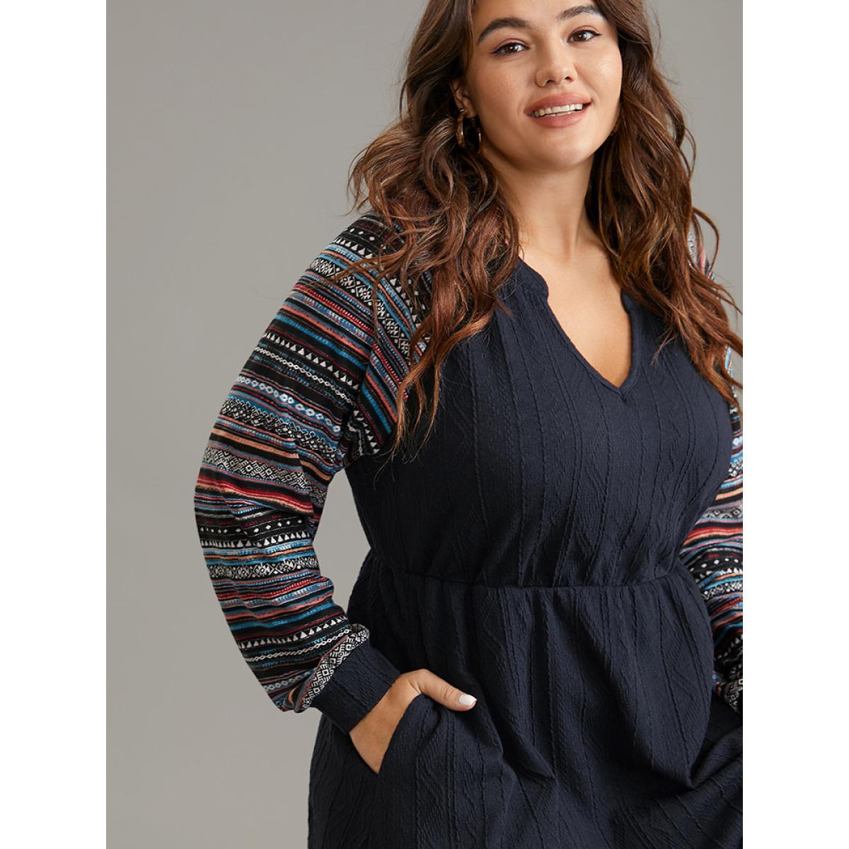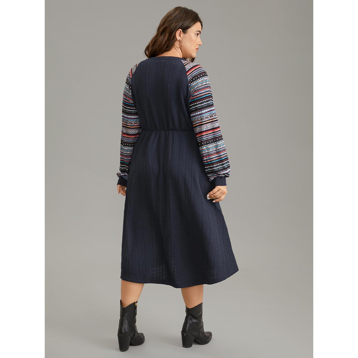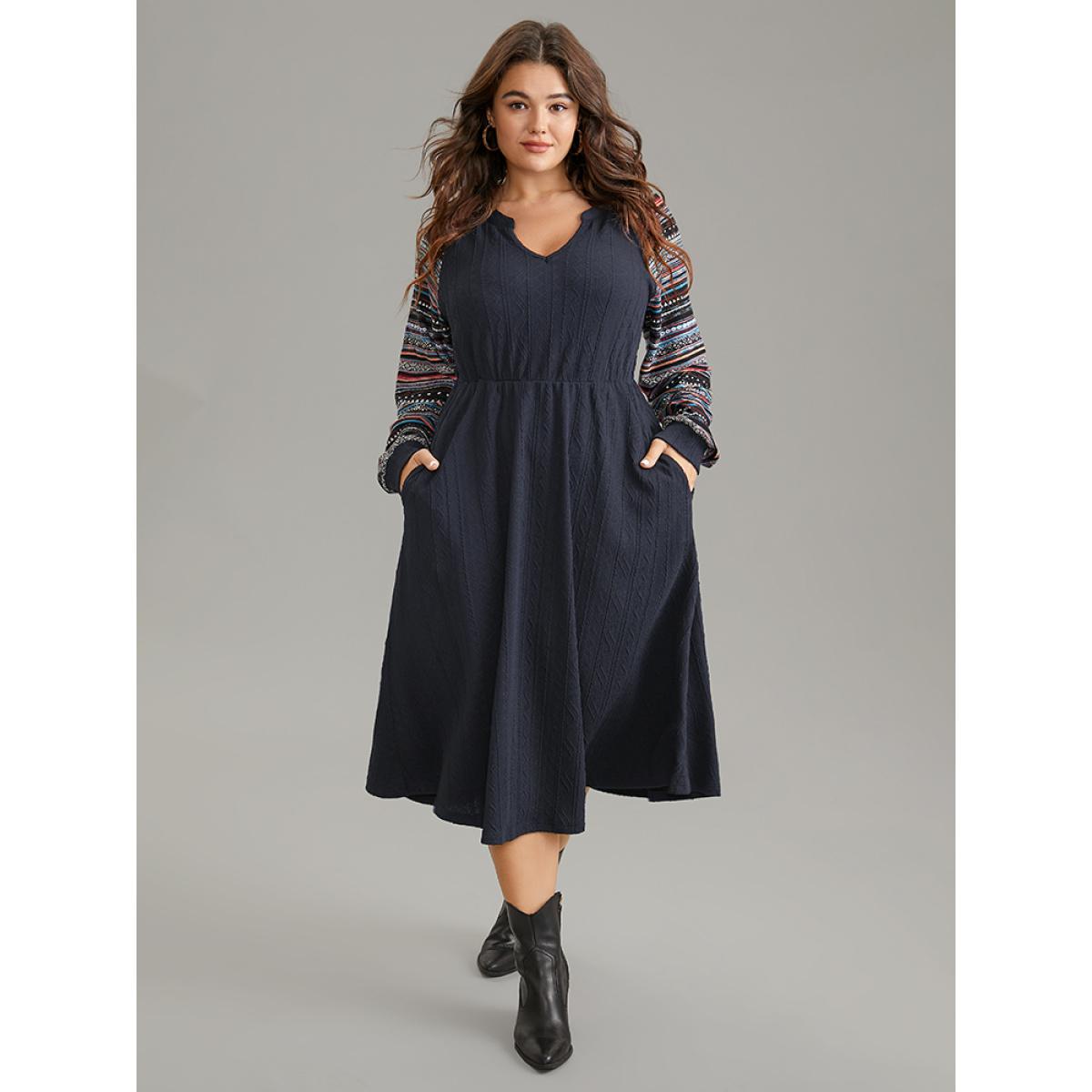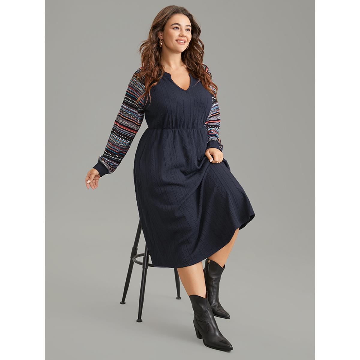 Plus Size Bandana Patchwork Elastic Waist Notched Dress Navy Women Casual Printed Notched collar Long Sleeve Curvy Midi Dress BloomChic 14-16/1X