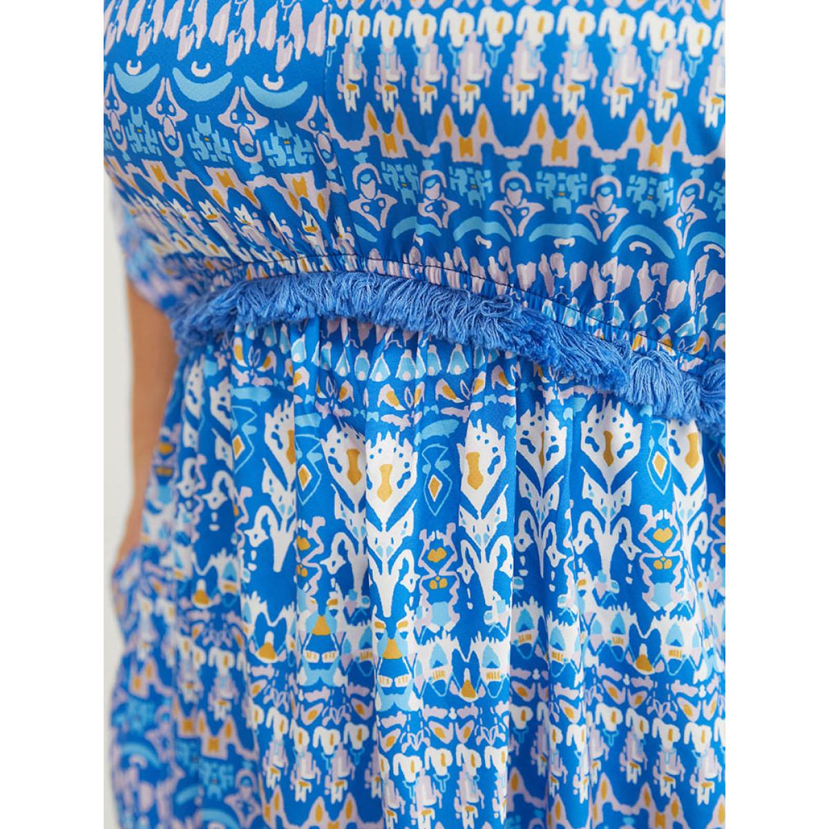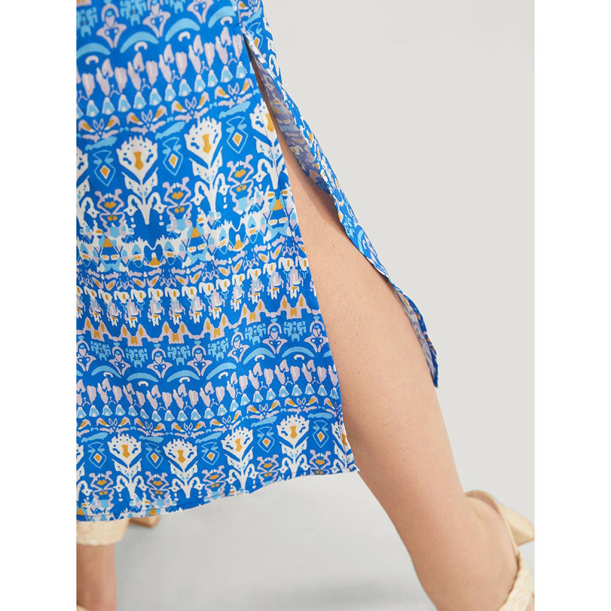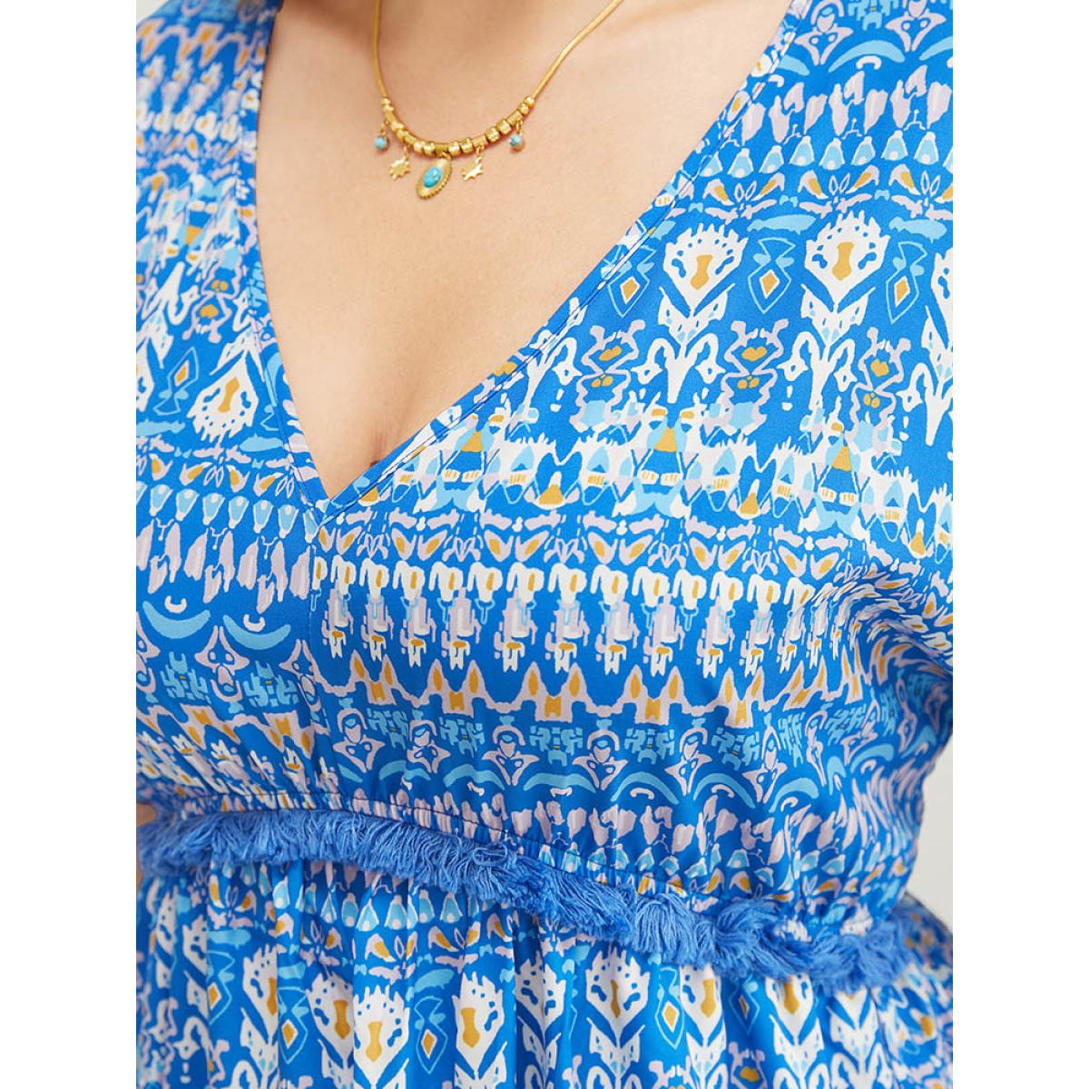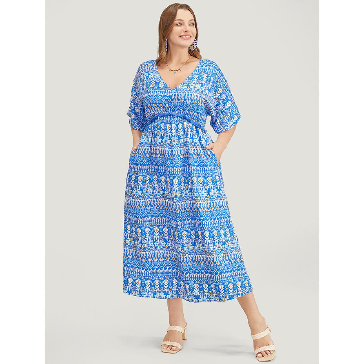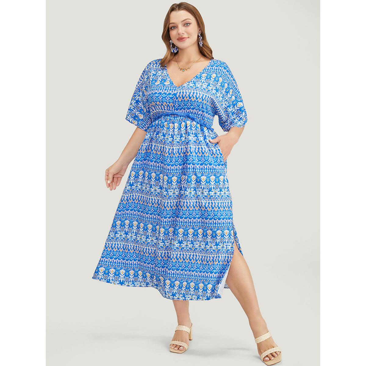 Plus Size Bandana Print Dolman Sleeve Knot Fringe Trim Split Dress Blue Women Vacation Tassels V-neck Short sleeve Curvy Midi Dress BloomChic 26/4X
