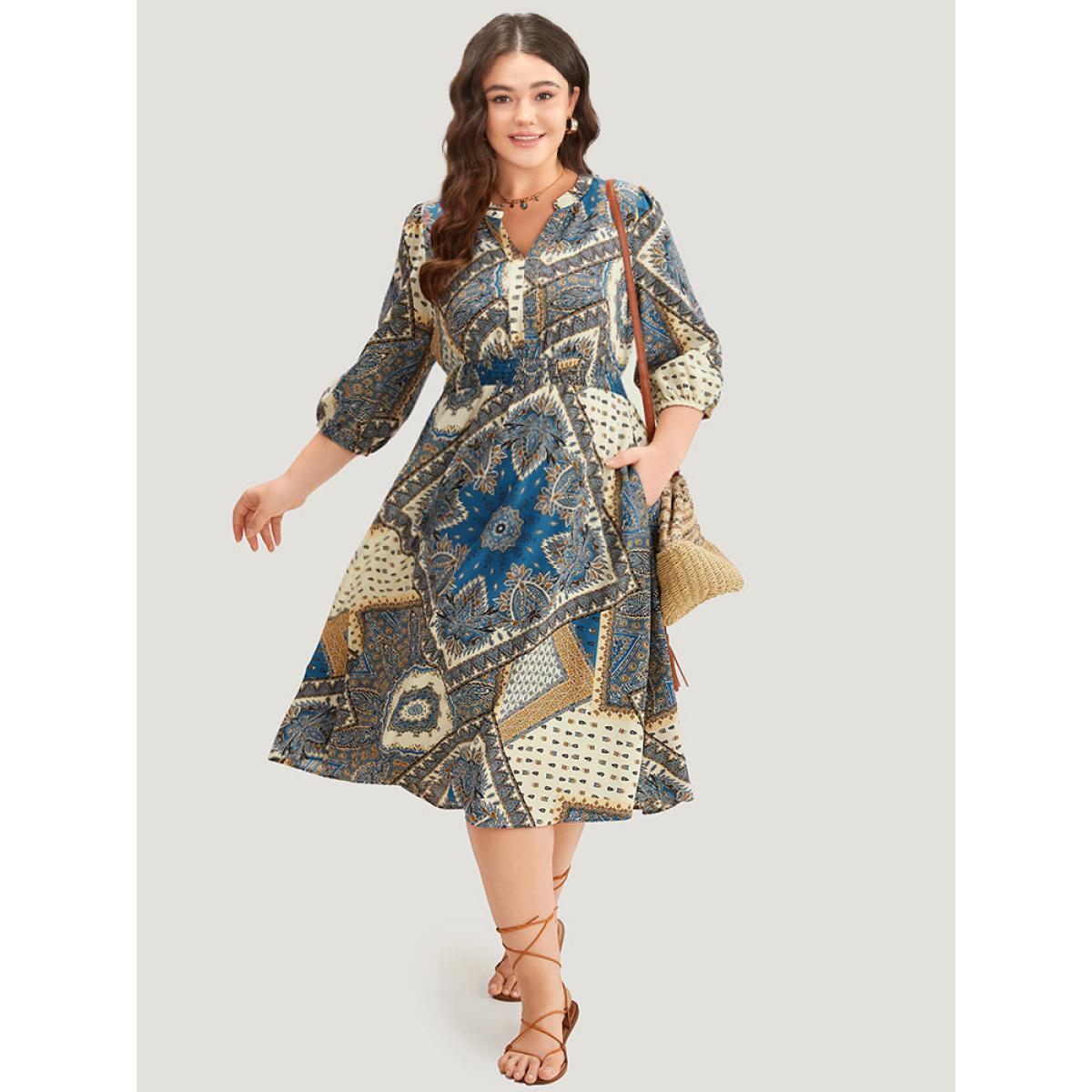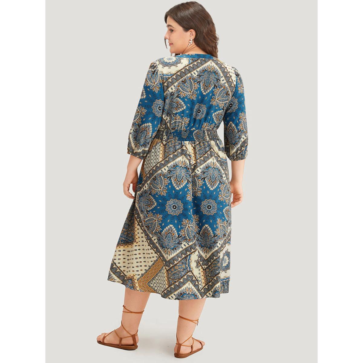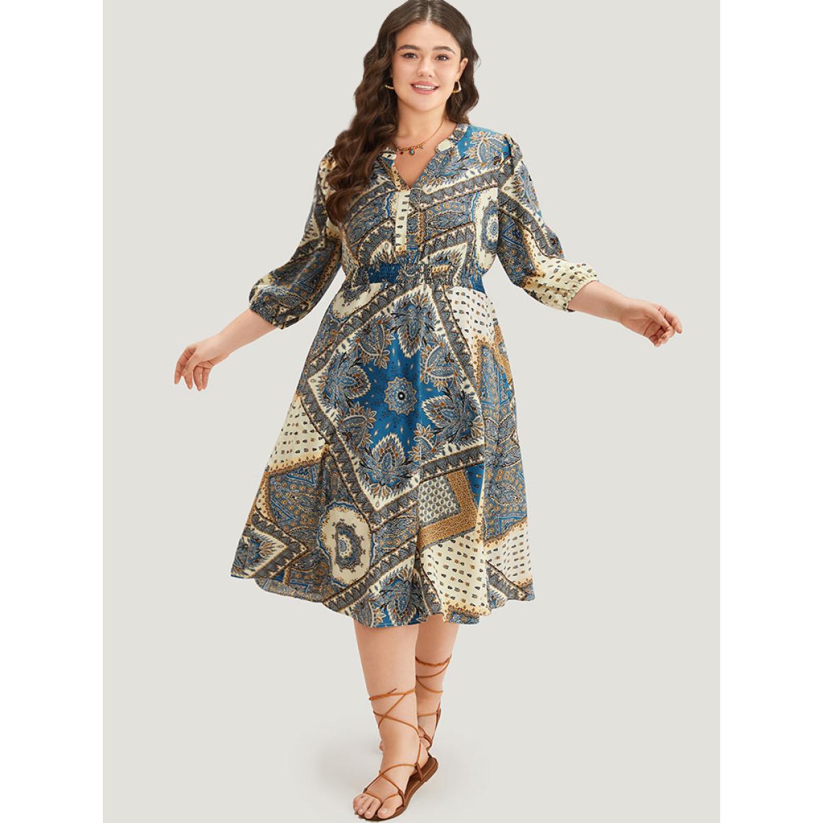 Plus Size Bandana Print Notched Lantern Sleeve Dress Cerulean Women Vacation Elastic cuffs Notched collar Elbow-length sleeve Curvy Midi Dress BloomChic 26/4X