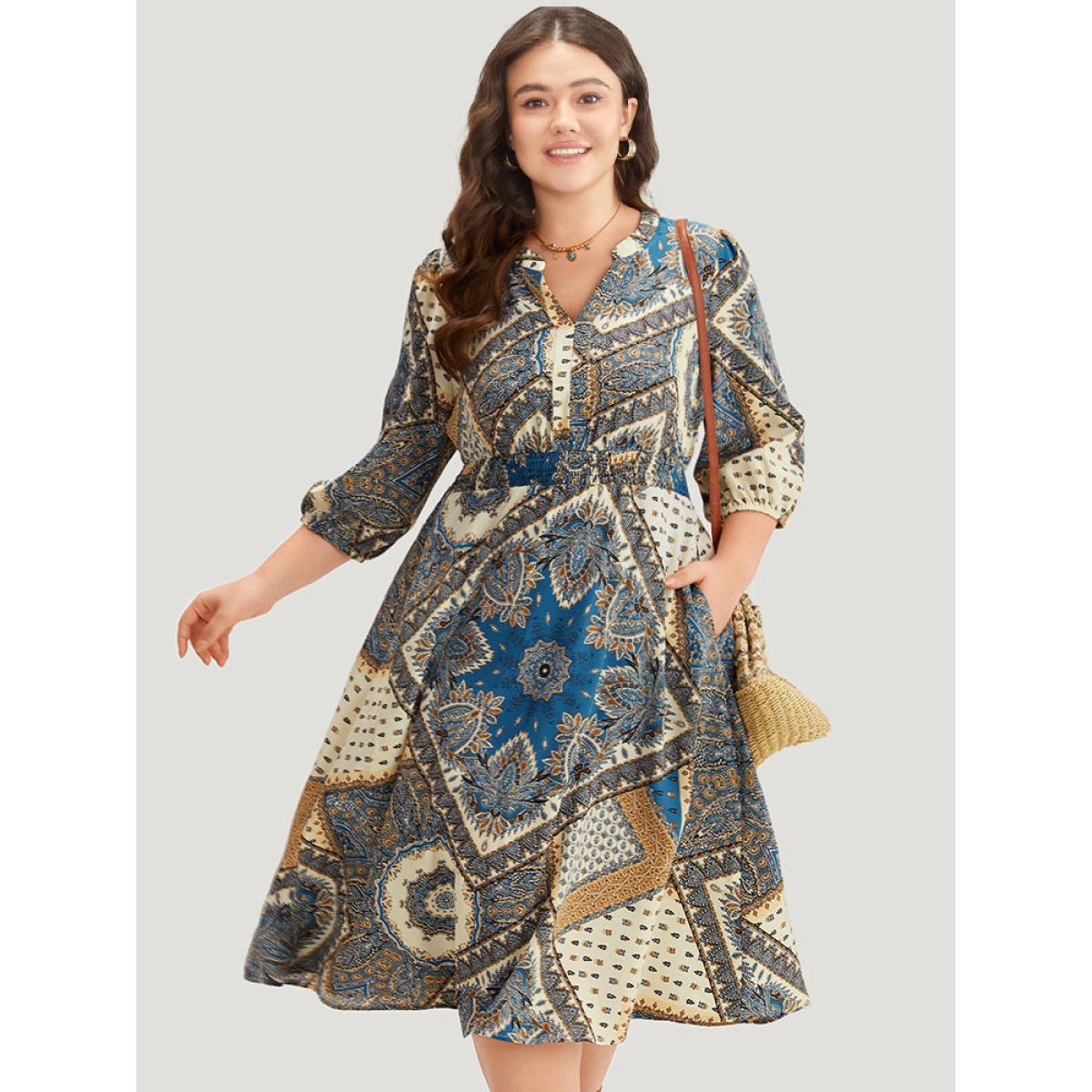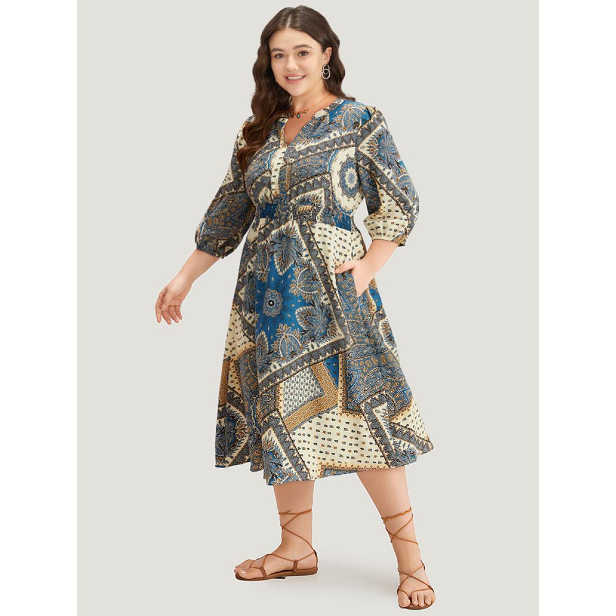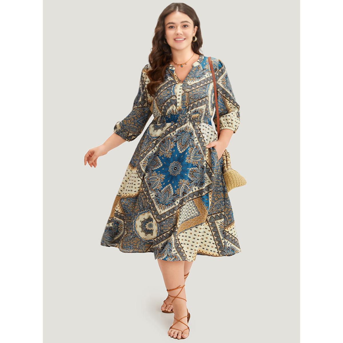 Plus Size Bandana Print Notched Lantern Sleeve Dress Cerulean Women Vacation Elastic cuffs Notched collar Elbow-length sleeve Curvy Midi Dress BloomChic 26/4X